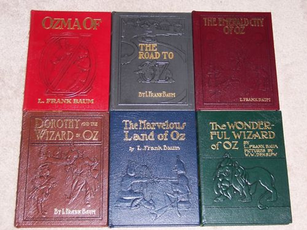 leather-bound heirloom edition Easton Press THE WIZARD OF OZ COLLECTION in 6 volumes by L Frank Baum Illustrated with frontispiece in color Multi-color uniform leather binding embossed picture on the front hardcover featuring spectacular reproductions of the artwork and cover designs from the extremely rare First Editions Current market price goes as high as $950, do not miss out this good deal Copyright by The Easton Press hubbed spine, bound in premium full leathers distinctive cover design, beautiful illustrations handsome, readable typefaces, permanent satin ribbon page marker elegant gilded page edges, endsheets of rich moire fabric thread-sewn pages for durability and strength, long-lasting high quality, acid-neutral paper LIST OF TITLES: a series in 6 volumes: 1. The Wonderful Wizard of Oz, pictures by W W Denslow 2.The Marvelous Land of Oz, pictures by John R. Neill 3. Dorothy and the Wizard of Oz, illustrated by John R. Neill 4. The Emerald City of Oz, illustrated by John R. Neill 5. Ozma of Oz, illustrated by John R. Neill 6. The Road to Oz, illustrated by John R. Neill CONDITION DESCRIPTION: Near fine and unread condition, binding is tight and gold page edging still shiny, beautiful bright endleaves and satin ribbon page marker. This set could be a precious addition to your family library. SHIPPING / HANDLING: Book(s) will be handled/packed very safely, and shipped via USPS media mail with delivery confirmation.
