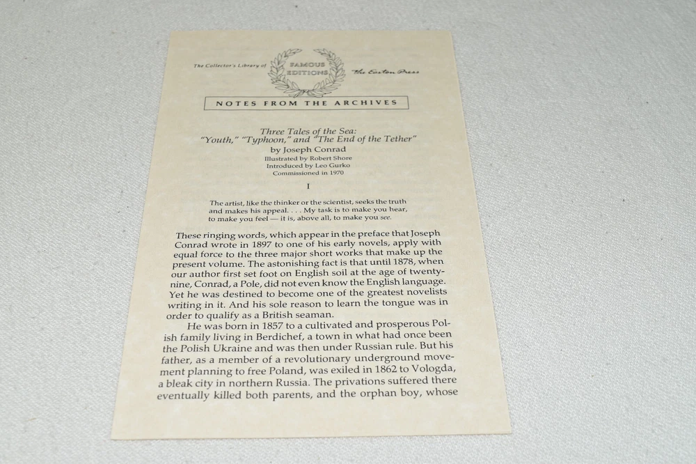 From the Easton Press Library of Famous Editions Collection... Three Tales of the Sea: Youth: A Narrative Typhoon The End of the Tether by Joseph Conrad Introduced by Leo Gurko Illustrated by Robert Shore Copyright 1996 by The Easton Press Bound in Premium Full Leather This volume contains all of the classic Easton Press trimmings: Premium Leather Silk Moire Endleaves Distinctive Cover Design Hubbed Spine, Accented in Real 22KT Gold Satin Ribbon Page Marker Gilded Page Edges Long-lasting, High Quality Acid-neutral Paper Smyth-sewn Pages for Strength and Durability Beautiful Illustrations A very scarce title in any condition, this volume is in Fine condition. The front and back covers are both in terrific condition and the gilded page edges show minor wear (see pictures of all edges). There is no markings, bookplates, or other signs of prior ownership in this book. This book is part of the Library of Famous Editions Collection published by Easton Press and would be a beautiful addition to your Easton Press collection. Hopefully you can add this book to your collection and enjoy it in the years to come... Please Email Me With Any Questions You Might Have! Shipping Info: Buyer to Pay Shipping and Handling International Bidders Pay Extra Shipping Seller Not Responsible For Uninsured Items Lost or Damaged in Mail Forms of Payment Accepted: Paypal Good luck and happy bidding! Powered by eBay Turbo Lister The free listing tool. List your items fast and easy and manage your active items.