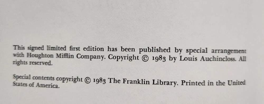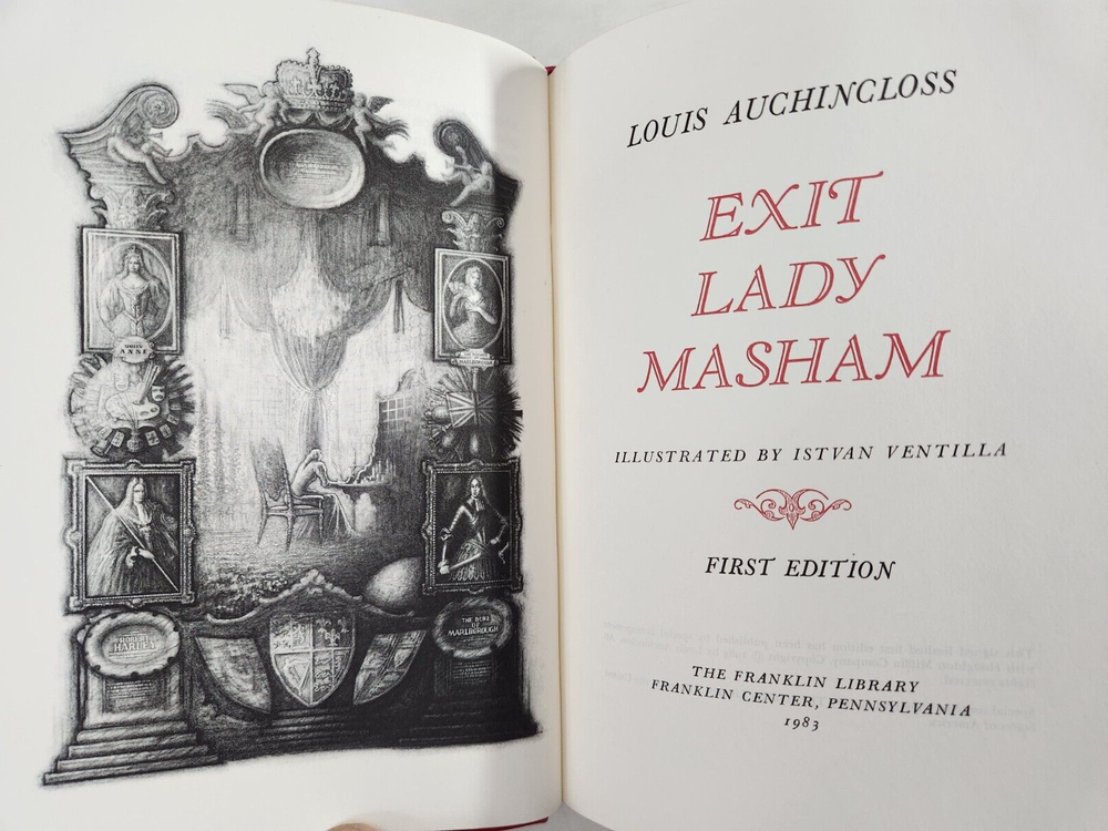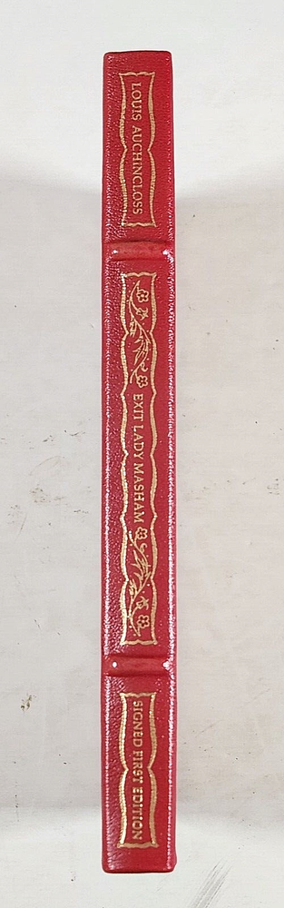 From the Franklin Library Collection. CONDITION NEW Exit Lady Masham: by, Louis Auchincloss. Franklin Library. SIGNED Illustrator, Istvan Ventilla 1st Edition 1983 174 pages A poor woman joins the eighteenth-century court of Queen Anne and ends a war.On the Continent, John Churchill, Duke of Marlborough, is laying waste to the lowlands in a bloody combat with Louis XIV. Meanwhile at the British court, Queen Anne, aging, ill, and surrounded by sycophants, is coping with the intrigues of those who wish to promote Marlborough’s dangerous ambitions. Chief among the plotters is his headstrong wife (and court favorite), Sarah Churchill. Into this tense and steamy environment comes young Abigail Hill, Sarah’s impoverished cousin. Sarah has arranged for her to be a maid to the Queen. But Abigail will discover that she has been marked by destiny for a special mission, which is nothing less than to bring to a halt a destructive world war. How she accomplishes this is the subject of this unusual but historically justified tale . . . The drama of court life and high politics, the growing antagonism between Sarah and Abigail, and an engaging cast of characters make for a lively narrative. And the portrait of Queen Anne is a tour de force that lends further depth to this vivid and engaging book. Gilt page edges Silk Endpapers Raised Bands Satin Bookmark Ribbon Accented in 22kt gold The Signed First Edition Society Full Leather-bound Terminology that may be used in this description: Bookplate: Highly sought after by some collectors, a book plate is an inscribed or decorative device that identifies the owner, or former owner, of a book. Most often bookplates are affixed to the endpaper of a book. Bump: Indicates that the affected part of the book has been impacted in such a way so as to cause a flattening, indention, or light bending. Deckle Edge: Deckle edge is the feathered edge of a page. Traditionally and historically, this was a side effect of the process of making paper. Dust Jacket: Sometimes used as another term for dust jacket, a protective and often decorative wrapper, usually made of paper which wraps around the binding of a book Ex-library: A former library book, generally containing library acquisition and ownership stamped Markings, and other typical indications of the library's use. Foxing: Or, Foxed is the age related browning, or brown-yellowish spots, that can occur to book paper over time. When this aging process happens to the paper in a book it is referred to as "foxed". Remainder Mark: A remainder marked book is just that - a mark to the page edges of a book. This mark is placed on the page edges by a publisher as books are returned from bookstores or sold to discounters. Rubbing: Abrasion or wear to the surface. Usually used in reference to a book's boards or dust-jacket. Shelf Wear: (shelving wear) describes damage caused over time to a book by placing and removing a book from a shelf. Soiled: Generally, refers to minor discoloration or staining.