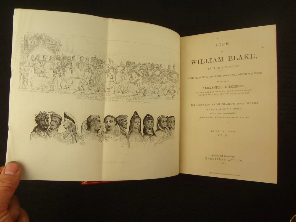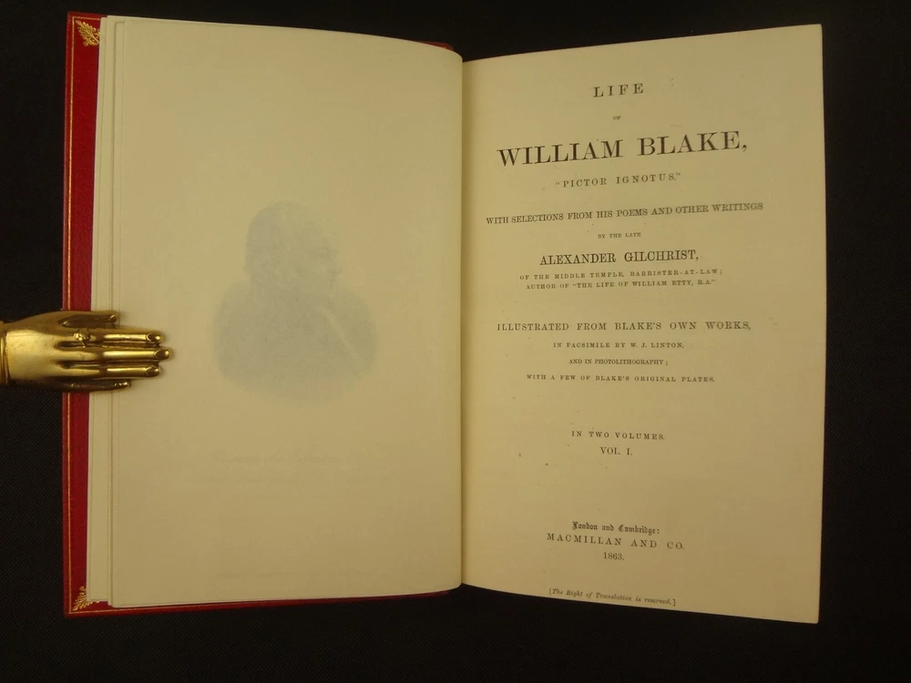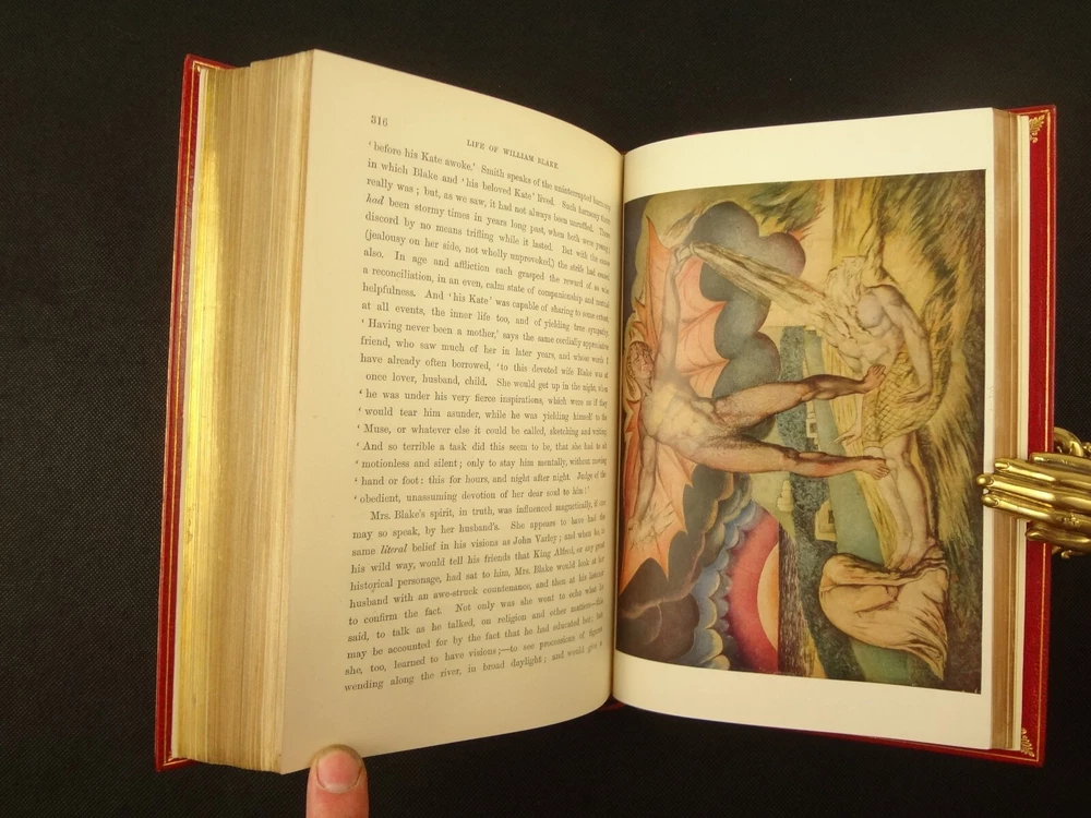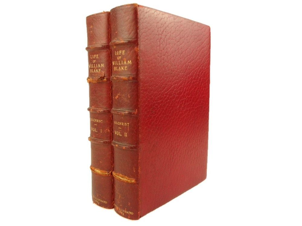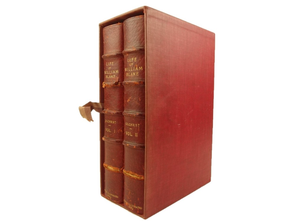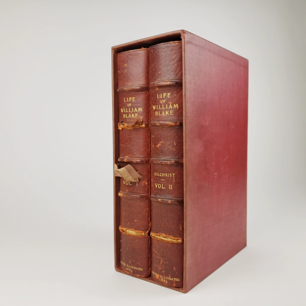 Extra-illustrated with 50 additional plates, this is the first edition of Alexander Gilchrist's Life of William Blake, "Pictor Ignotus". Per the Contents pages, the Songs of Innocence and Experience are "sixteen of the original plates". A hand-written note at the front states that there are 50 extra plates; I have provided a breakdown of those plates below. Regarding these plates, I don't see impression marks, so while they are well executed, I do believe that they are produced via photo-lithographs (or some similar technique) and not from the original blocks. I suspect there is a book that was published in the early 1900s that produced these 50 illustrations, but I have been unable to find which one that is. The spines are damaged, but once removed from the slipcase, the bindings are handsome fine-binding, stamp signed by Bayntun bindery in Bath, England. About William Blake - William Blake (1757 –1827) was an English poet, painter, and printmaker. Largely unrecognised during his life, Blake is now considered a seminal figure in the history of the poetry and visual art of the Romantic Age. What he called his "prophetic works" were said by 20th-century critic Northrop Frye to form "what is in proportion to its merits the least read body of poetry in the English language". His visual artistry led 21st-century critic Jonathan Jones to proclaim him "far and away the greatest artist Britain has ever produced". In 2002, Blake was placed at number 38 in the BBC's poll of the 100 Greatest Britons. While he lived in London his entire life, except for three years spent in Felpham, he produced a diverse and symbolically rich collection of works, which embraced the imagination as "human existence itself". - Wikipedia About the Life of William Blake - Alexander Gilchrist (1828 – 1861), an English author, is known mainly as a biographer of William Etty and of William Blake. Gilchrist's biography of Blake is still a standard reference work about the poet. Although he studied law, Gilchrist adopted literary and art criticism as his main pursuits. In 1856 he became a next-door neighbor of his friend Thomas Carlyle at Chelsea and his wife Jane Welsh Carlyle, both of them notable writers. Gilchrist had all but finished his Life of William Blake when he contracted scarlet fever from one of his children and died. His wife Anne helped to complete the Life (his magnum opus). Dante Gabriel Rossetti also contributed to the completion of the book. Bibliographic Details - Worldcat OCLC record number 1396704785. Notes that the preface is signed "Anne Gilchrist". Not a rare book, when not extra-illustrated. 1st edition. Re-issued in 1880. Physical Attributes - 2 volumes, finely bound, in a slipcase. Each volume measures approx. 22.5 x 15 x 3.5 cm, quarto. Red calf bindings. Spine with five raised bands; "Life of William Blake" in gilt in one compartment, volume in gilt in one compartment, and "Extra Illustrated 1863" in gilt at base of spine. Marbled endpaper. Leather hinges. Turn-ins framing endpaper, stamped by binder, and with a frame of gilt fillet with corner florets. Extra illustrated. List of plates - Below is a list of the plates in this set. While many of them have a tissue with a title printed on them, some of them do not; for the plates with no tissue, I made up a description and these are not the true names of the works. Plates that are not extra-illustrated: plates called out at Volume 1 in “Directions to Binder” – Frontis portrait, Job plates 8 and 14 at page 4, Plague at 54, Albion’s Angel at 112, From Europe at 126, Spider’s Web at 129, Jerusalem at 182, By Satan’s Watch-Fiends and The Crucifixion at 194, Canterbury at 230 (but used as frontis of V2 here), Job Plate V at 286 Frontis 4 – Job 8, Job 14 4 – Fire! 1 and 2 12 – God 28 – Gates Paradise 36 – Gates Paradise 50 – God Creating 54 - Plague 58 - Bank of the Thames 76 – Dante Degli Abati in the Lake 80 – Job Restored 90 – 2 woodcuts from Eclogue 110 – 2 woodcuts from Eclogue 112 – Albion’s Angel 115 – 2 Eclogue 120 – 2 Eclogue 127 – From Europe 128 – Title page Los 128 – Spider Web 128 – Children guiding serpent 130 – color man water 138 – color angel woman baby 166 – color rainbow woman 182 – From Jerusalem 182 – Jerusalem page 39 194 – From Jerusalem 202 – Bath Canterbury York 216 – Jesus on Lamb 234 – Zacharias’ Angel 260 – Creating Adam 272 – 2 Eclogues 275 – Paradise Regained 286 – Job V 292 – Christ’s Dream 316 – Pouring a cup on a man Volume 2 Foldout – Canterbury Pilgrims 4 – Los Enitharmon and Orc – Los Bound with the Chain of Jealousy 16 – Fire 32 – Man Woman Flower 50 – Holy Thursday 52 – Emanation Jerusalem 64 – Paola Francesca 74 – Man above well 98 – Jerusalem Chapter 3 110 – Title Night the Third 114 – Jurizen 126 – Pity 138 – Floating woman and baby 144 – noses pointing 158 – Foreboding man with bell 160 – Heaven to Hell 182 – Paradise Regained, Christ ministered by Angels 185 – Chained woman in wave 192 – Albion contemplating Jesus 206 – Annihilate Jerusalem 217 – Philippa 224 – Albion 232 – Oragon Woman 240 – Jerusalem page 46 254 – Albion turning from daughters 260 – Limbs of Albion Book of Job – page 1-21 Songs of Innocence (page 6 misnumbered 9), 1-16 Condition - See pictures. Spines are in rough condition, which also made the joints tender. But the boards, text-blocks, etc. were very well protected by the slipcase and are nice. There's a few spots, a dog-eared page (182), the fore-edges of the Canterbury plate are folded back, etc. but mostly the text block is very clean and the paper is quite bright, the edge gilt bright as well.