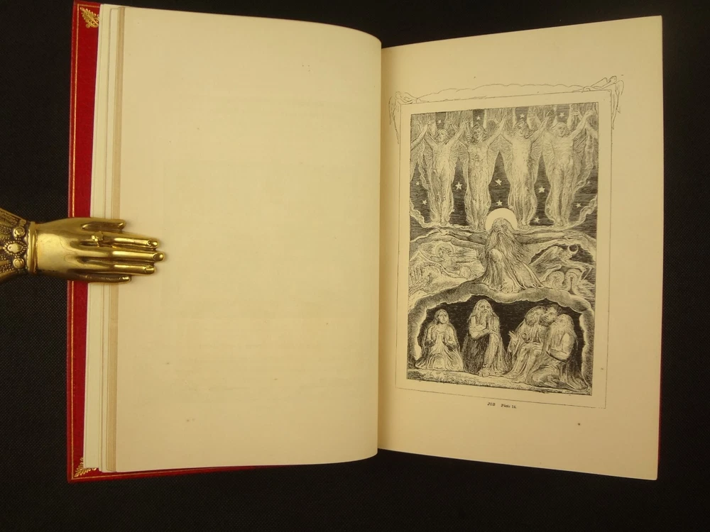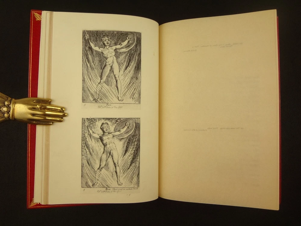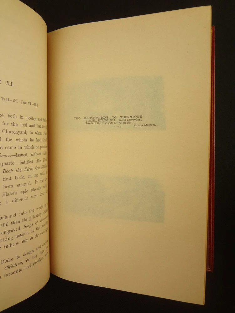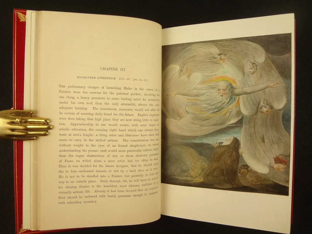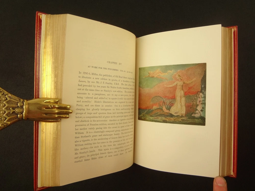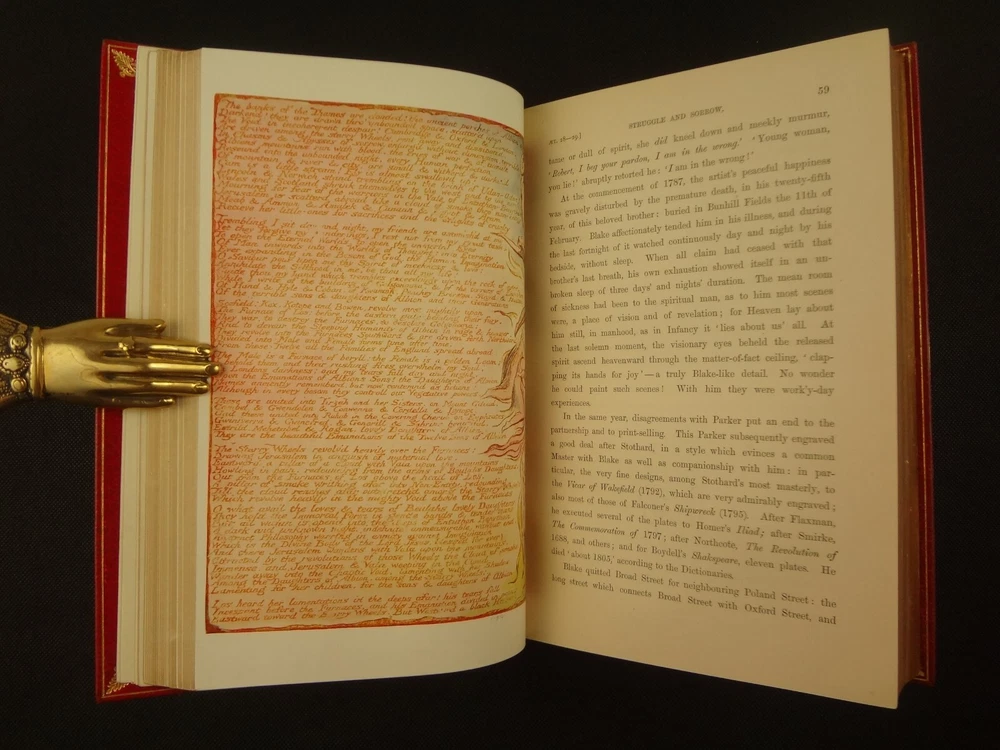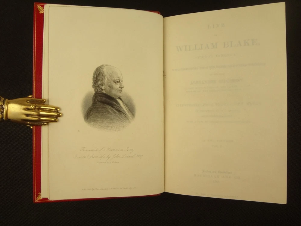 Extra-illustrated with 50 additional plates, this is the first edition of Alexander Gilchrist's Life of William Blake, "Pictor Ignotus". Per the Contents pages, the Songs of Innocence and Experience are "sixteen of the original plates". A hand-written note at the front states that there are 50 extra plates; I have provided a breakdown of those plates below. Regarding these plates, I don't see impression marks, so while they are well executed, I do believe that they are produced via photo-lithographs (or some similar technique) and not from the original blocks. I suspect there is a book that was published in the early 1900s that produced these 50 illustrations, but I have been unable to find which one that is. The spines are damaged, but once removed from the slipcase, the bindings are handsome fine-binding, stamp signed by Bayntun bindery in Bath, England. About William Blake - William Blake (1757 –1827) was an English poet, painter, and printmaker. Largely unrecognised during his life, Blake is now considered a seminal figure in the history of the poetry and visual art of the Romantic Age. What he called his "prophetic works" were said by 20th-century critic Northrop Frye to form "what is in proportion to its merits the least read body of poetry in the English language". His visual artistry led 21st-century critic Jonathan Jones to proclaim him "far and away the greatest artist Britain has ever produced". In 2002, Blake was placed at number 38 in the BBC's poll of the 100 Greatest Britons. While he lived in London his entire life, except for three years spent in Felpham, he produced a diverse and symbolically rich collection of works, which embraced the imagination as "human existence itself". - Wikipedia About the Life of William Blake - Alexander Gilchrist (1828 – 1861), an English author, is known mainly as a biographer of William Etty and of William Blake. Gilchrist's biography of Blake is still a standard reference work about the poet. Although he studied law, Gilchrist adopted literary and art criticism as his main pursuits. In 1856 he became a next-door neighbor of his friend Thomas Carlyle at Chelsea and his wife Jane Welsh Carlyle, both of them notable writers. Gilchrist had all but finished his Life of William Blake when he contracted scarlet fever from one of his children and died. His wife Anne helped to complete the Life (his magnum opus). Dante Gabriel Rossetti also contributed to the completion of the book. Bibliographic Details - Worldcat OCLC record number 1396704785. Notes that the preface is signed "Anne Gilchrist". Not a rare book, when not extra-illustrated. 1st edition. Re-issued in 1880. Physical Attributes - 2 volumes, finely bound, in a slipcase. Each volume measures approx. 22.5 x 15 x 3.5 cm, quarto. Red calf bindings. Spine with five raised bands; "Life of William Blake" in gilt in one compartment, volume in gilt in one compartment, and "Extra Illustrated 1863" in gilt at base of spine. Marbled endpaper. Leather hinges. Turn-ins framing endpaper, stamped by binder, and with a frame of gilt fillet with corner florets. Extra illustrated. List of plates - Below is a list of the plates in this set. While many of them have a tissue with a title printed on them, some of them do not; for the plates with no tissue, I made up a description and these are not the true names of the works. Plates that are not extra-illustrated: plates called out at Volume 1 in “Directions to Binder” – Frontis portrait, Job plates 8 and 14 at page 4, Plague at 54, Albion’s Angel at 112, From Europe at 126, Spider’s Web at 129, Jerusalem at 182, By Satan’s Watch-Fiends and The Crucifixion at 194, Canterbury at 230 (but used as frontis of V2 here), Job Plate V at 286 Frontis 4 – Job 8, Job 14 4 – Fire! 1 and 2 12 – God 28 – Gates Paradise 36 – Gates Paradise 50 – God Creating 54 - Plague 58 - Bank of the Thames 76 – Dante Degli Abati in the Lake 80 – Job Restored 90 – 2 woodcuts from Eclogue 110 – 2 woodcuts from Eclogue 112 – Albion’s Angel 115 – 2 Eclogue 120 – 2 Eclogue 127 – From Europe 128 – Title page Los 128 – Spider Web 128 – Children guiding serpent 130 – color man water 138 – color angel woman baby 166 – color rainbow woman 182 – From Jerusalem 182 – Jerusalem page 39 194 – From Jerusalem 202 – Bath Canterbury York 216 – Jesus on Lamb 234 – Zacharias’ Angel 260 – Creating Adam 272 – 2 Eclogues 275 – Paradise Regained 286 – Job V 292 – Christ’s Dream 316 – Pouring a cup on a man Volume 2 Foldout – Canterbury Pilgrims 4 – Los Enitharmon and Orc – Los Bound with the Chain of Jealousy 16 – Fire 32 – Man Woman Flower 50 – Holy Thursday 52 – Emanation Jerusalem 64 – Paola Francesca 74 – Man above well 98 – Jerusalem Chapter 3 110 – Title Night the Third 114 – Jurizen 126 – Pity 138 – Floating woman and baby 144 – noses pointing 158 – Foreboding man with bell 160 – Heaven to Hell 182 – Paradise Regained, Christ ministered by Angels 185 – Chained woman in wave 192 – Albion contemplating Jesus 206 – Annihilate Jerusalem 217 – Philippa 224 – Albion 232 – Oragon Woman 240 – Jerusalem page 46 254 – Albion turning from daughters 260 – Limbs of Albion Book of Job – page 1-21 Songs of Innocence (page 6 misnumbered 9), 1-16 Condition - See pictures. Spines are in rough condition, which also made the joints tender. But the boards, text-blocks, etc. were very well protected by the slipcase and are nice. There's a few spots, a dog-eared page (182), the fore-edges of the Canterbury plate are folded back, etc. but mostly the text block is very clean and the paper is quite bright, the edge gilt bright as well.