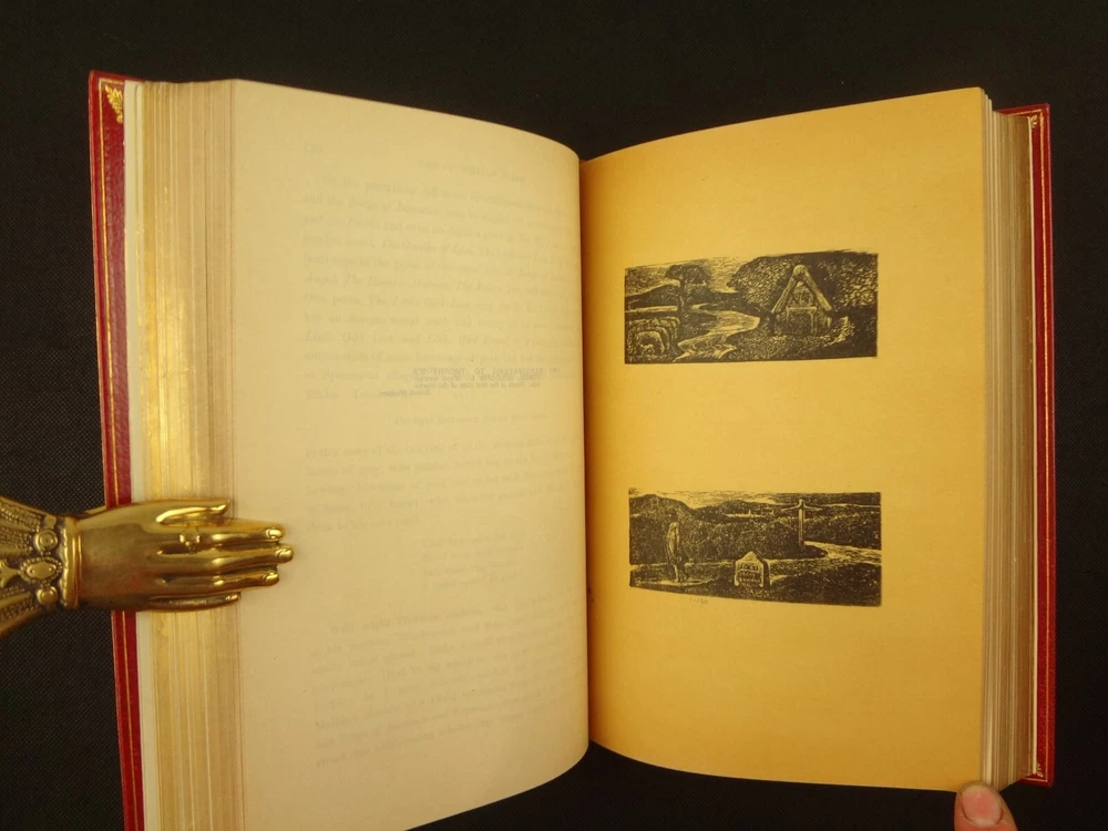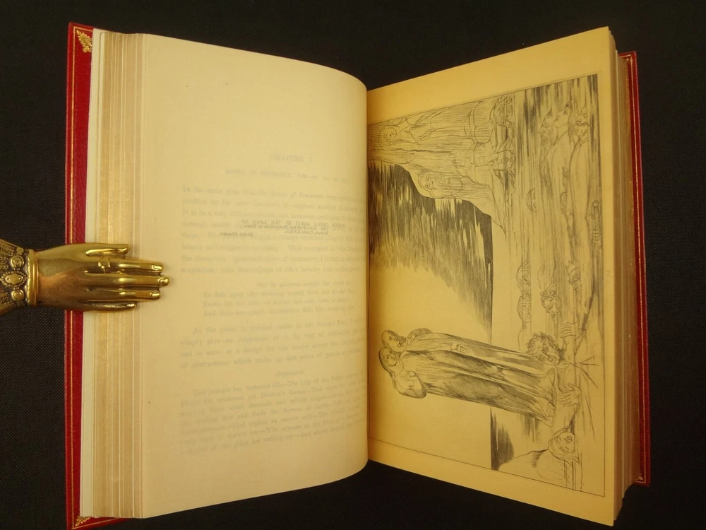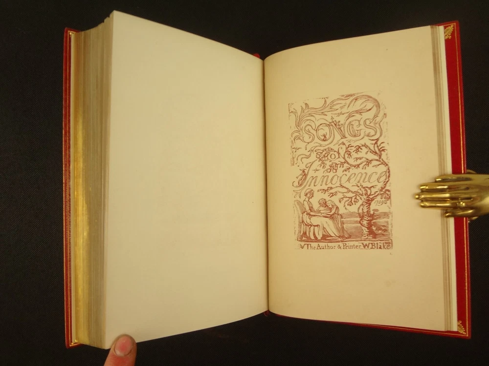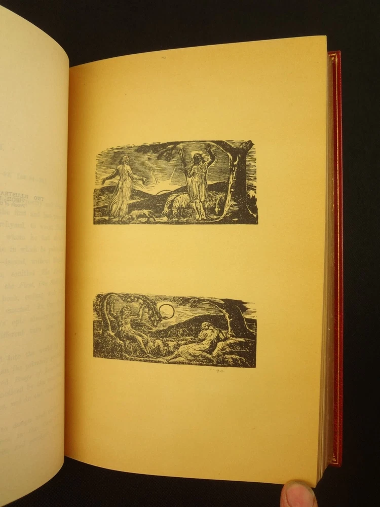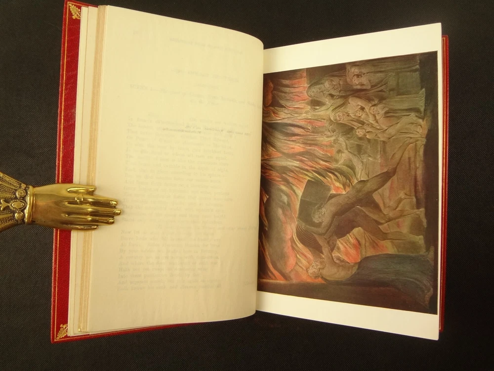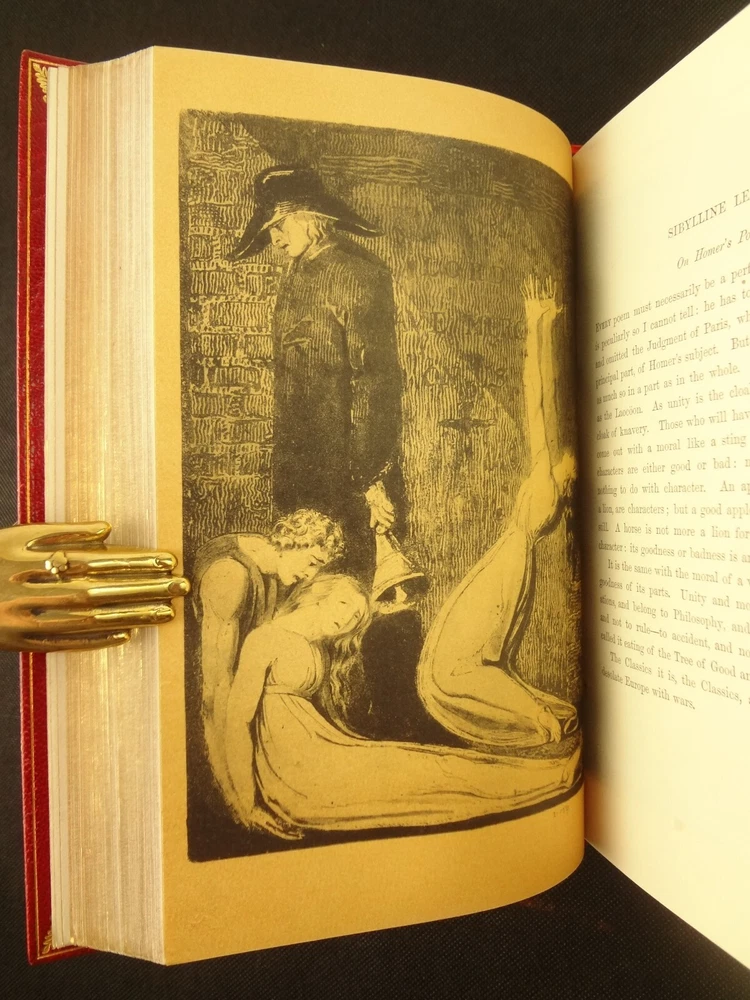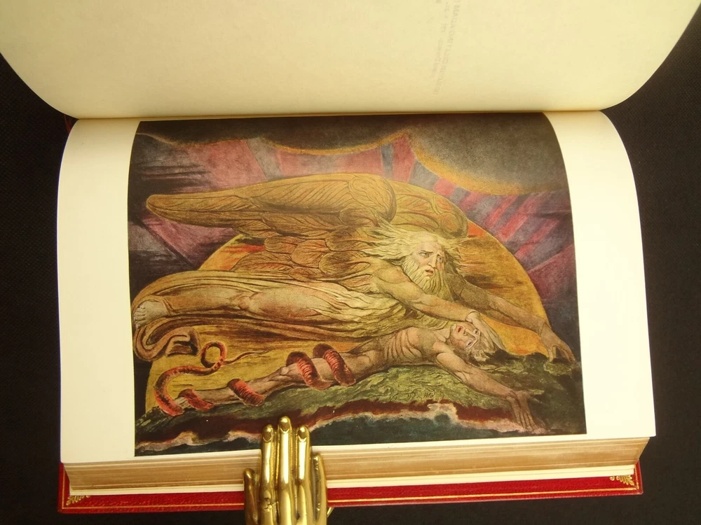 Extra-illustrated with 50 additional plates, this is the first edition of Alexander Gilchrist's Life of William Blake, "Pictor Ignotus". Per the Contents pages, the Songs of Innocence and Experience are "sixteen of the original plates". A hand-written note at the front states that there are 50 extra plates; I have provided a breakdown of those plates below. Regarding these plates, I don't see impression marks, so while they are well executed, I do believe that they are produced via photo-lithographs (or some similar technique) and not from the original blocks. I suspect there is a book that was published in the early 1900s that produced these 50 illustrations, but I have been unable to find which one that is. The spines are damaged, but once removed from the slipcase, the bindings are handsome fine-binding, stamp signed by Bayntun bindery in Bath, England. About William Blake - William Blake (1757 –1827) was an English poet, painter, and printmaker. Largely unrecognised during his life, Blake is now considered a seminal figure in the history of the poetry and visual art of the Romantic Age. What he called his "prophetic works" were said by 20th-century critic Northrop Frye to form "what is in proportion to its merits the least read body of poetry in the English language". His visual artistry led 21st-century critic Jonathan Jones to proclaim him "far and away the greatest artist Britain has ever produced". In 2002, Blake was placed at number 38 in the BBC's poll of the 100 Greatest Britons. While he lived in London his entire life, except for three years spent in Felpham, he produced a diverse and symbolically rich collection of works, which embraced the imagination as "human existence itself". - Wikipedia About the Life of William Blake - Alexander Gilchrist (1828 – 1861), an English author, is known mainly as a biographer of William Etty and of William Blake. Gilchrist's biography of Blake is still a standard reference work about the poet. Although he studied law, Gilchrist adopted literary and art criticism as his main pursuits. In 1856 he became a next-door neighbor of his friend Thomas Carlyle at Chelsea and his wife Jane Welsh Carlyle, both of them notable writers. Gilchrist had all but finished his Life of William Blake when he contracted scarlet fever from one of his children and died. His wife Anne helped to complete the Life (his magnum opus). Dante Gabriel Rossetti also contributed to the completion of the book. Bibliographic Details - Worldcat OCLC record number 1396704785. Notes that the preface is signed "Anne Gilchrist". Not a rare book, when not extra-illustrated. 1st edition. Re-issued in 1880. Physical Attributes - 2 volumes, finely bound, in a slipcase. Each volume measures approx. 22.5 x 15 x 3.5 cm, quarto. Red calf bindings. Spine with five raised bands; "Life of William Blake" in gilt in one compartment, volume in gilt in one compartment, and "Extra Illustrated 1863" in gilt at base of spine. Marbled endpaper. Leather hinges. Turn-ins framing endpaper, stamped by binder, and with a frame of gilt fillet with corner florets. Extra illustrated. List of plates - Below is a list of the plates in this set. While many of them have a tissue with a title printed on them, some of them do not; for the plates with no tissue, I made up a description and these are not the true names of the works. Plates that are not extra-illustrated: plates called out at Volume 1 in “Directions to Binder” – Frontis portrait, Job plates 8 and 14 at page 4, Plague at 54, Albion’s Angel at 112, From Europe at 126, Spider’s Web at 129, Jerusalem at 182, By Satan’s Watch-Fiends and The Crucifixion at 194, Canterbury at 230 (but used as frontis of V2 here), Job Plate V at 286 Frontis 4 – Job 8, Job 14 4 – Fire! 1 and 2 12 – God 28 – Gates Paradise 36 – Gates Paradise 50 – God Creating 54 - Plague 58 - Bank of the Thames 76 – Dante Degli Abati in the Lake 80 – Job Restored 90 – 2 woodcuts from Eclogue 110 – 2 woodcuts from Eclogue 112 – Albion’s Angel 115 – 2 Eclogue 120 – 2 Eclogue 127 – From Europe 128 – Title page Los 128 – Spider Web 128 – Children guiding serpent 130 – color man water 138 – color angel woman baby 166 – color rainbow woman 182 – From Jerusalem 182 – Jerusalem page 39 194 – From Jerusalem 202 – Bath Canterbury York 216 – Jesus on Lamb 234 – Zacharias’ Angel 260 – Creating Adam 272 – 2 Eclogues 275 – Paradise Regained 286 – Job V 292 – Christ’s Dream 316 – Pouring a cup on a man Volume 2 Foldout – Canterbury Pilgrims 4 – Los Enitharmon and Orc – Los Bound with the Chain of Jealousy 16 – Fire 32 – Man Woman Flower 50 – Holy Thursday 52 – Emanation Jerusalem 64 – Paola Francesca 74 – Man above well 98 – Jerusalem Chapter 3 110 – Title Night the Third 114 – Jurizen 126 – Pity 138 – Floating woman and baby 144 – noses pointing 158 – Foreboding man with bell 160 – Heaven to Hell 182 – Paradise Regained, Christ ministered by Angels 185 – Chained woman in wave 192 – Albion contemplating Jesus 206 – Annihilate Jerusalem 217 – Philippa 224 – Albion 232 – Oragon Woman 240 – Jerusalem page 46 254 – Albion turning from daughters 260 – Limbs of Albion Book of Job – page 1-21 Songs of Innocence (page 6 misnumbered 9), 1-16 Condition - See pictures. Spines are in rough condition, which also made the joints tender. But the boards, text-blocks, etc. were very well protected by the slipcase and are nice. There's a few spots, a dog-eared page (182), the fore-edges of the Canterbury plate are folded back, etc. but mostly the text block is very clean and the paper is quite bright, the edge gilt bright as well.