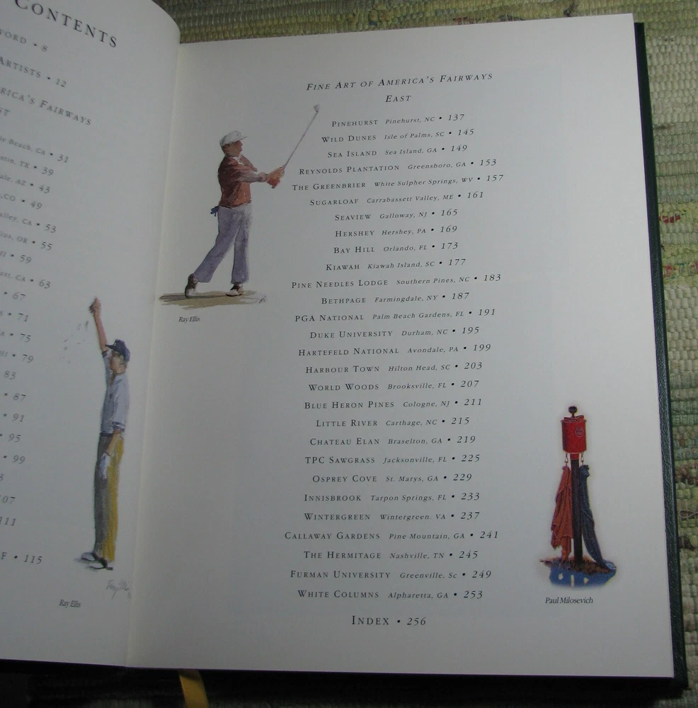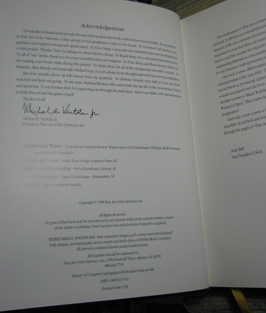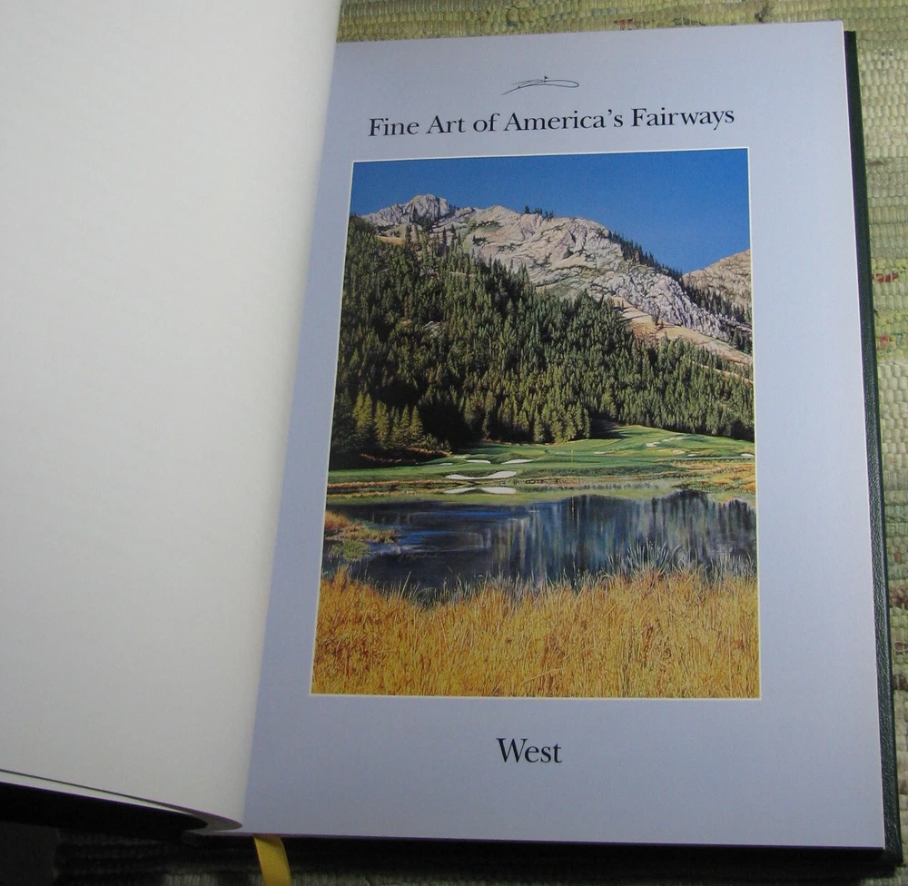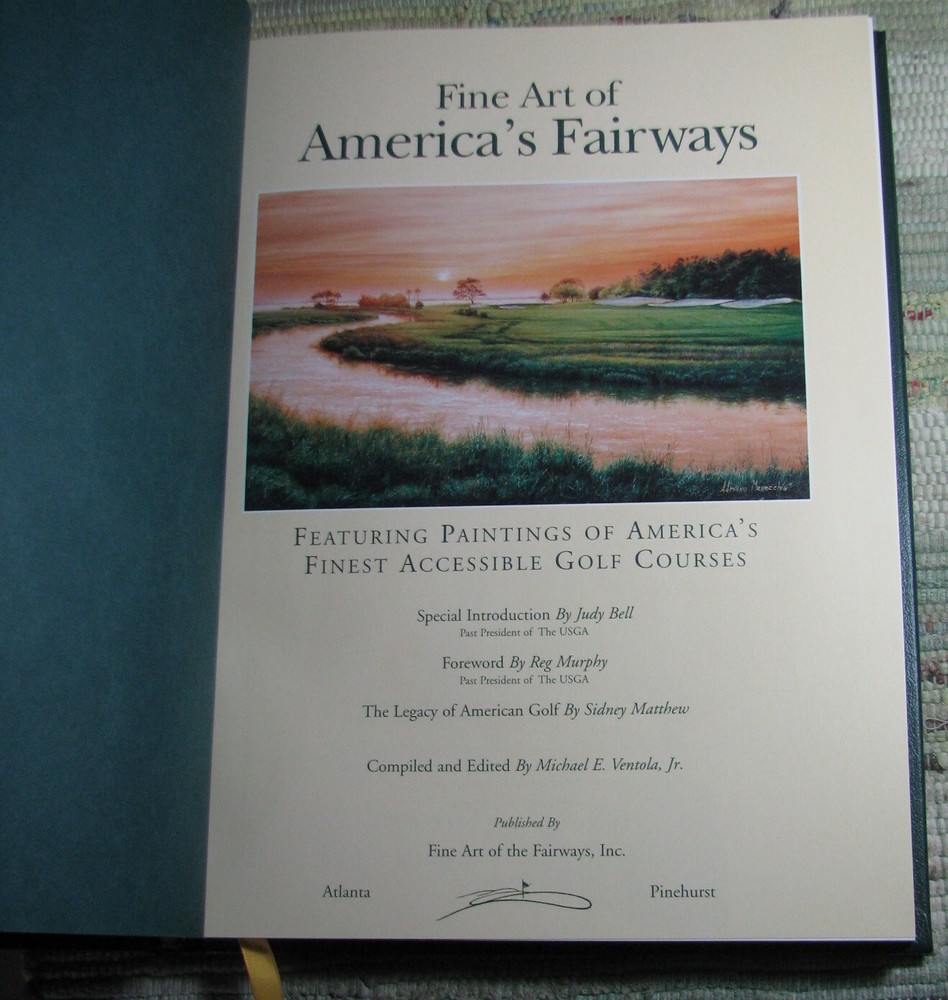 FINE ART OF AMERICA'S FAIRWAYS Finest Accessible Golf Courses 1998 Hardcover Featuring Painting of America's Finest Accessible Golf Courses Special Introduction by Judy Bell Forword by Reg Murphy The Legacy of American Golf by Sidney Matthew Compiled and Edited by Michael E. Ventola, Jr. Leather bound hardcover is in like new condition, lightly worn cover corners, clean text, tight binding, please see photos Published by Fine Art Of the Fairways, Inc., Huntcliff Trace, Pinehurst, Atlanta, 1998, 256 pages, illustrated 12 x 9 3/8 x 1 inches