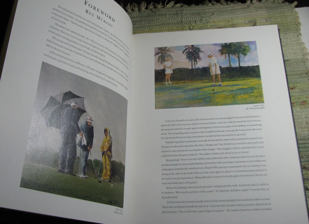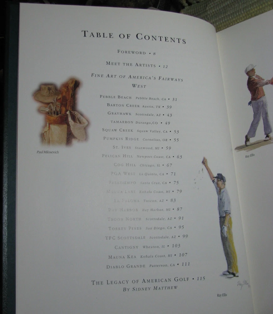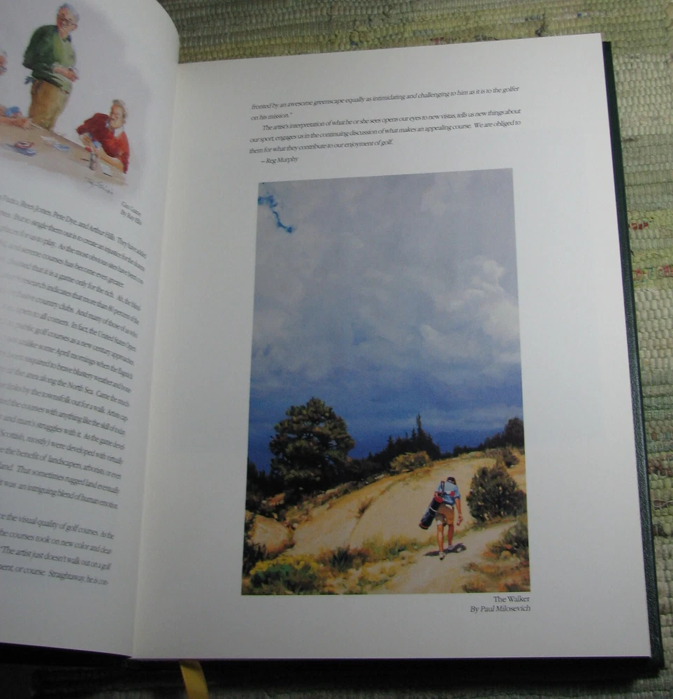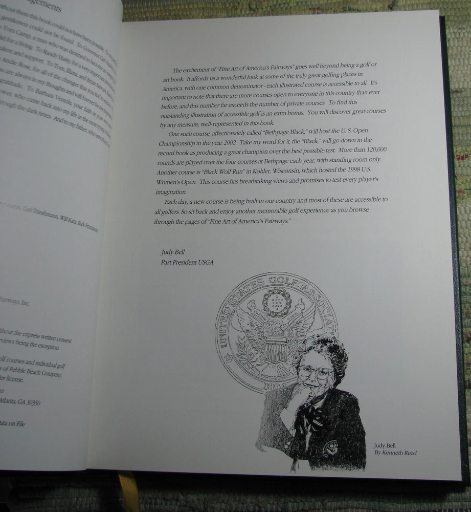 FINE ART OF AMERICA'S FAIRWAYS Finest Accessible Golf Courses 1998 Hardcover Featuring Painting of America's Finest Accessible Golf Courses Special Introduction by Judy Bell Forword by Reg Murphy The Legacy of American Golf by Sidney Matthew Compiled and Edited by Michael E. Ventola, Jr. Leather bound hardcover is in like new condition, lightly worn cover corners, clean text, tight binding, please see photos Published by Fine Art Of the Fairways, Inc., Huntcliff Trace, Pinehurst, Atlanta, 1998, 256 pages, illustrated 12 x 9 3/8 x 1 inches
