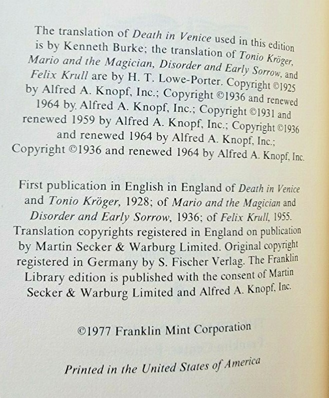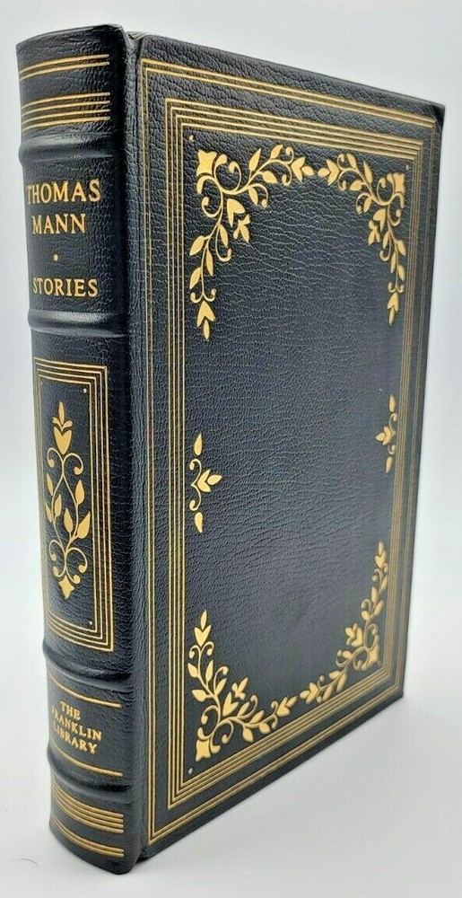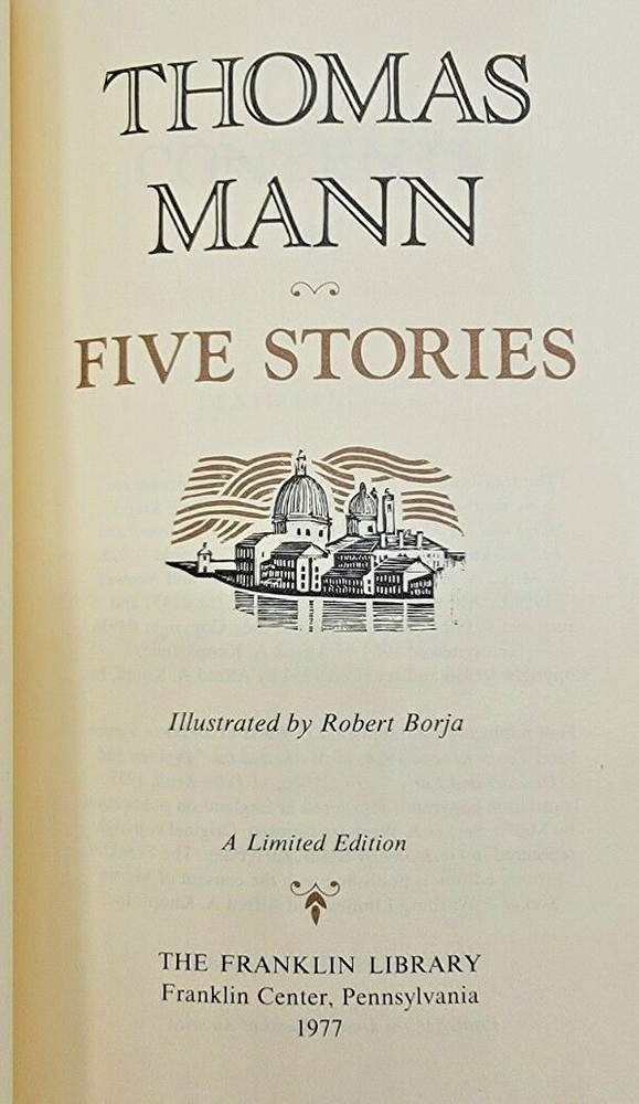 Five Stories by Thomas Mann Franklin Library Collection: The 100 Greatest Books of All Time Limited Edition 1st Edition thus Illustrated by Robert Borja Franklin, 1977. VG+. Raised bands, A Limited edition; full leather with gold lettering and designs; all edges gilt; silk moire endpapers; Illustrated. Light edge wear, mild gilt rubbing, top right front corner bumped lightly, surface flaws. Clean, no writing or marks on interior. A solid collectible copy.