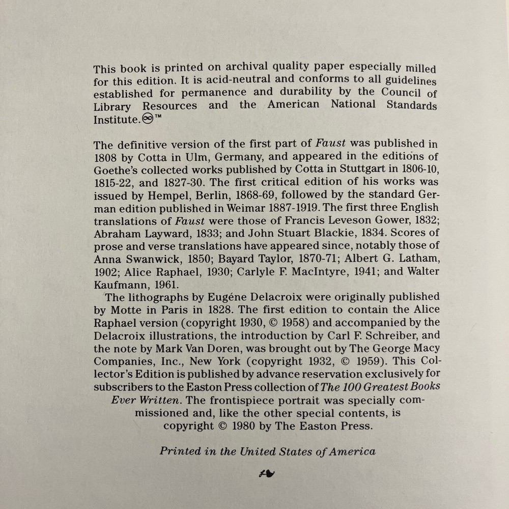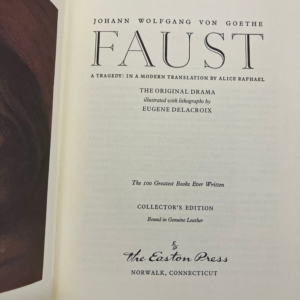 Faust by Johann Wolfgang von Goethe Easton Press 100 Greatest Books 1980 HC This is a used book with general edge and shelf wear, some fading to the covers and spotting on gilded page edges. Binding is intact, no writing, stains, or unusual smells. See pictures for overview of condition. We are BrightLight Books. We have sold tens of thousands of items online since 1998. Money Back Guaranteed! For Local Pickup in our Fern Park, FL store, please message us! 10-46 (5010702) 11/12/2024 AH