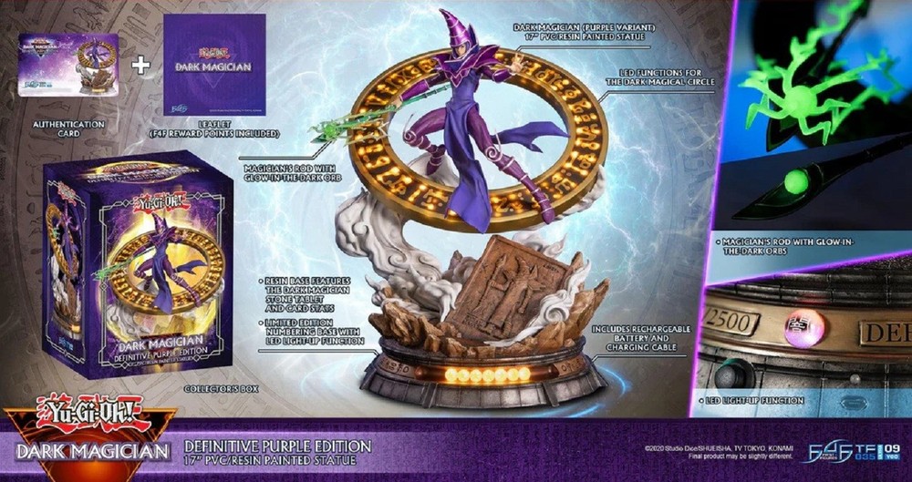 Galactic Toys Our eBay Store Follow my store! First 4 Figures Yu-Gi-Oh! Dark Magician Definitive Purple Edition Resin PVC Statue The statue's concept is inspired by one of Dark Magician's iconic summoning poses in the anime, where he's in this "ready for action" stance with the Dark Magical Circle in the background. He has his left arm stretched out and is wielding the Magician's Rod in his right hand, ready to cast his signature spell: Dark Magic Attack. The Definitive Edition of this statue comes with LED functionality for the Dark Magical Circle, as well as glow-in-the-dark attack effects on the Magician's Rod. Since the Dark Magician's origin story dates back to Ancient Egyptian times, we decided to design the base to reflect this aspect of Dark Magician, from the sandy and rocky environment atop the base to the hieroglyphic patterns on the side. And the base of the Definitive Edition is made out of resin and comes with bigger rock formations and a more intense summoning effect. [Size]: 16.5 (42cm) height, 13 (33cm) width, 15.8 (40cm) inches depth. Product Details Width 20.000 Height 20.000 Length 16.000 Manufacturer # YGODMPD UPC 5060316623640 Shipping & Order Information All items ship within 1 business day and ship using DHL Global Mail, USPS, or UPS Ground. The DHL service uses the United States Postal Service (USPS) to deliver packages. All items will be packaged with care and use proper padding and packing. International Shipping We ship international orders with tracking using DHL global mail. On orders above 40 USD we will upgrade to a faster DHL delivery service. Customers are responsible for duties and taxes in their country. We can't modify shipment values for custom purposes. Return Guidelines Please always contact us before making a return. Returns must be sent back to us using the same shipping format, protective packaging, original condition you received your item and include a tracking number. On orders that are unwanted, a 20% restock fee will apply. If you had FREE Shipping the original shipping cost will be deducted from your refund. Allow up to 3 Business Days for processing once we receive your return before being issued a refund. If a Return is being made from a mistake on our end contact us for individual instructions**