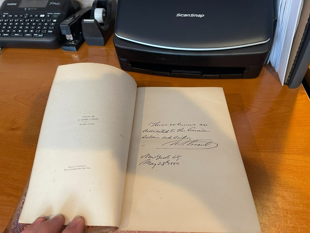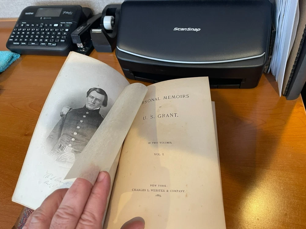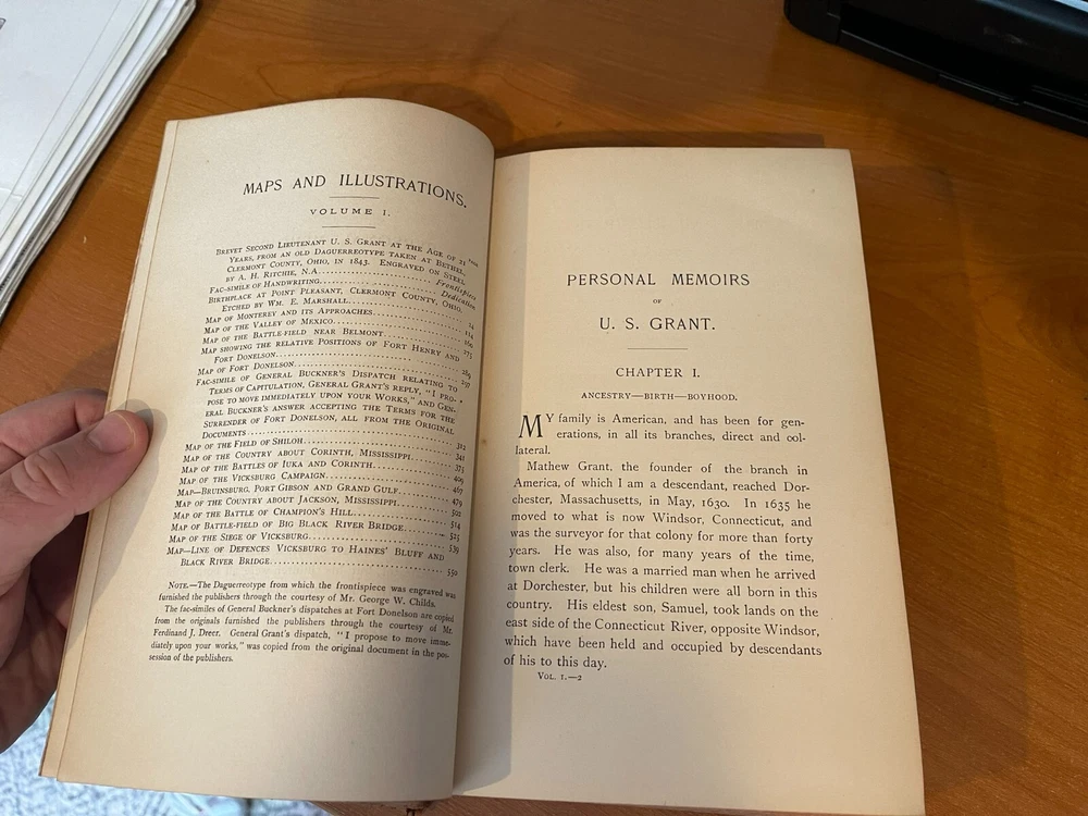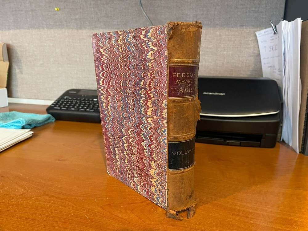 This is a rare first edition volume (Vol I only) leather book titled "Personal Memoirs of U.S. Grant," published in 1885 by Charles L. Webster & Company. The book shows wear on the spines and front cover (rear cover missing), but the pages are intact and legible inside complete with maps and illustrations. This is a valuable collector's item for history enthusiasts and book collectors in general!
