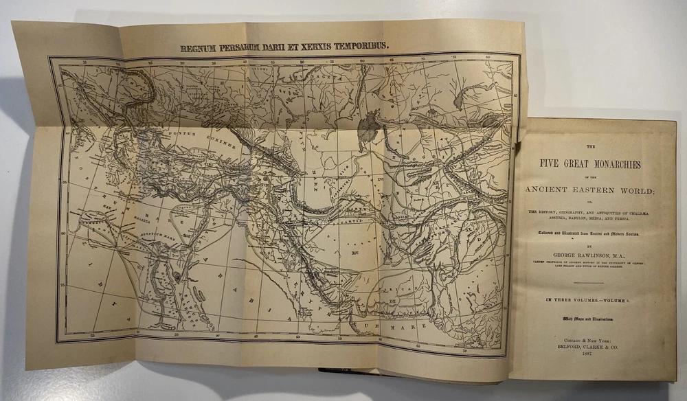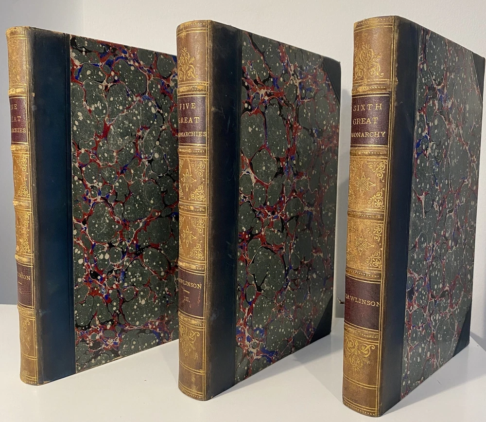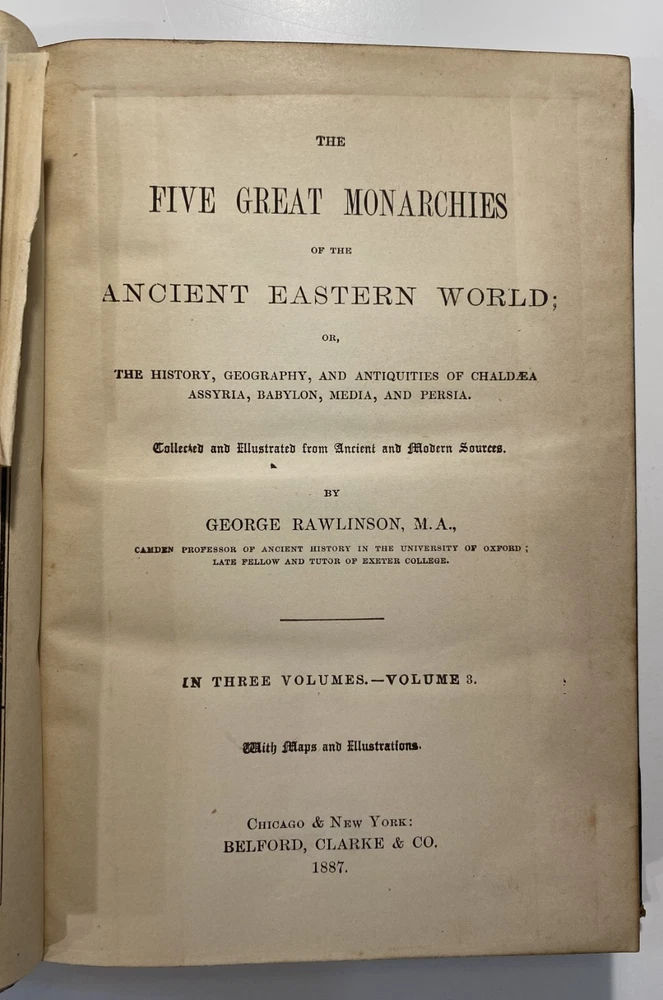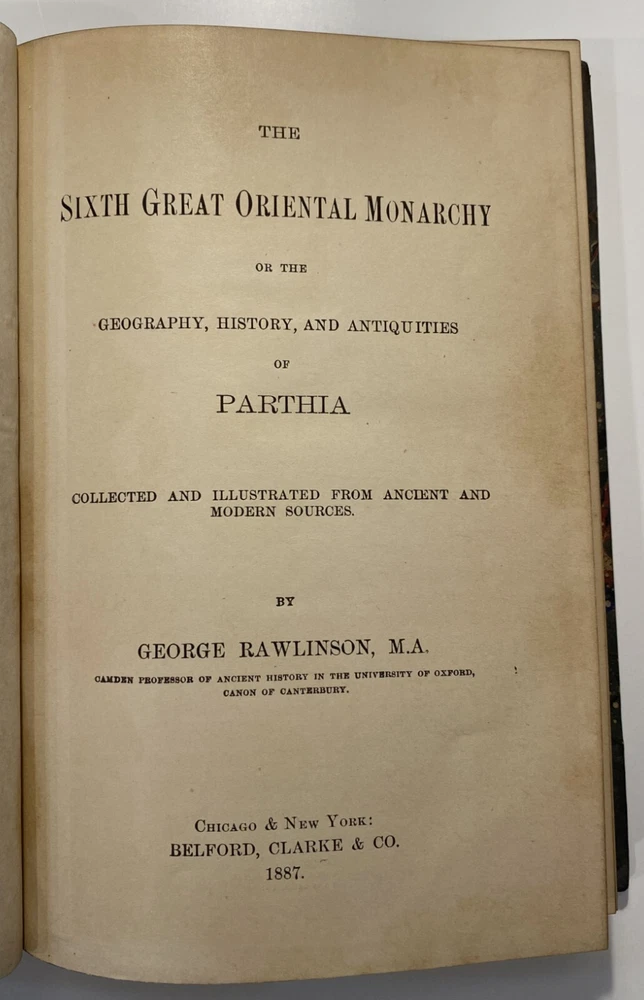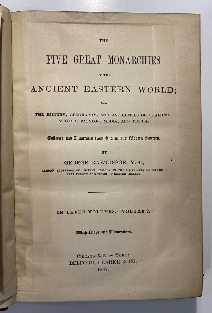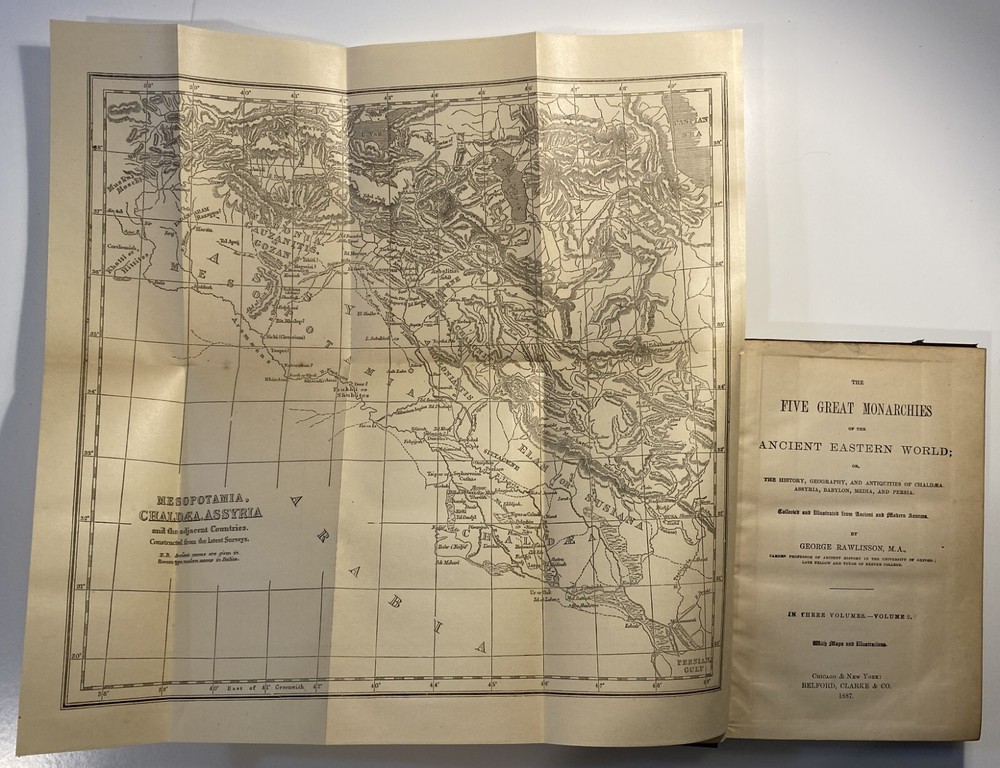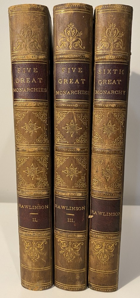 Title: [Three volumes of ancient history by Rawlinson]: The Five Great Monarchies of the Ancient Eastern World; or, the History, Geography, and Antiquities of Chaldaea, Assyria, Babylon, Media, and Persia. Collected and Illustrated from Ancient and Modern Sources. In Three Volumes. With Maps and Illustrations. [Vol. 2 and 3] With: The Sixth Great Oriental Monarchy or the Geography, History, and Antiquities of Parthia. Collected and Illustrated from Ancient and Modern Sources. Author: George Rawlinson Publisher: Belford, Clarke & Co., Chicago & New York Year: 1887 Details: Vol. 2 and 3 only of the Five Great Monarchies with the Sixth Great Oriental Monarchy in a single volume. Vol. 2 of Five Great is devoted to Assyria (final two chapters), Media and Babylon (part 1). Vol. 3 addresses Babylon (part 2) and Persia. Extensively illustrated with two folding maps in each volume. Quarter-leather and marbled paper over boards; spine in six compartments with gilt particulars and decorations; all sides marbled. Five Great, Vol 2: vii, [1], 580pp. Five Great, Vol. 3: viii, 567pp. Sixth Great: xiii, [3], 458pp. 8.25 x 5.75 in.