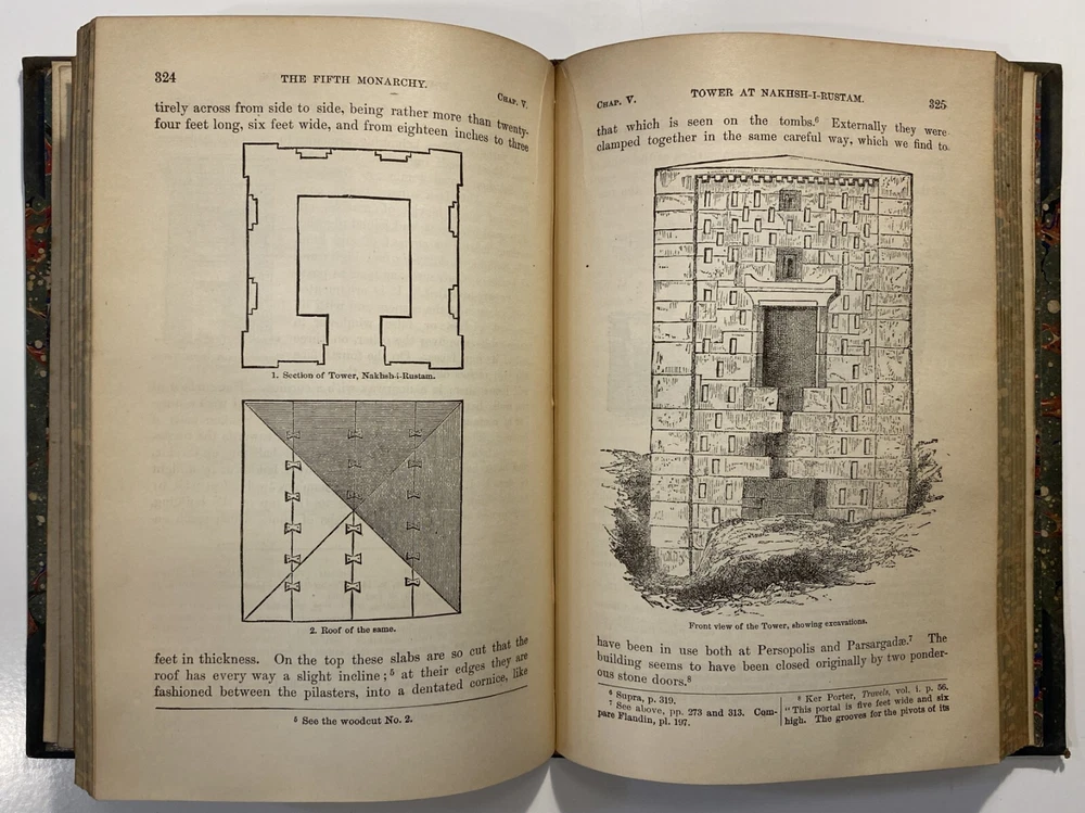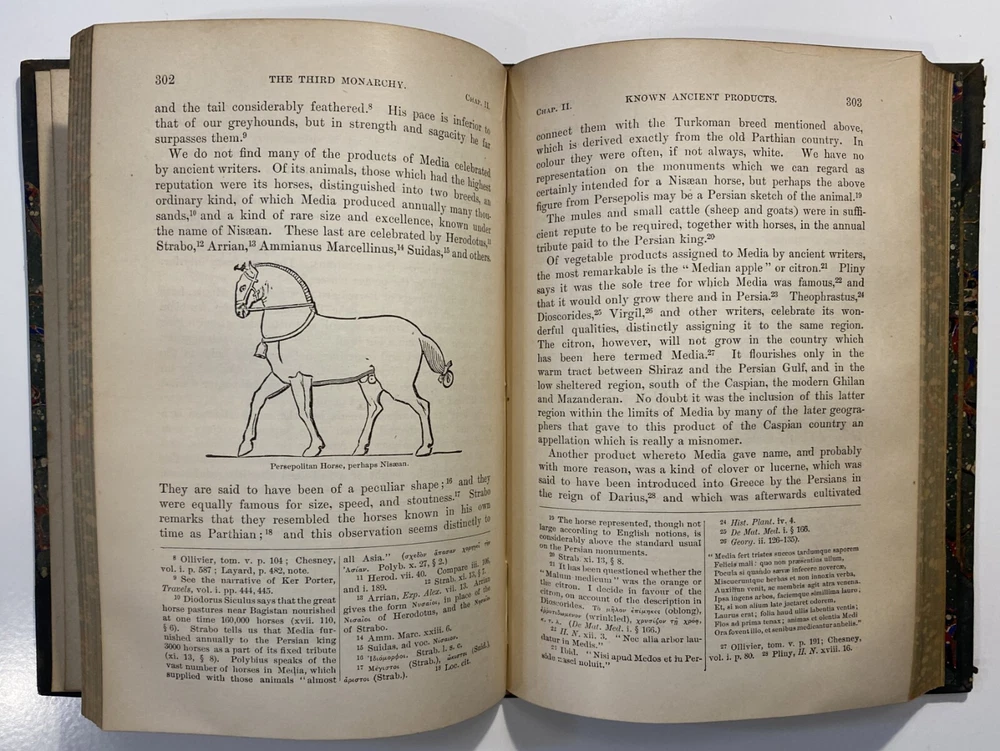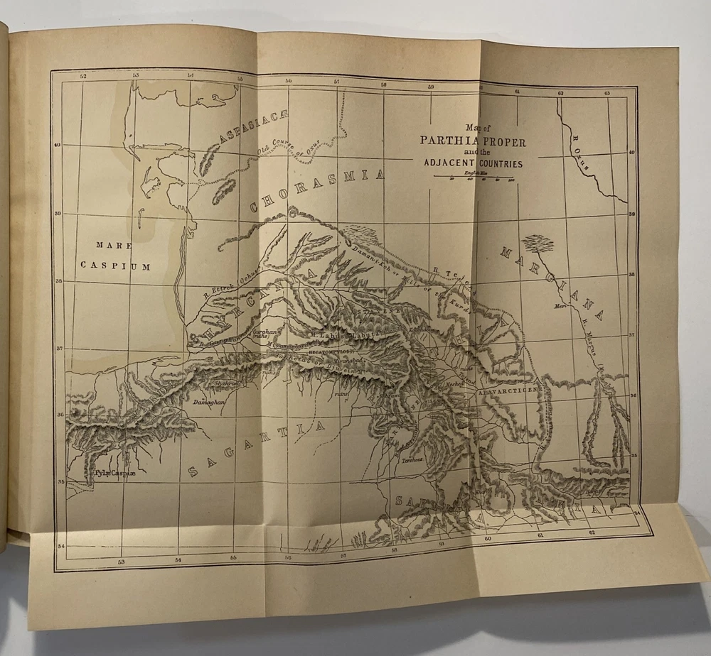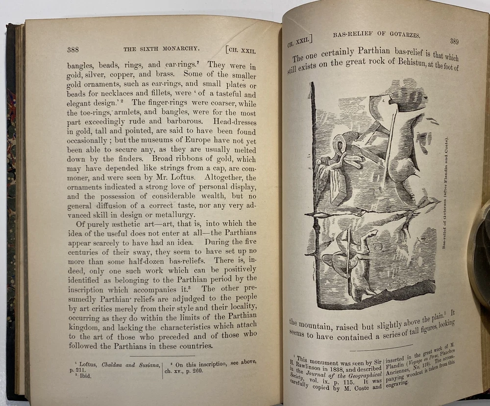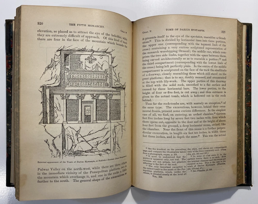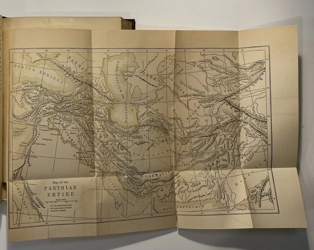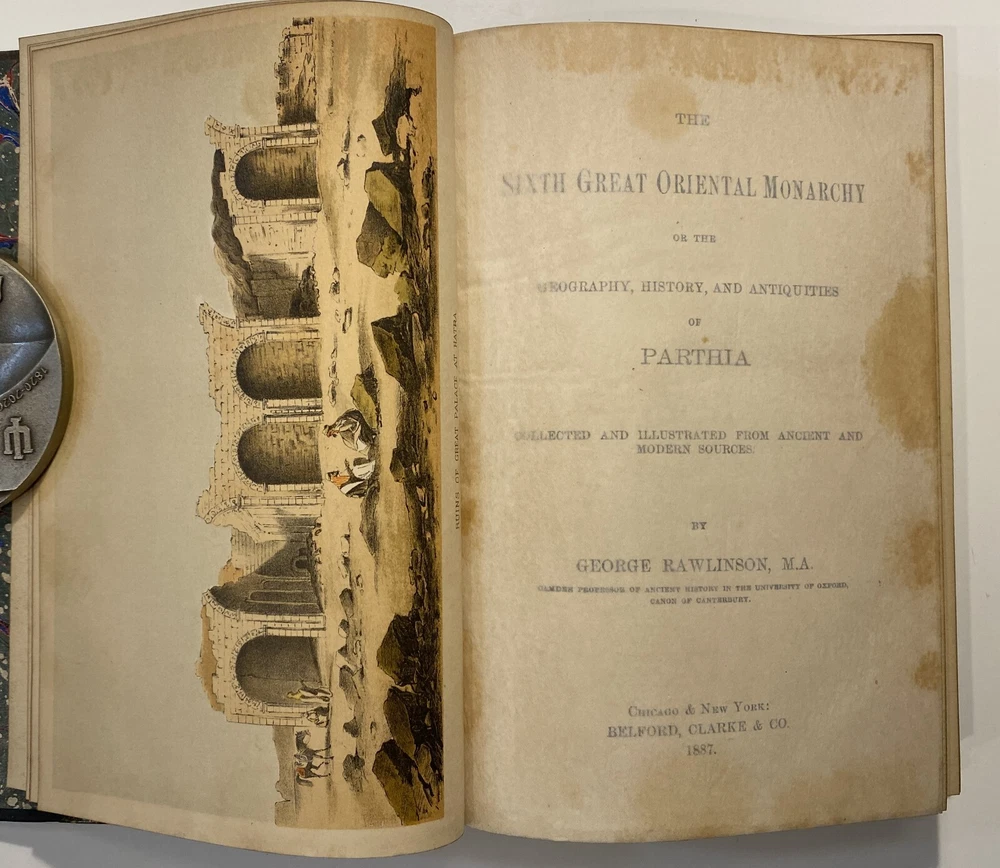 Title: [Three volumes of ancient history by Rawlinson]: The Five Great Monarchies of the Ancient Eastern World; or, the History, Geography, and Antiquities of Chaldaea, Assyria, Babylon, Media, and Persia. Collected and Illustrated from Ancient and Modern Sources. In Three Volumes. With Maps and Illustrations. [Vol. 2 and 3] With: The Sixth Great Oriental Monarchy or the Geography, History, and Antiquities of Parthia. Collected and Illustrated from Ancient and Modern Sources. Author: George Rawlinson Publisher: Belford, Clarke & Co., Chicago & New York Year: 1887 Details: Vol. 2 and 3 only of the Five Great Monarchies with the Sixth Great Oriental Monarchy in a single volume. Vol. 2 of Five Great is devoted to Assyria (final two chapters), Media and Babylon (part 1). Vol. 3 addresses Babylon (part 2) and Persia. Extensively illustrated with two folding maps in each volume. Quarter-leather and marbled paper over boards; spine in six compartments with gilt particulars and decorations; all sides marbled. Five Great, Vol 2: vii, [1], 580pp. Five Great, Vol. 3: viii, 567pp. Sixth Great: xiii, [3], 458pp. 8.25 x 5.75 in.