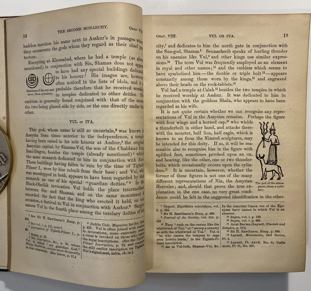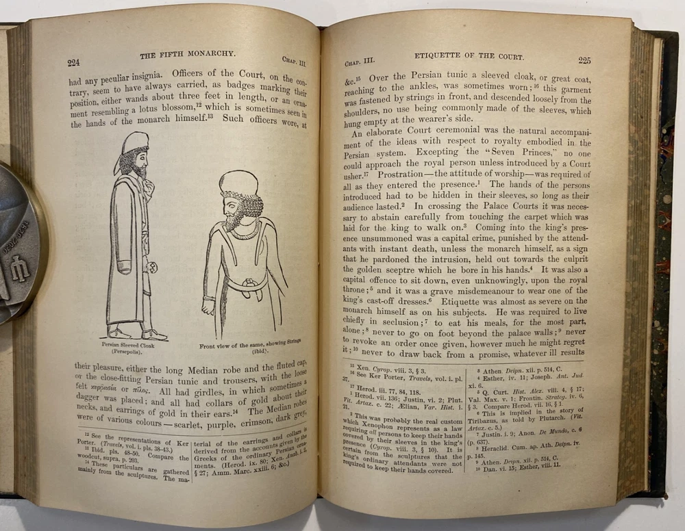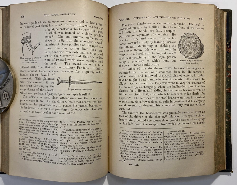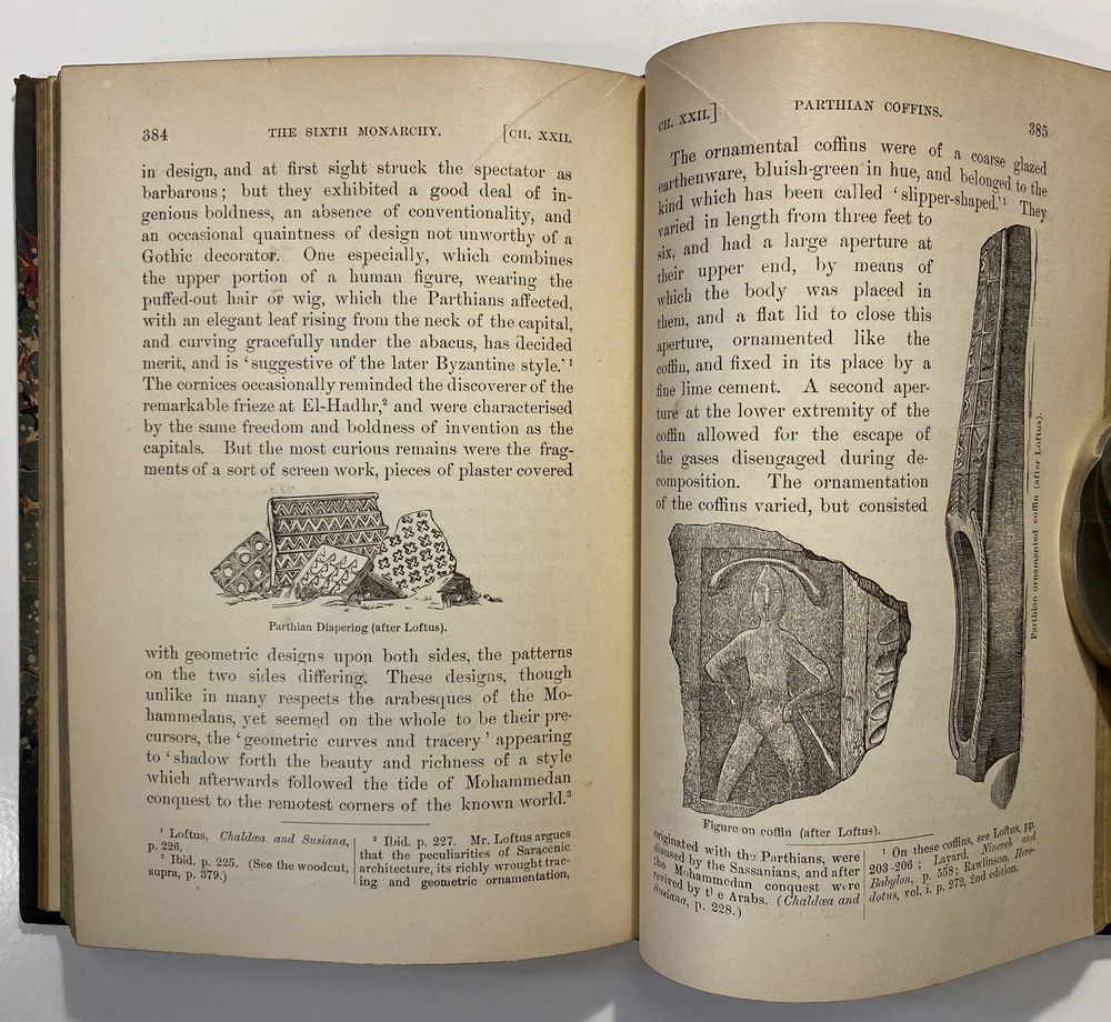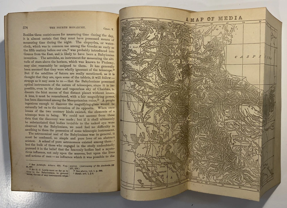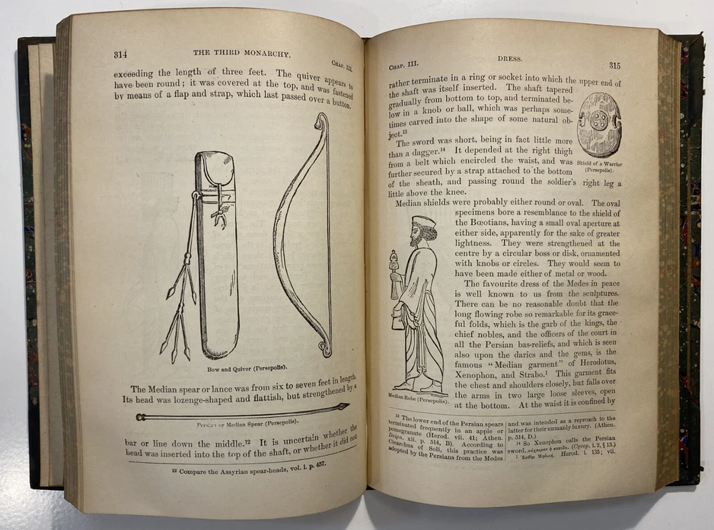 Title: [Three volumes of ancient history by Rawlinson]: The Five Great Monarchies of the Ancient Eastern World; or, the History, Geography, and Antiquities of Chaldaea, Assyria, Babylon, Media, and Persia. Collected and Illustrated from Ancient and Modern Sources. In Three Volumes. With Maps and Illustrations. [Vol. 2 and 3] With: The Sixth Great Oriental Monarchy or the Geography, History, and Antiquities of Parthia. Collected and Illustrated from Ancient and Modern Sources. Author: George Rawlinson Publisher: Belford, Clarke & Co., Chicago & New York Year: 1887 Details: Vol. 2 and 3 only of the Five Great Monarchies with the Sixth Great Oriental Monarchy in a single volume. Vol. 2 of Five Great is devoted to Assyria (final two chapters), Media and Babylon (part 1). Vol. 3 addresses Babylon (part 2) and Persia. Extensively illustrated with two folding maps in each volume. Quarter-leather and marbled paper over boards; spine in six compartments with gilt particulars and decorations; all sides marbled. Five Great, Vol 2: vii, [1], 580pp. Five Great, Vol. 3: viii, 567pp. Sixth Great: xiii, [3], 458pp. 8.25 x 5.75 in.