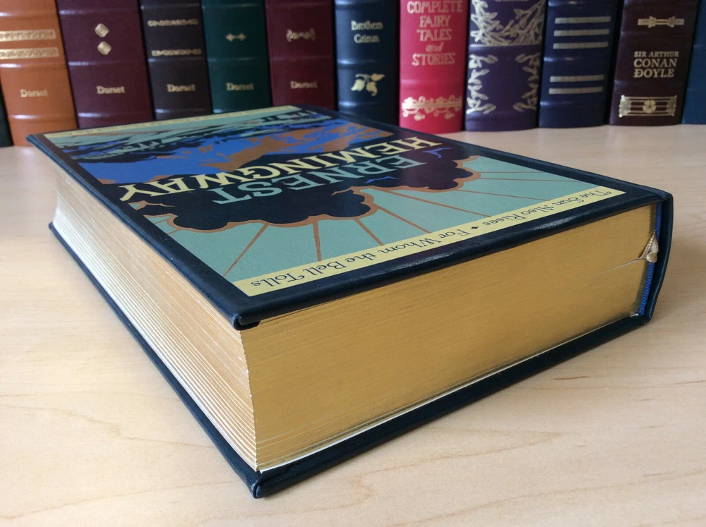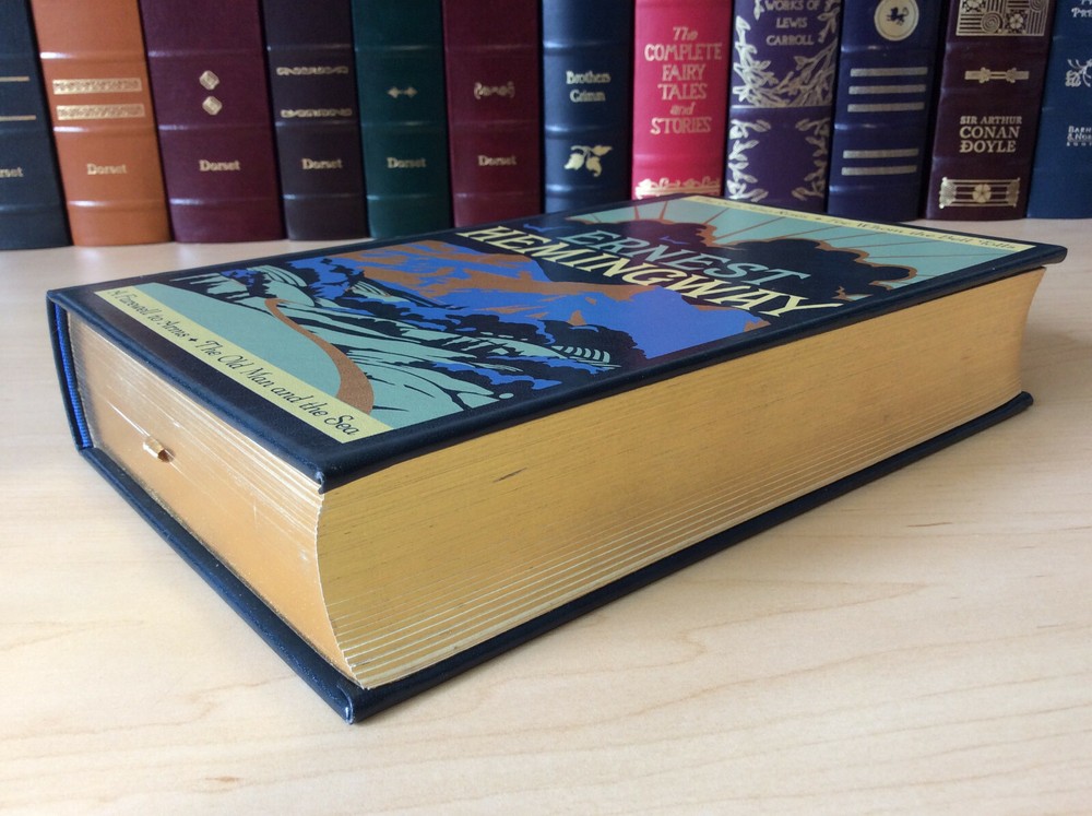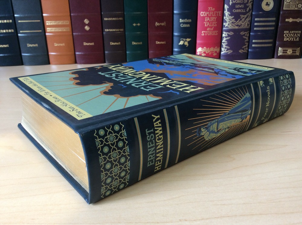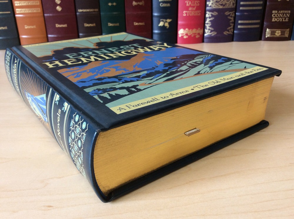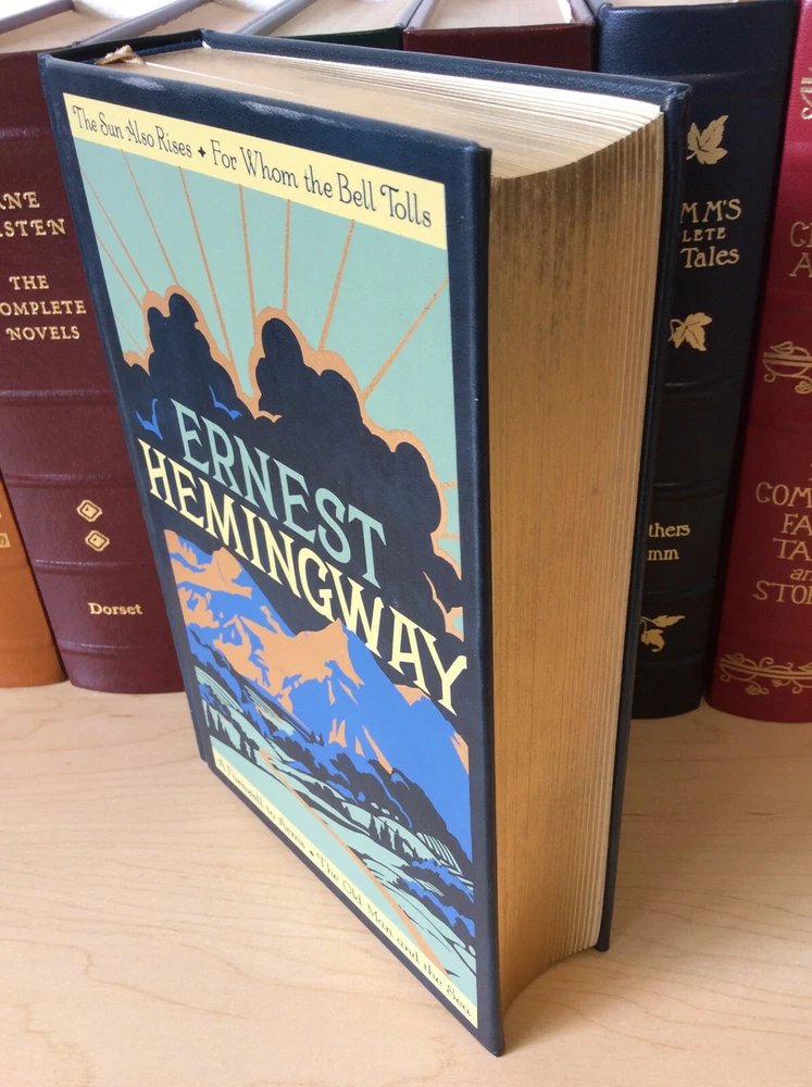 Four Novels by Ernest Hemingway bound in leather with gilt edged pages, and a ribbon marker Contents: The Sun Also Rises For Whom the Bell Tolls A Farewell to Arms The Old Man and the Sea Item Condition: This hardcover leather-bound is in Very Good condition. There are no names, stamps or bookplates of previous owners inside. The pages are clean, and tthe binding is tight, there is a slight sag to the print block (see last photo). The gilt edging is bright and shiny with some marks and dings to it. The leather is in nice condition with some mild wear, and the corners have mild rubbing to the leather. Dimensions are approx: 9.25" x 6.25" x 1.75" This book will ship in a box with bubble wrap. Photos are of the actual book that will be shipped.