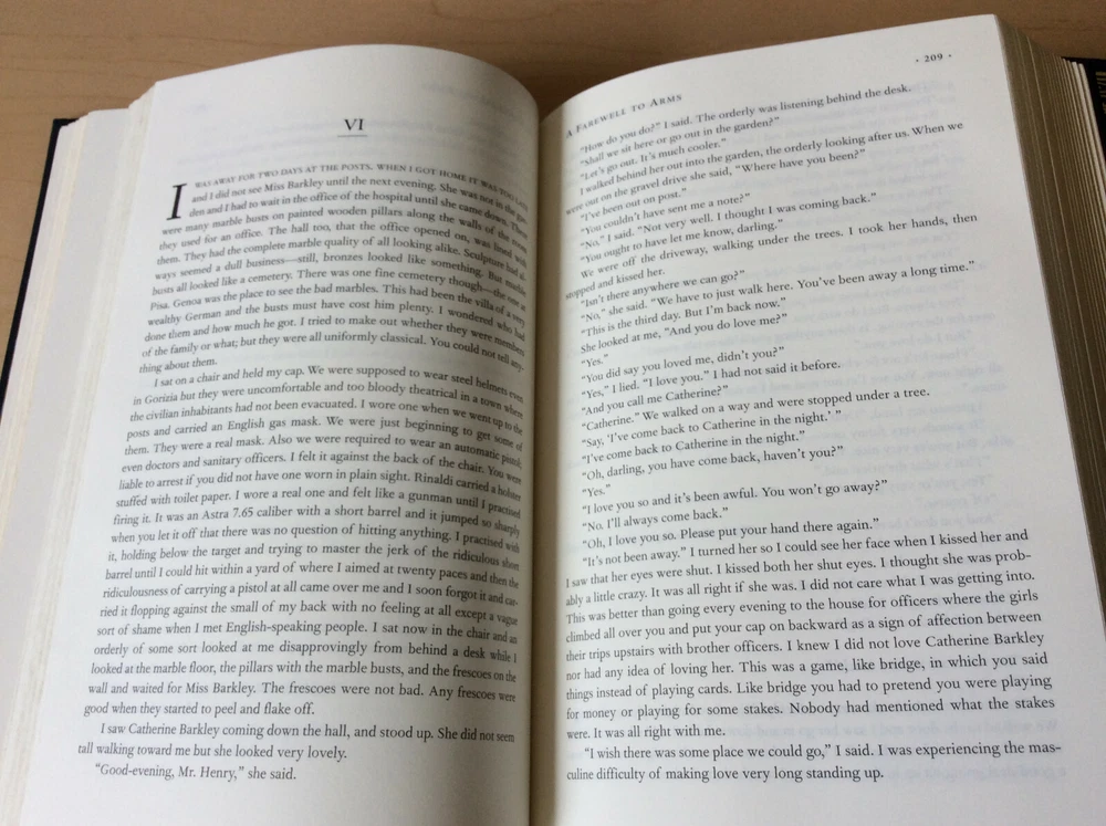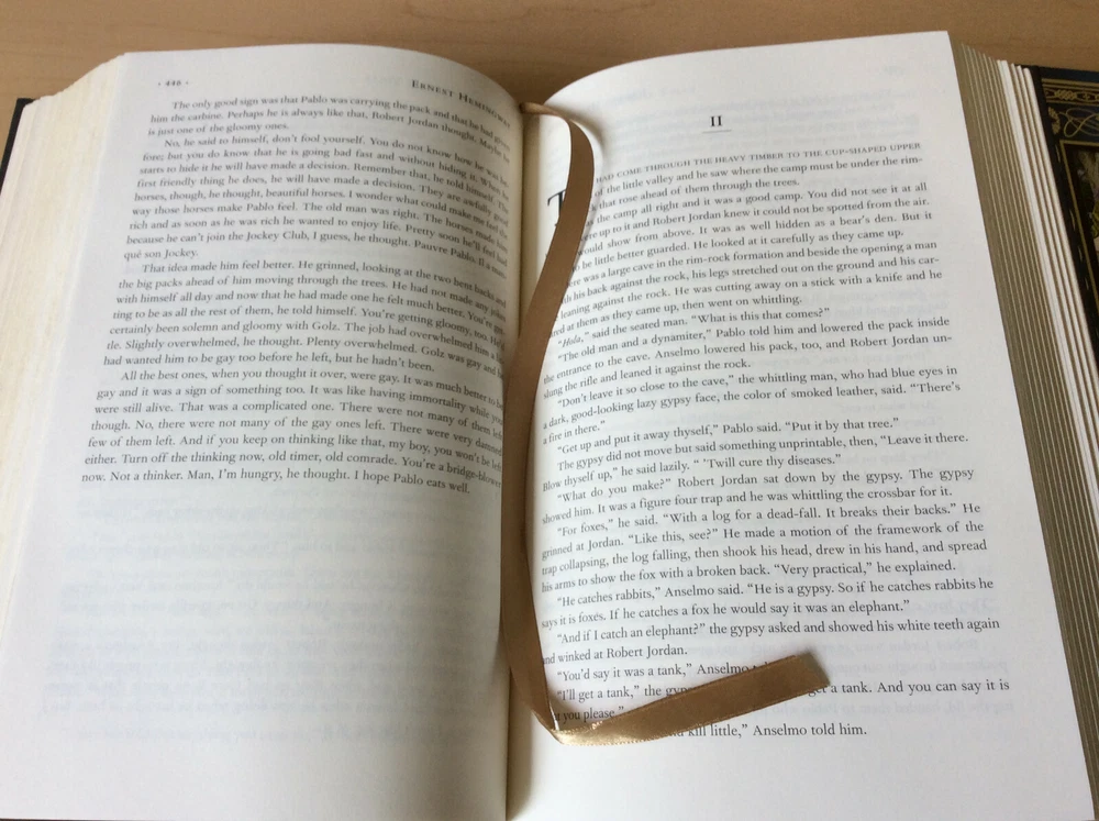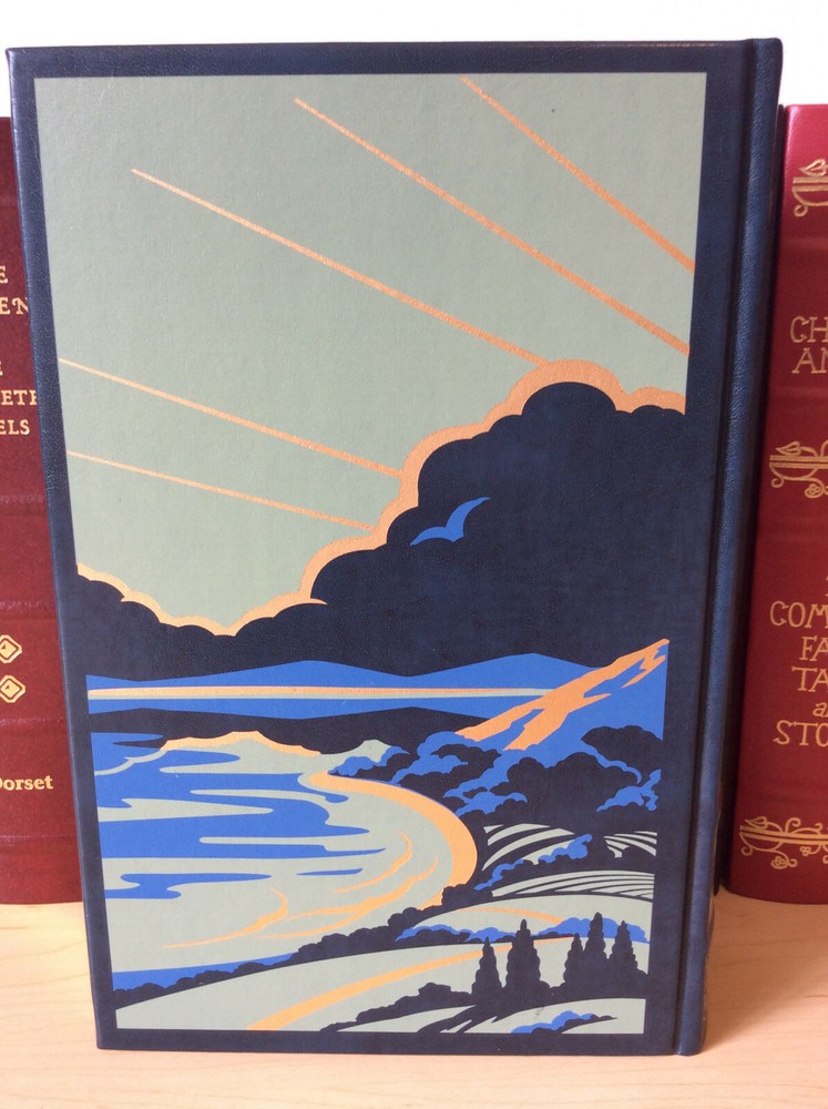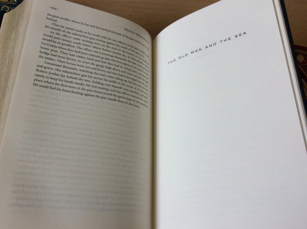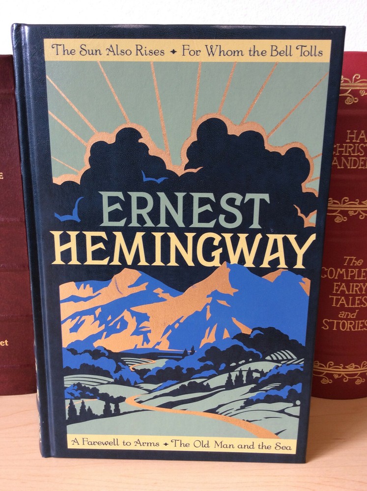 Four Novels by Ernest Hemingway bound in leather with gilt edged pages, and a ribbon marker Contents: The Sun Also Rises For Whom the Bell Tolls A Farewell to Arms The Old Man and the Sea Item Condition: This hardcover leather-bound is in Very Good condition. There are no names, stamps or bookplates of previous owners inside. The pages are clean, and tthe binding is tight, there is a slight sag to the print block (see last photo). The gilt edging is bright and shiny with some marks and dings to it. The leather is in nice condition with some mild wear, and the corners have mild rubbing to the leather. Dimensions are approx: 9.25" x 6.25" x 1.75" This book will ship in a box with bubble wrap. Photos are of the actual book that will be shipped.