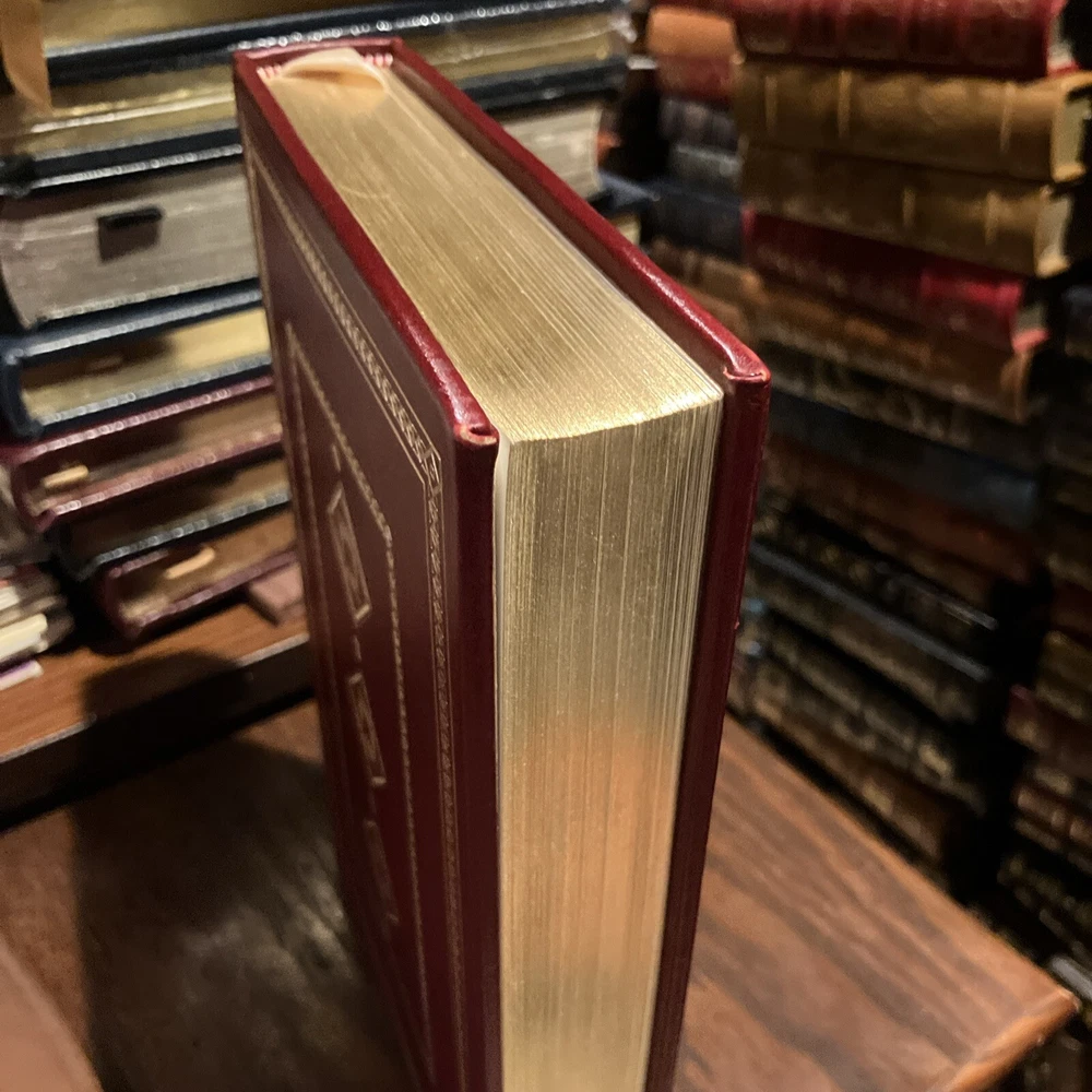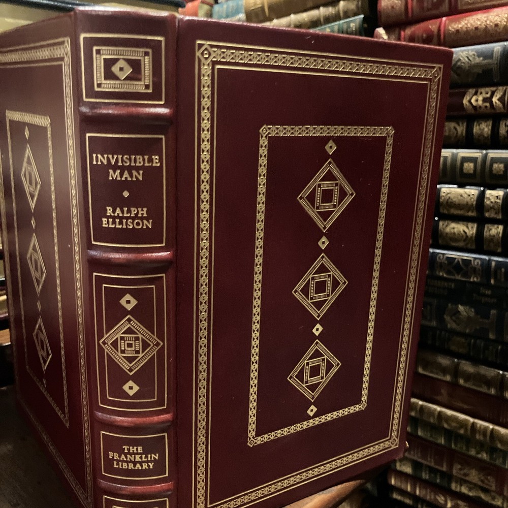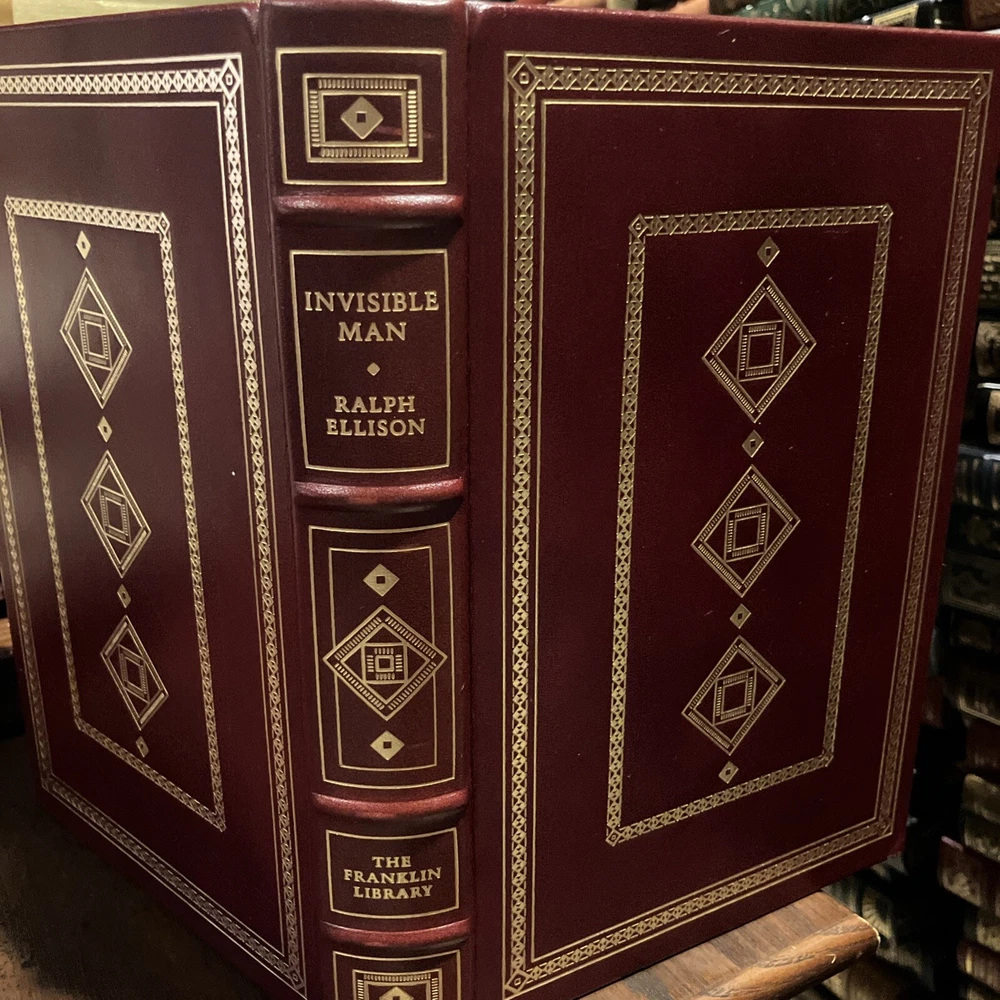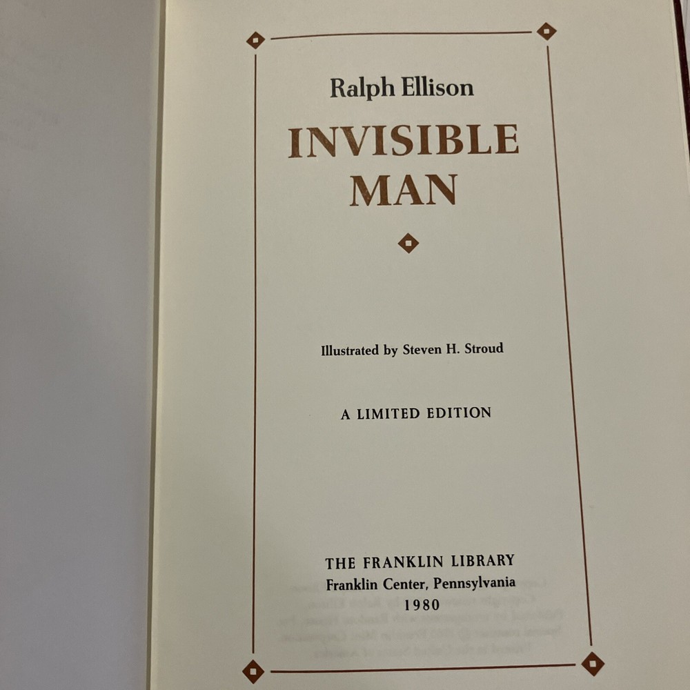 Franklin Library leather edition of Ralph Ellison's "Invisible Man," a Limited edition, one of the 100 GREATEST BOOKS OF AMERICAN LITERATURE series, Illustrated by Steven Stroud, published in 1980. Bound in burgundy leather, the book has light tan moire silk end leaves, a satin book marker, hubbed spine, acid-free paper, Symth-sewn binding, gold gilding on three edges---in FINE condition. Ralph Waldo Ellison, who was born in 1914 in Oklahoma published "Invisible Man" in 1952. The novel traces the life of a young Negro trying to find himself as an individual as well as in relation to his race and society. As a scholarship student at a southern black college, the narrator gets a lesson in how the black is supposed to accommodate the white when in his junior year, he obliginly chauffeurs a visiting white trustee, showing him parts of the area the old New England gentlemen had never seen before---including a local saloon/brothel. Of course the college president is outraged stating: "Why, the dumbest black bastard in the cotton patch knows that the only way to please a white man is to tell him a lie." The Opening lines are immortal: "I am an invisible man. No, I am not a spook like those who haunted Edgar Allan Poe; nor am I one of your Hollywood-movie ectoplasms. I am a man of substance, of flesh and bone, fiber and liquids---and I might even he said to possess a mind. I am invisible, understand, simple because people refuse to see me. Like the bodiless heads you see sometimes in circus sideshows, it as a though I have been surrounded by mirrors of hard, distorting glass. . . " "Invisible Man" is a fictional memoir written underground. The unnamed narrator, having literally stumbled into an old forgotten basement during a riot, has found this hole in the ground to be a comfortable home. He has settled in for hibernation, which he defines as "a covert preparation for a more overt action." It all began, the hero says, with his grandfather who on his deathbed advised: "Son, after I'm gone I want you to keep up the good fight. I never told you, but our life is a war and I have been a traitor all my born days, a spy in the enemy's country ever since I give up my gun back in the Reconstruction. Live with your head in the lion's mouth. I want you to overcome 'em with yesses, undermine 'em with grins, agree 'em to death and destruction, let 'em swoller you till they vomit or bust wide open." The novel won the 1952 National Book Award and is often listed as one of the five best African-American novels of all time. New York Times critic Wright Morris compared aspects of Ellison's work with those of Virgil, Dante, and Dostoevsky. 457 pages---a GORGEOUS book! I offer Combined shipping.