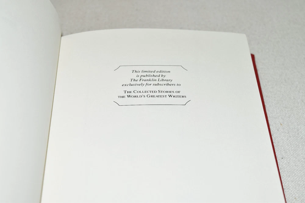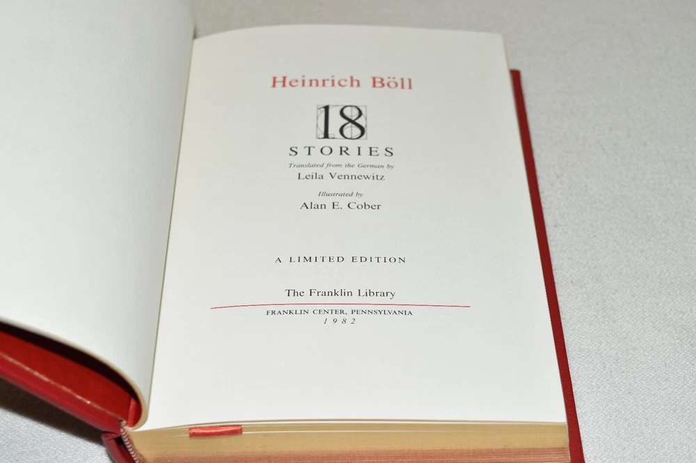 From the Franklin Library World's Greatest Writers Collection... 18 Stories by Heinrich Boll Illustrated by Alan Cober Copyright 1982 by The Franklin Library Premium Full Leather Binding This volume contains all of these classic Franklin Library trimmings: Premium Leather Binding Silk Moire Endleaves Distinctive Cover Design Hubbed Spine, Accented in Gold Satin Ribbon Page Marker Gilded Page Edges Long-lasting, High Quality Acid-neutral Paper Beautiful Illustrations A very scarce title in any condition, this 1982 edition is in Fine condition. The front and back covers are in terrific condition and the gilded page edges show hardly any wear (see pictures of all sides). There are no markings, bookplates, or other signs of prior ownership in this book. This World's Greatest Writers Edition was published by The Franklin Library and would be a beautiful addition to your Franklin Library book collection. Overall, this copy is a grade collector's book. This book is very elusive in this superior condition, as only a limited number of them were ever published, so now is the time to act. Hopefully you can add this book to your collection and enjoy it in the years to come... Please Email Me With Any Questions You Might Have! Shipping Info: Buyer to Pay Shipping and Handling International Bidders Pay Extra Shipping Seller Not Responsible For Uninsured Items Lost or Damaged in Mail Forms of Payment Accepted: Paypal Good luck and happy bidding! Powered by eBay Turbo Lister The free listing tool. List your items fast and easy and manage your active items.