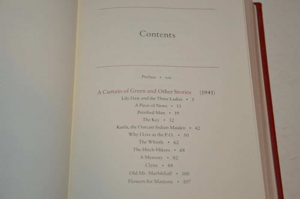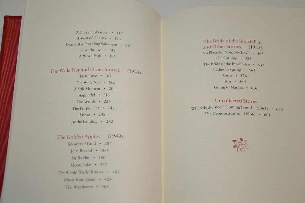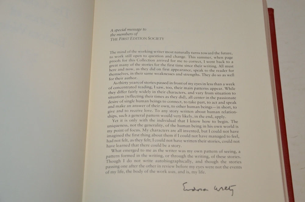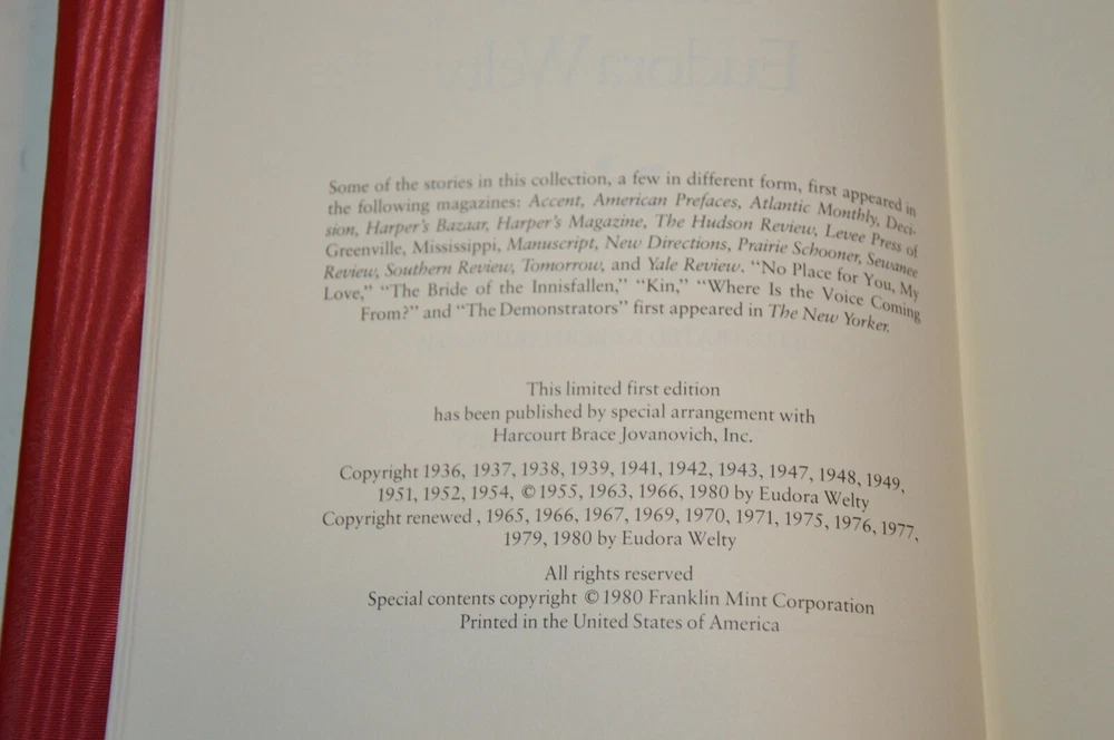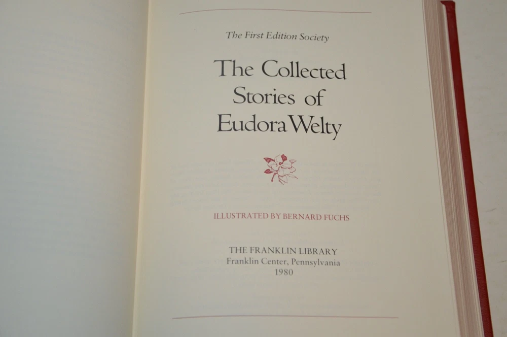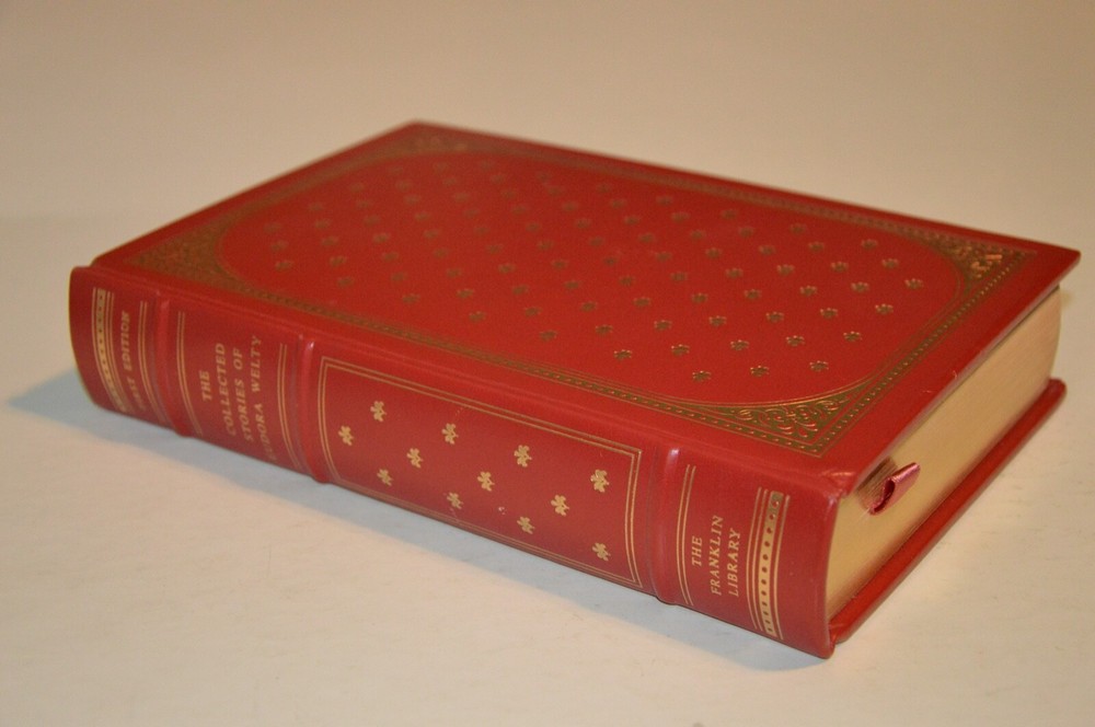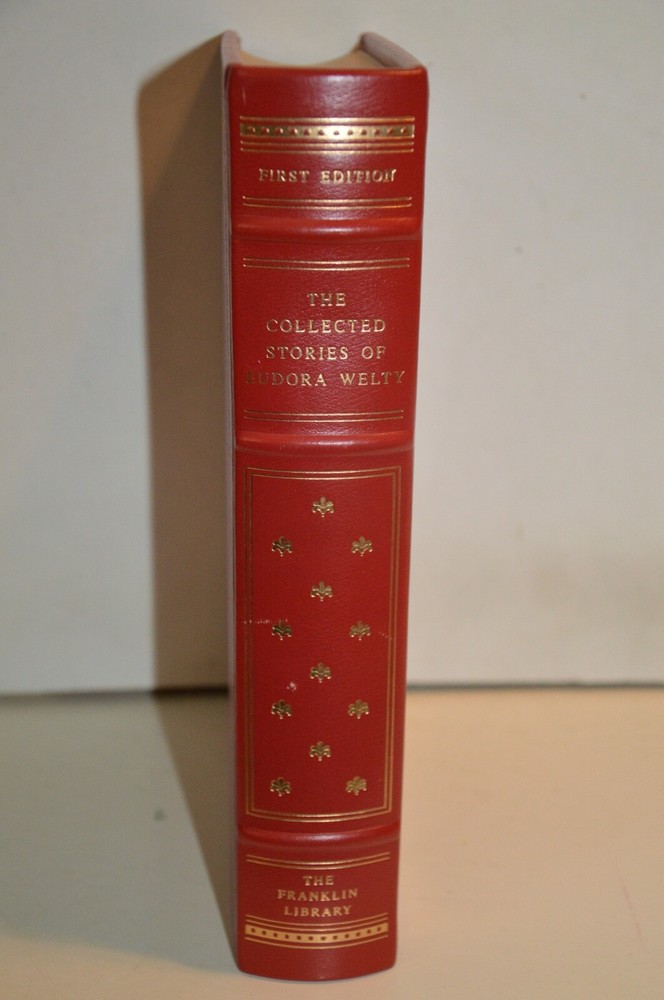 Franklin Library 1st Edition: The Collected Stories of Eudora Welty 1980 Red Leather with Gold Gilt lettering, inlay, and complete outer page block EXCELLENT Condition Satin red ribbon page marker "This limited first edition has been privately printed exclusively for Members of The First Edition Society" ***SHIPS WELL PACKED VIA USPS MEDIA MAIL****