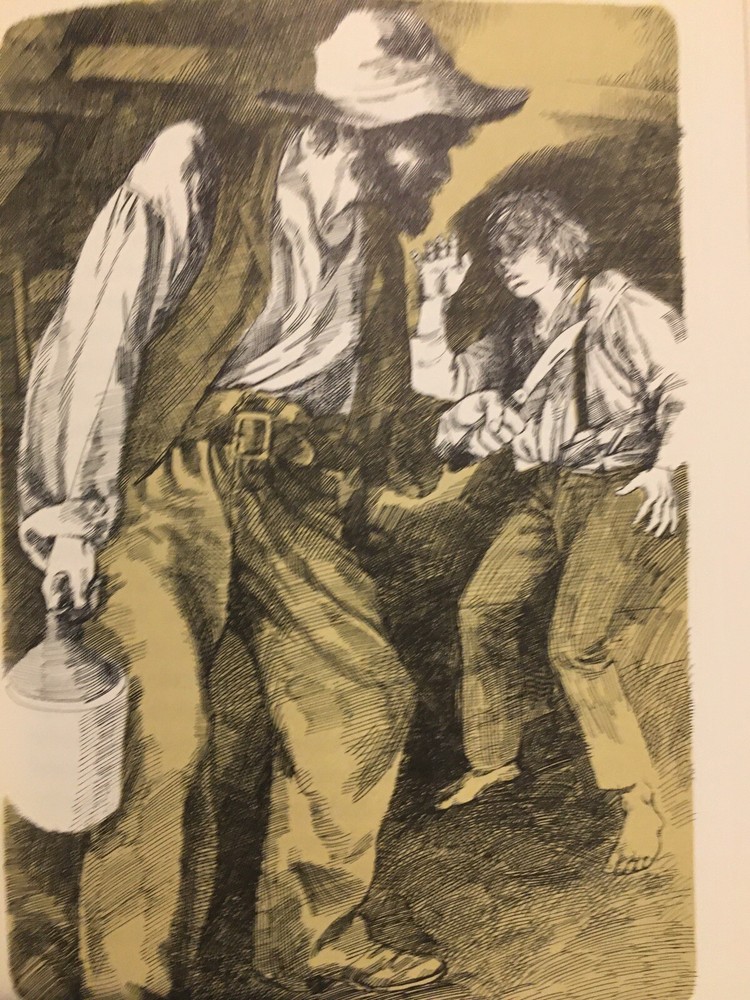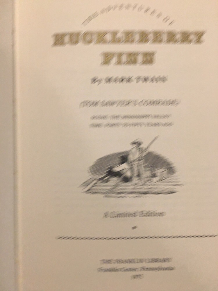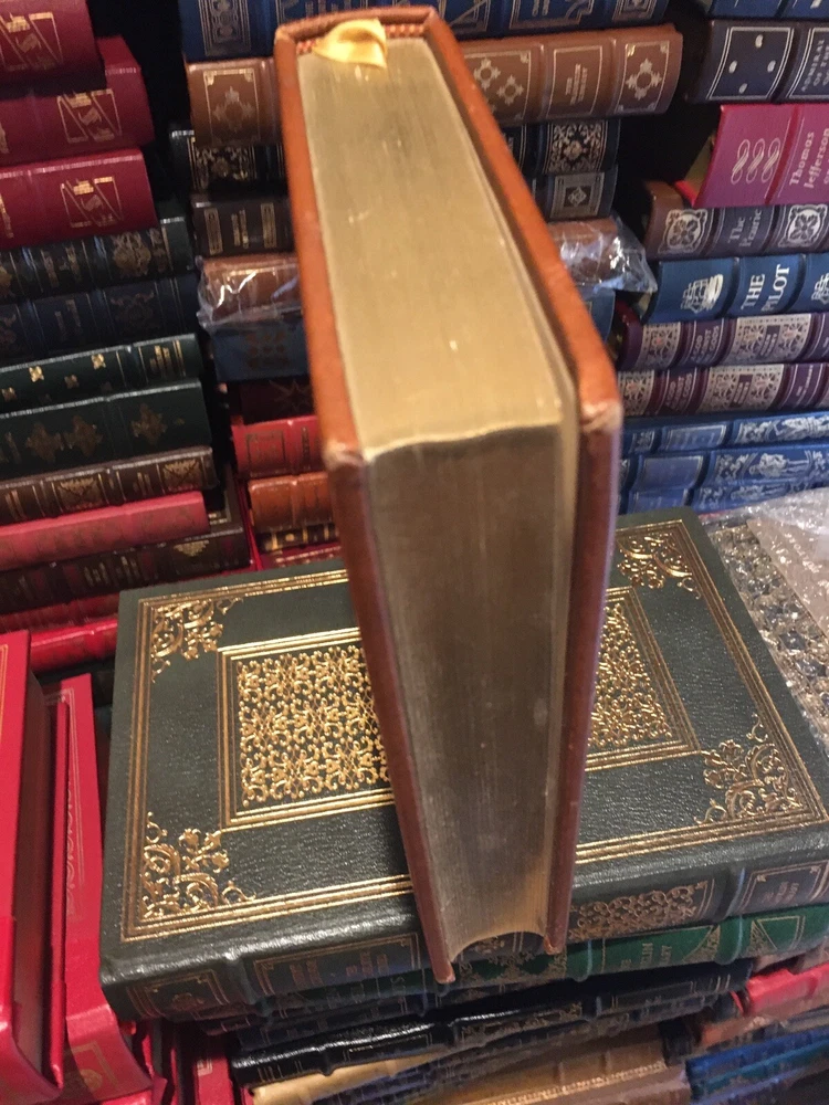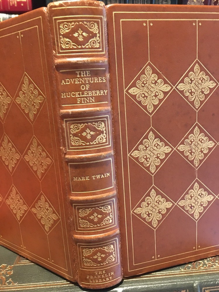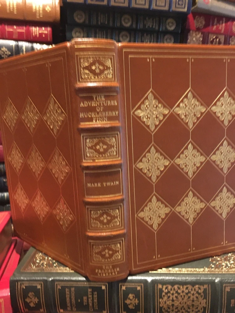 Franklin Library leather edition of "The Adventures of Huckleberry Finn (Tom Sawyer's Companion)," Frontispiece portrait of Mark Twain by Alexander Hay Ritchie, Illustrated by Ben F. Stahl, one of the 100 GREATEST BOOKS OF ALL TIME series, published in 1975. Bound in camel tan leather, the book has camel tan moire silk end leaves, acid-free paper, Symth-sewn binding, a hubbed spine, and a satin book marker----in near Fine condition. Samuel Langhorne Clemens, who lived from 1835 – 1910, and better known by his pen name Mark Twain, was an American author and humorist, reared in HANNIBAL, MISSOURI, the setting for "Huckleberry Finn." The opening lines are famous: "You don't know me, without you have read a book by the name of "The Adventures of Tom Sawyer," but that ain't no matter. That book was made by Mr. Mark Twain, and he told the truth, mainly. There was things which he stretched, but mainly he told the truth. That is nothing. I never seen anybody but lied, one time or another, without it was Aunt Polly, or the widow, or maybe Mary. Aunt Polly---Tom's Aunt Polly, she is---and Mary, and the Widow Douglass, is all told about in that book---which is mainly a true book, with some stretcher, as I said before." The reader will learn about JUDGE THATCHER, the shiftless, drunken PAP FINN, the NEGRO JIM, and Huck and Jim's floating down the Mississippi River. 404 pages. I offer Combined shipping.