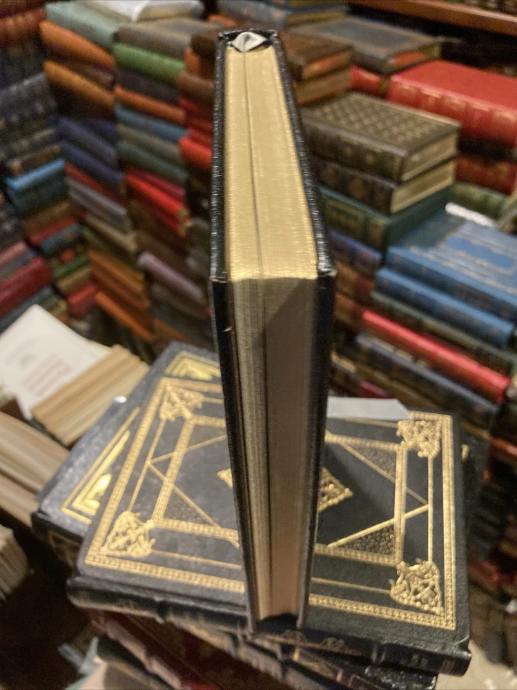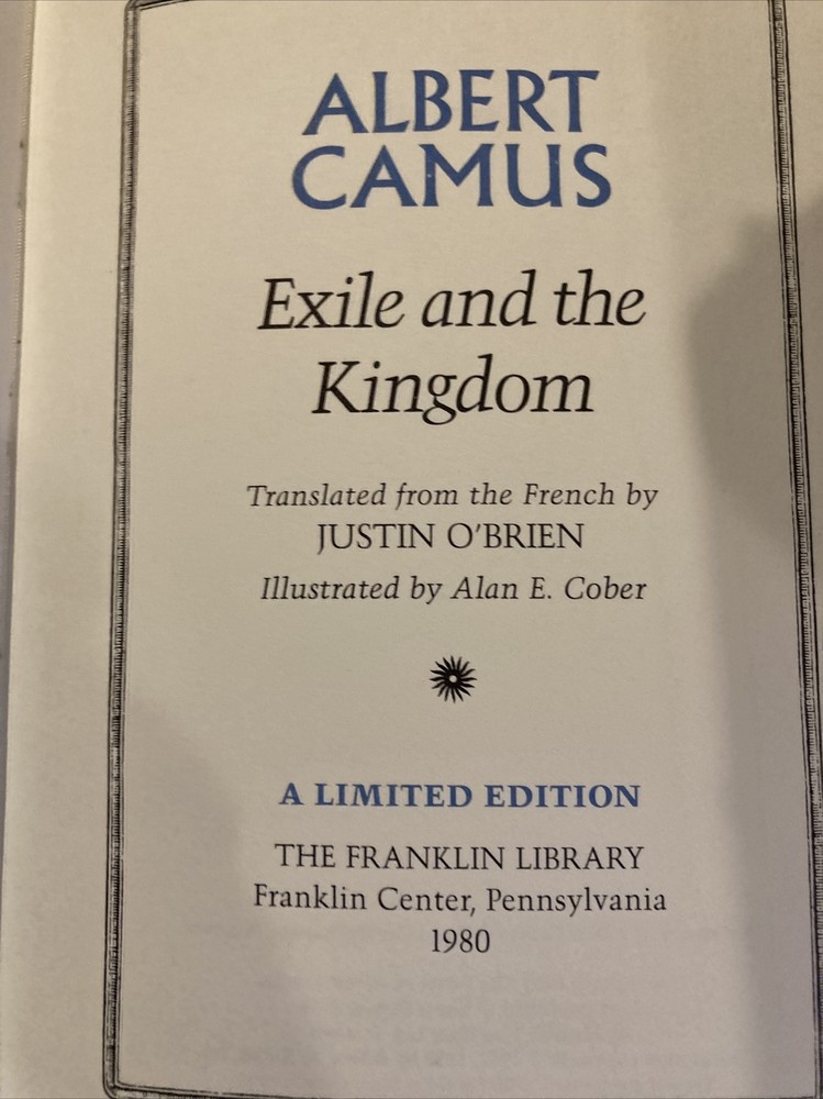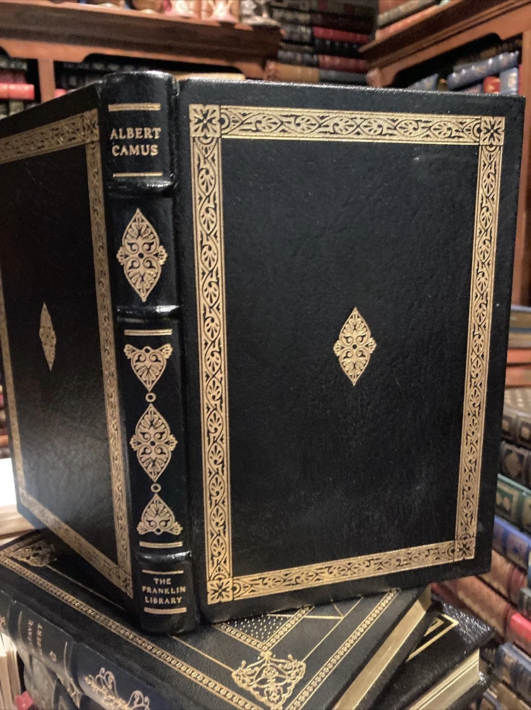 Franklin Library leather edition of Albert Camus's "Exile and the Kingdom," Translated from the French by Justin O'Brien, a Limited edition, Illustrated by Alan E. Cober, one of the COLLECTED STORIES OF THE WORLD'S GREATEST WRITERS series, published in 1980. 22 Pages of NOTES FROM THE EDITOR included Bound in navy blue leather, the book has matching French moire silk end leaves, satin book marker, acid-free paper, Symth-sewn binding, hubbed spine, gold gilding on three edges----in NEW condition----with ORIGINAL BOX and NOTES! Albert Camus, who lived from 1913-1960, was born in Algeria to an impoverished worker and a Spanish maid. Camus won a scholarship to the lycee and entered the University of Algiers in 1932 and obtained an advanced degree in 1936 in philosophy. In May 1940, he landed in PARIS just before the German occupation. Camus was awarded the NOBEL PRIZE in 1956, but died in a car crash in 1960. Stories include: "The Adulterous Woman," "The Renegade," "The Silent Men," "The Guest," "The Artist at Work," and "The Growing Stone." 160 pages---a RARE title. I offer combined shipping.