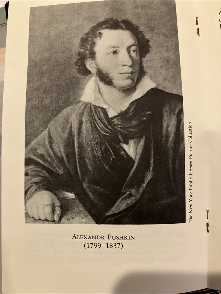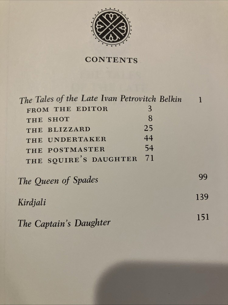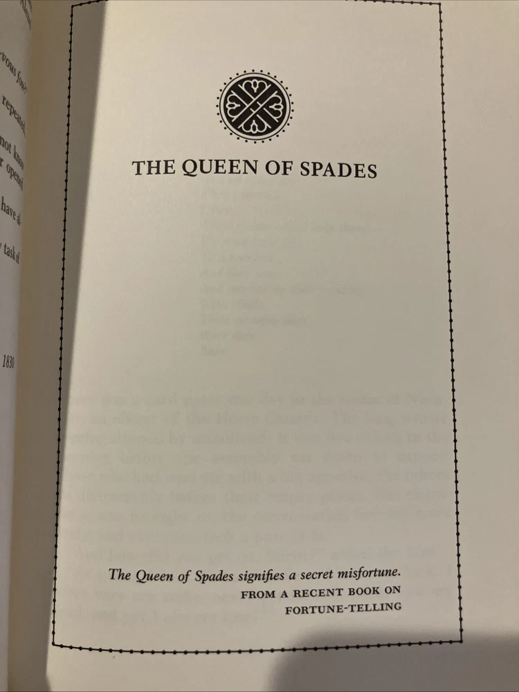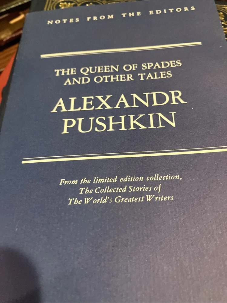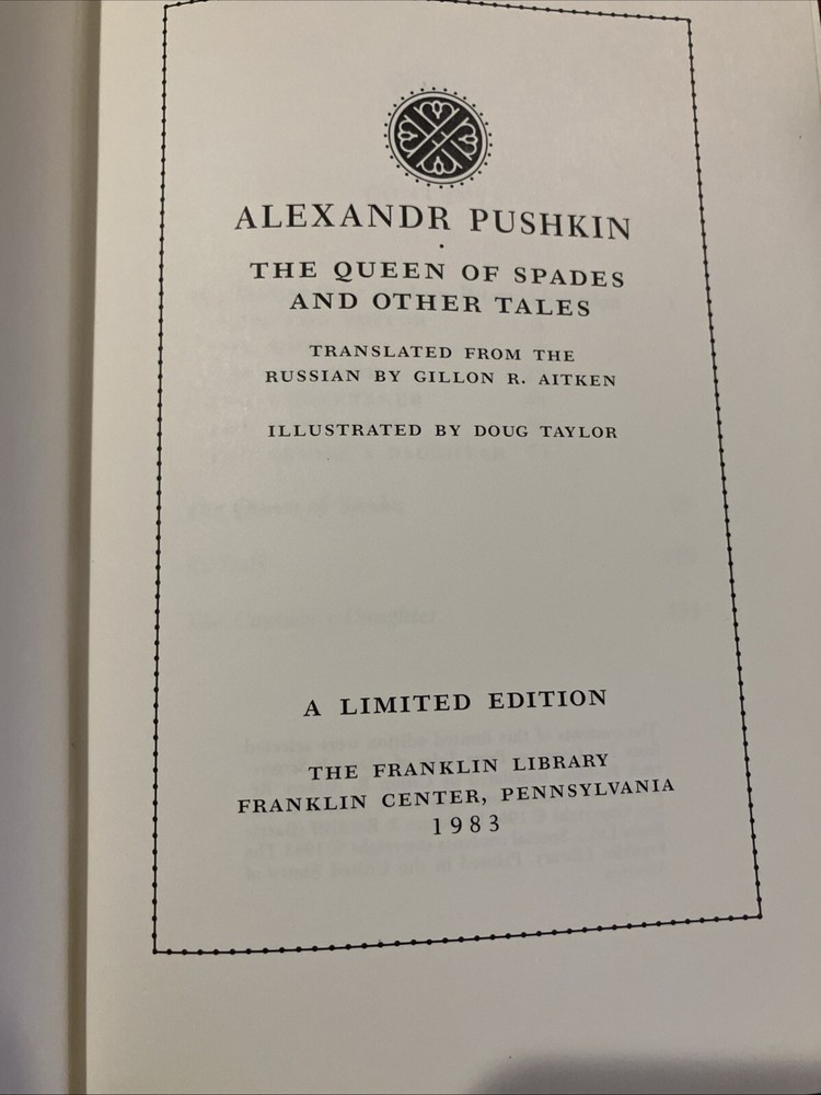 Franklin Library leather edition of Alexandr Pushkin's "The Queen of Spades and Other Tales," Translated by Gillon R. Aitken, illustrated by Doug Taylor, Frontispiece portrait of Pushkin, a Limited edition, one of the COLLECTED STORIES OF THE WORLD'S GREATEST WRITERS series, published in 1983. Bound in navy blue leather, the book has matching moire silk end leaves, hubbed spine, a satin book marker, acid-free paper, Symth-sewn binding, gold gilding on three edge---in near FINE condition. 22 Pages of NOTES FROM THE EDITOR is included. Alexandr Pushkin, who lived from 1799-1837, was born in the MOSCOW, descended from nobility on both sides, a shy yet rebellious "ugly duckling" of a boy. His literary education began early. When he was twelve years old, he entered the Lyceum of Tsarskoe Selo, a prestigious school established by Alexander I. The "Decemberists of 1825, feared that Pushkin was too frivolous and exiled him to Siberia where he remained for six years. He later spent time in Kishinev, then in Odessa, and finally in his family village of Mikhilovskoe. Ultimately, Pushkin lived in Moscow where he married the beautiful Natalya Goncharova who was thirteen years younger, a flirt who loved to show off in public. Selections include: "The Tales of the Late Ivan Petrovitch Belkin," "The Queen of Spades," "Kirdjali," and "The Captain's Daughter." 313 pages---a RARE title. I offer Combined shipping.