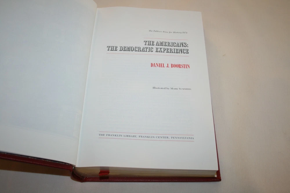 From the Franklin Library Pulitzer Prize Collection... The Americans: The Democratic Experience by Daniel J. Boorstin Illustrated by Mark Summers Copyright 1987 by The Franklin Library Premium Full Leather Binding This volume contains all of these classic Franklin Library trimmings: Premium Leather Binding Decorated Endleaves Distinctive Cover Design Hubbed Spine, Accented in Gold Satin Ribbon Page Marker Gilded Page Edges Long-lasting, High Quality Acid-neutral Paper Beautiful Illustrations A very scarce title in any condition, this copy is in Excellent and Unread condition. The front and back covers are in Excellent condition showing minor wear and the gilded page edges show some wear (see pictures). There are no markings, bookplates, or other signs of prior ownership in this book. This Pulitzer Prize Edition was published by The Franklin Library and would be a beautiful addition to your Franklin Library book collection. Overall, this copy is a grade collector's book. This book is very elusive in this superior condition, as only a limited number of them were ever published, so now is the time to act. Hopefully you can add this book to your collection and enjoy it in the years to come... Please Email Me With Any Questions You Might Have! Shipping Info: Buyer to Pay Shipping and Handling International Bidders Pay Extra Shipping Seller Not Responsible For Uninsured Items Lost or Damaged in Mail Forms of Payment Accepted: Paypal Good luck and happy bidding! Powered by eBay Turbo Lister The free listing tool. List your items fast and easy and manage your active items.