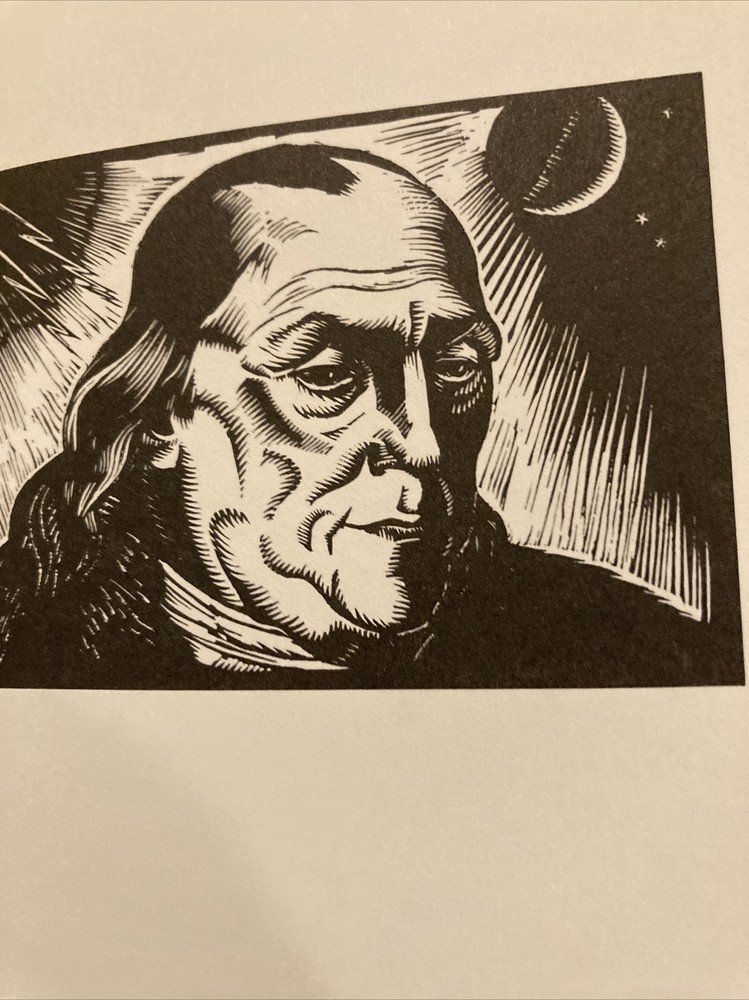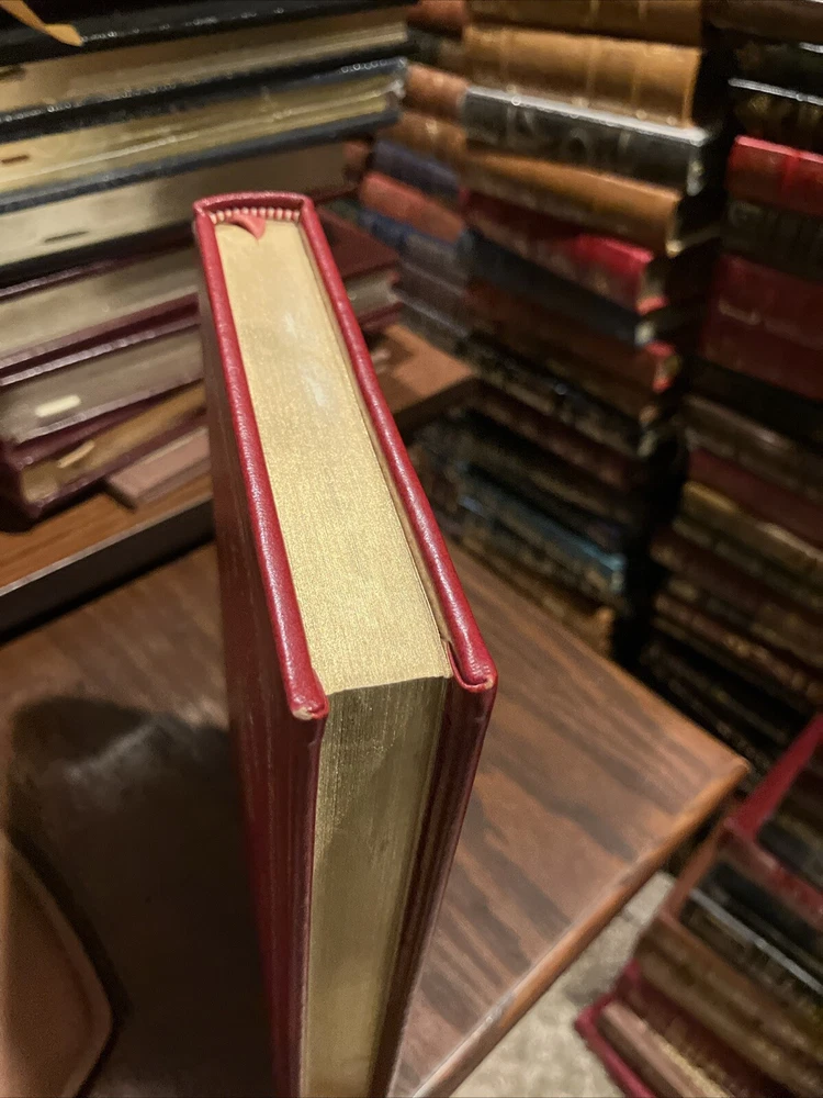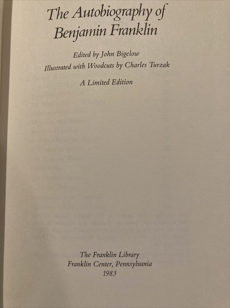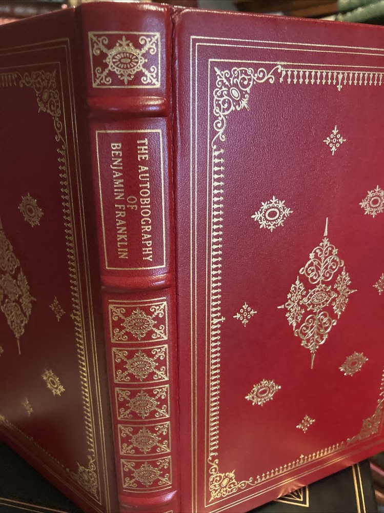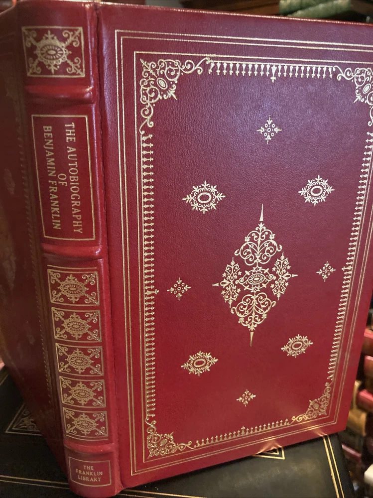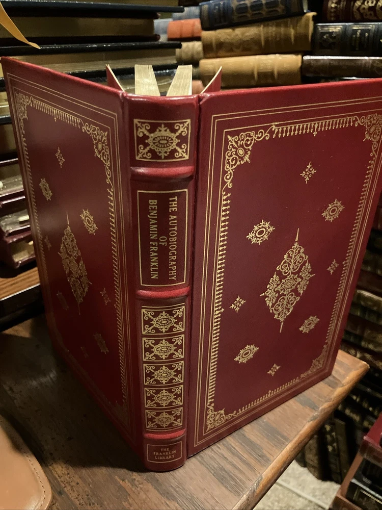 Franklin Library leather edition of "The Autobiography of Benjamin Franklin," a Limited edition, edited by John Bigelow, illustrated Charles Turzak , with a portrait of BEN FRANKLIN, one of the 100 GREATEST MASTERPIECNES OF AMERICAN LITERATURE series, published in 1983. Bound in scarlet red leather, the book has red moire silk end leaves, acid-free paper, Symth-sewn binding, hubbed spine, a satin book marker, gold gilding on three edges---in near FINE condition---except for 'moderate' rubs to top gilt. Benjamin Franklin, who lived from 1706--1790, was born in Boston but secretly sailed to New York at the age of seventeen. There at the age of twenty-two he opened his own printing shop. Franklin wrote, became the postmaster of Philadelphia in 1737 and in 1751, he was elected member of the Assembly for the City of Philadelphia. Franklin married Deborah Read and she helped Franklin in the Post Office. Franklin was a Founding Father of the U.S., a leading author, printer, political theorist, politician, free mason, postmaster, scientist, inventor, civic activist, statesman, and diplomat. As a scientist, he was a major figure in the American Enlightenment and the history of physics for his discoveries and theories regarding electricity. As an inventor, he is known for the lighting rod, bifocals and the Franklin stove. He facilitated many civic organizations, including Philadelphia's fire department and the University of Pennsylvania. As the first U.S. Ambassador to France, he exemplified the emerging American nation. Franklin was foundational in defining the American ethos as a marriage of the practical values of thrift, hard work, education, community spirit, self-governing institutions, and opposition to authoritarianism both political and religious. An accomplished diplomat, he was widely admired among the French as American minister to Paris. His efforts proved vital for the American Revolution in securing shipments of crucial munitions from France. From 1785 to 1788, he served as governor of Pennsylvania. His colorful life and legacy of scientific and political achievement, and his status as one of America's most influential Founding Fathers have seen Franklin honored more than two centuries after his death on coinage and the $100 bill, warships, and names of many towns, counties, educational institutions, and corporations. Franklin became famous for his proverbs such as: "Who riseth late trots all day, because he is behind in his business," "The Tongue talks at the head's costs," or "Nothing can be humbler than ambition, when it is so disposed." "Haste makes waste," "Eat to live, and not live to eat," "Keep your eyes wide open before marriage, half shut afterwards." THOMAS JEFFERSON, who replaced Franklin as minister to France, wrote in 1791, "The succession to Dr. Franklin at the court of France was an excellent school of humility. No one can replace him, I am only his successor." 191 pages. I offer Combined shipping.