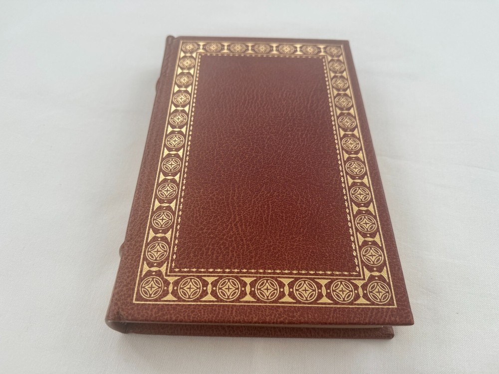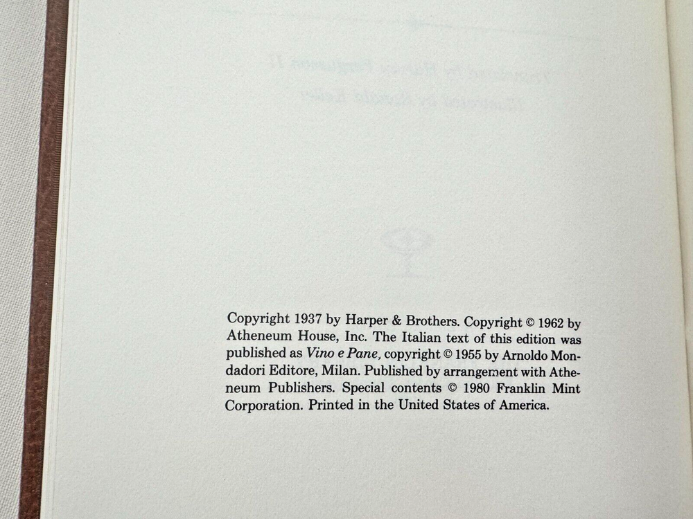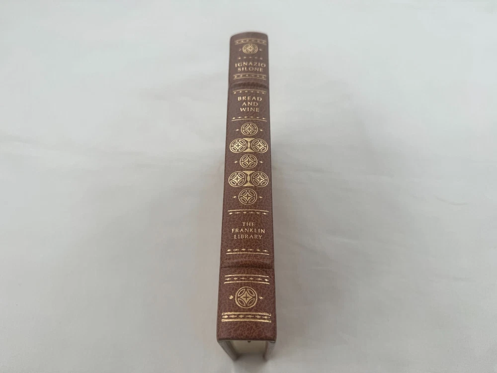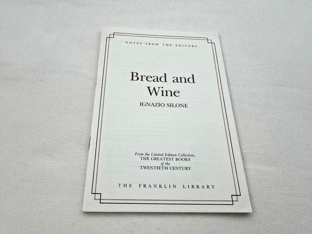 From the Greatest Books of the 20th Century Franklin Library Collection... Bread and Wine by Ignazio Silone Illustrated by Ronald Keller Copyright 1980 by The Franklin Library A Limited Edition Premium Full Leather Binding This volume contains all of these classic Franklin Library trimmings: Premium Leather Binding Silk Moire Endleaves Distinctive Cover Design Hubbed Spine, Accented in Gold Satin Ribbon Page Marker Gilded Page Edges Long-lasting, High Quality Acid-neutral Paper Beautiful Illustrations A very scarce title in any condition, this 1980 Limited Edition is in Absolute Mint and Unread condition. The front and back covers are in Perfect condition with very faint wear along the bottom board edges and the gilded page edges show no wear at all! The binding is tight and square without spine lean. There are no markings, bookplates, or other signs of prior ownership in this book. This book is part of the Great Books of the Twentieth Century collection published by the Franklin Library and comes complete with the Notes from the Editors. It would be a beautiful addition to your Franklin Library book collection. Overall, this copy is a grade collector's book. This book is very elusive in this superior condition, as only a limited number of them were ever published, so now is the time to act. Hopefully you can add this book to your collection and enjoy it in the years to come... Please Email Me With Any Questions You Might Have! Shipping Info: Buyer to Pay Shipping and Handling International Bidders Pay Extra Shipping Good luck and happy bidding!