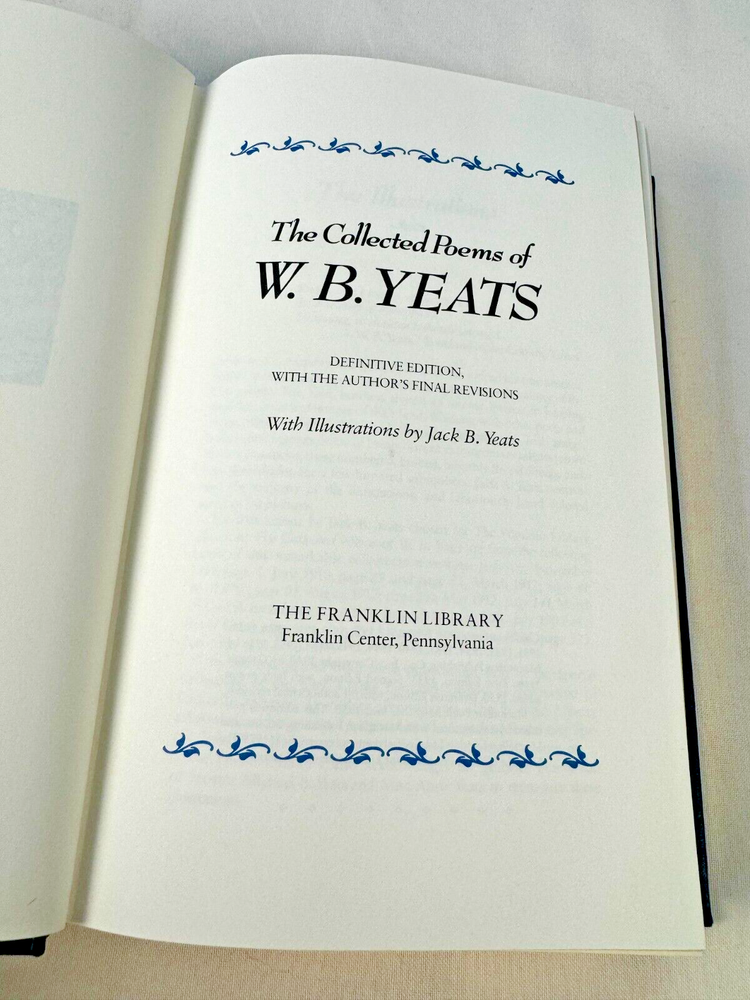 From the Franklin Library Collection... The Collected Poems of W. B. Yeats Illustrated by Jack B. Yeats Copyright 1979 by The Franklin Library Bound in Premium Full Leather This volume contains all of these classic Franklin Library trimmings: Premium Leather Binding Decorated Endleaves Distinctive Cover Design Hubbed Spine, Accented in Gold Satin Ribbon Page Marker Gilded Page Edges Long-lasting, High Quality Acid-neutral Paper Beautiful Illustrations DESCRIPTION A very scarce title in any condition, this 1979 First Edition is in near Fine and Unread condition. The front and back covers are in near Fine condition and the gilded page edges show hardly any wear at all! There are no markings, bookplates, or other signs of prior ownership in this book. This Edition was published by The Franklin Library and would be a beautiful addition to your Franklin Library book collection. Overall, this copy is a grade collector's book. This book is very elusive in this superior condition, as only a limited number of them were ever published, so now is the time to act. Hopefully you can add this book to your collection and enjoy it in the years to come... SHIPPING POLICY We take great care packaging every item to ensure safe shipment to you. Items are packaged using plenty of bubble wrap and packaged securely in a sturdy box. Our secure shipping methods have resulted in zero damaged items in over 15 years! Items are shipped out within 1 - 3 days of payment being received. RETURN & REFUND POLICY We accept refunds within 30 days of purchase. If you are not 100% satisfied with your purchase, please contact us about a refund, or initiate a refund through eBay. CONTACT US We are committed to providing our customers with the best possible on-line shopping experience. This includes a commitment to excellent customer service, before you purchase as well as after your order has been delivered. Please feel free to submit any questions or inquiries regarding this item or your order by sending us a message through the eBay messaging system. We will typically respond within 24 hours of receiving your message.