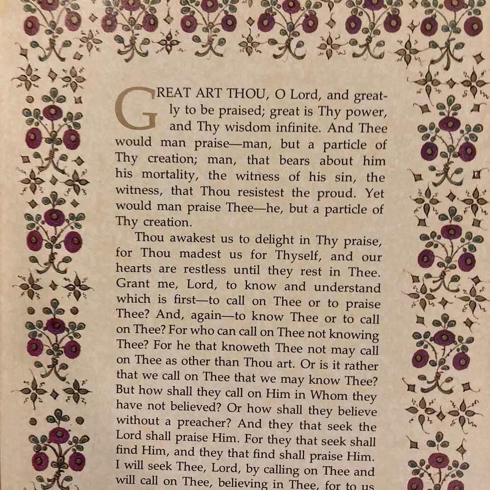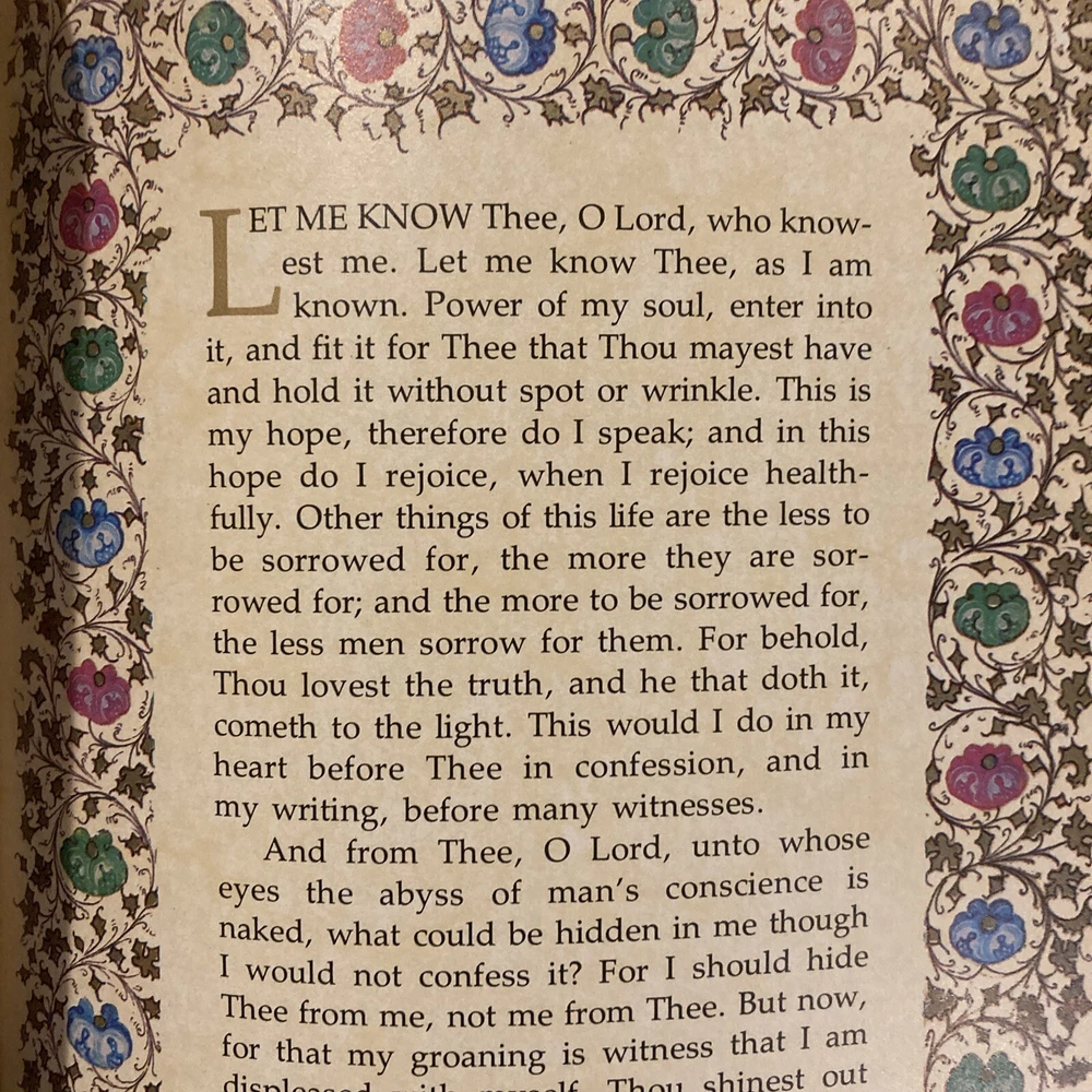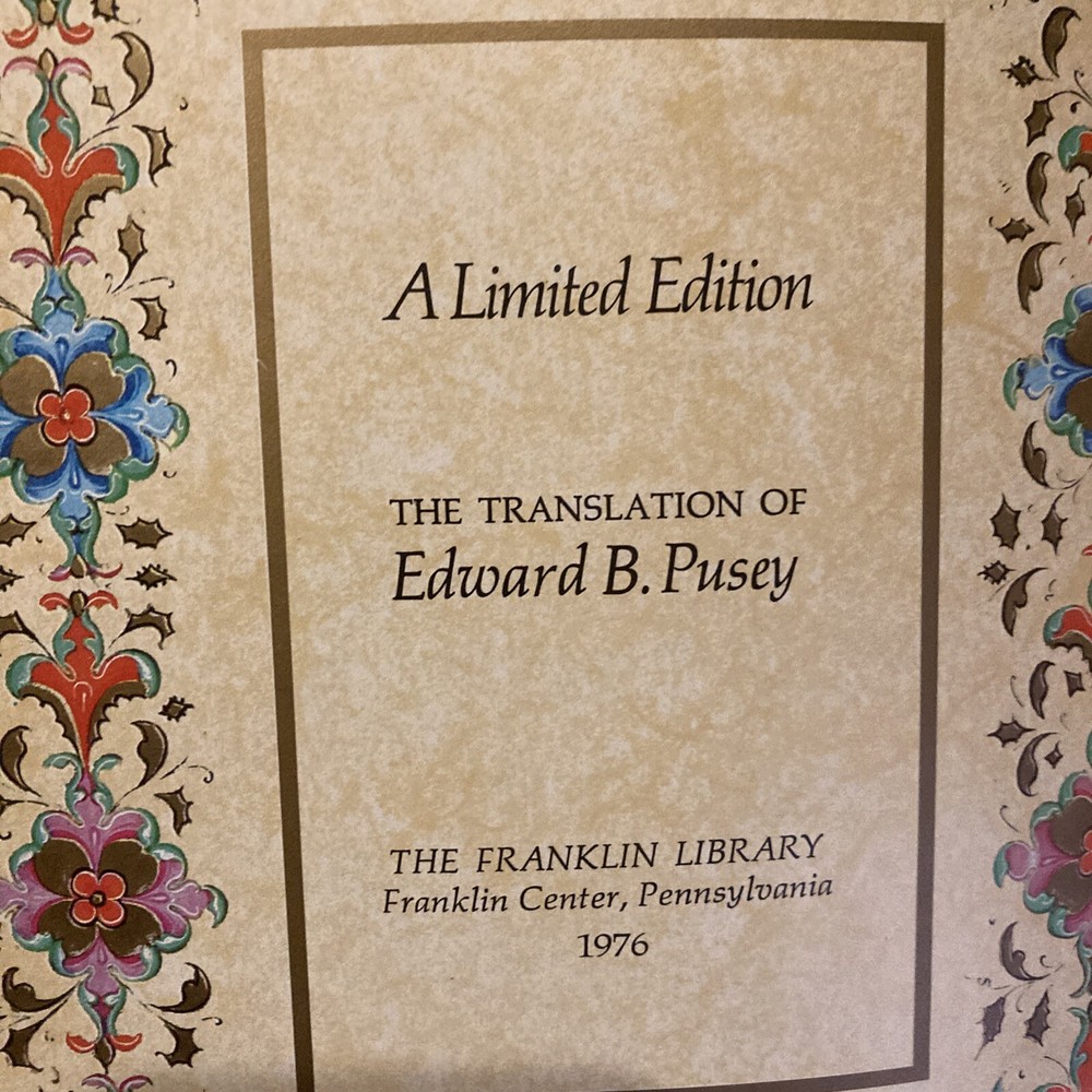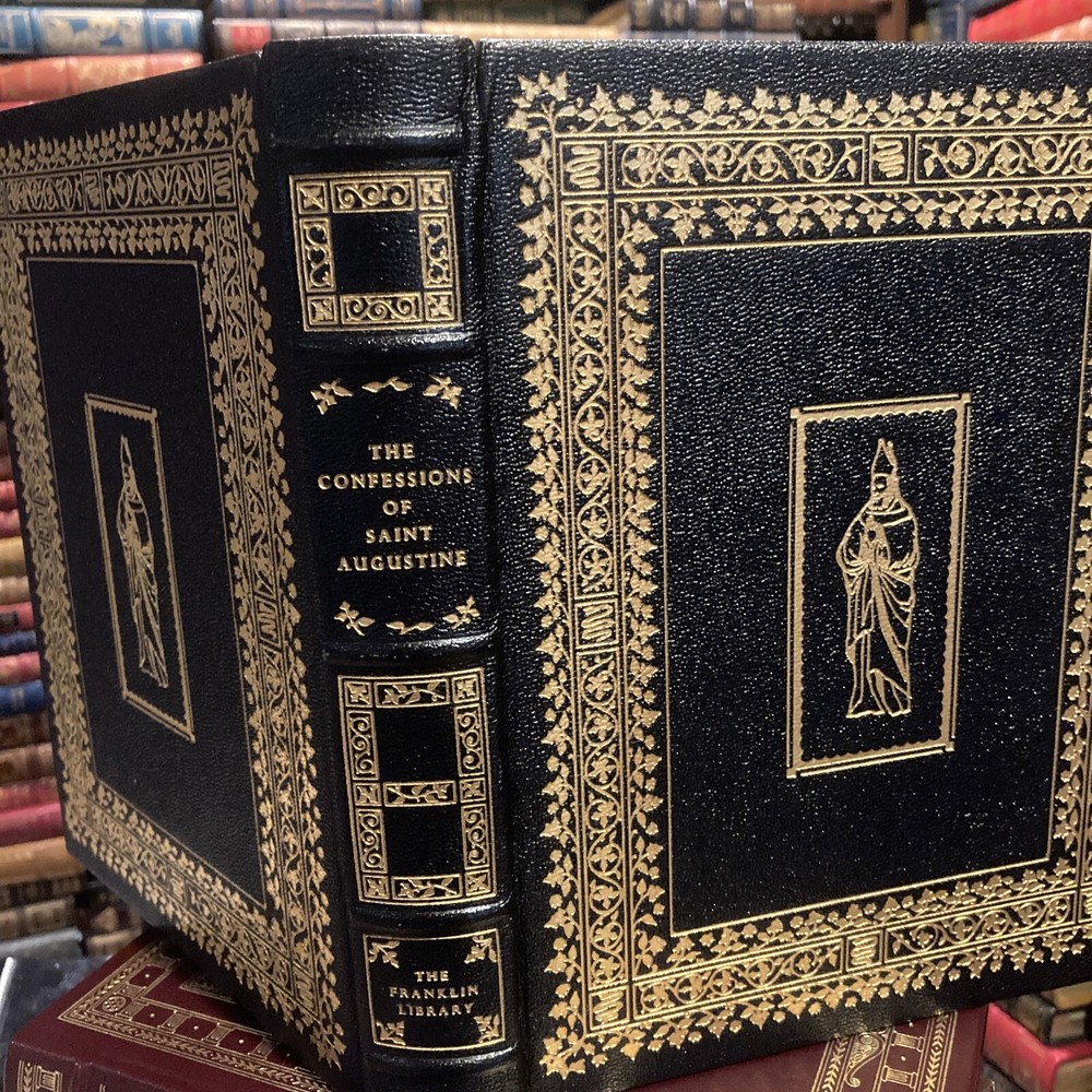 Franklin Library leather edition of "The Confessions of Saint Augustine," a Limited edition, Translated by Edward B. Pusey, Illustrated by two medieval Italian artists: Giovanni dei Grassi and Belbello da Pavia, one of the 100 GREATEST BOOKS OF ALL TIME series, published in 1976. Bound in deep, deep hunter green leather, the book has purple French moire silk end leaves, satin book marker, acid-free paper, Symth-sewn binding, hubbed spine, gold gilding on three edges---in near FINE condition---except for fading on edges of moire silk. Augustine of Hippo, who lived from 3 54 – 430, was also known as Saint Augustine; he was a theologian and philosopher in Roman North Africa . His writings influenced the development of Western Philosophy and Western Christianity , and he is viewed as one of the most important Church Fathers of the Latin Church. According to his contemporary, JEROME , Augustine "established anew the ancient Faith." In his youth he was drawn to the eclectic Manichaean faith , and later to the Hellenistic philosophy of Neoplatonism. After his conversion to Christianity and baptism in 386, Augustine developed his own approach to philosophy and theology, accommodating a variety of methods and perspectives. Believing the grace of Christ was indispensable to human freedom, he helped formulate the doctrine of original sin. Augustine imagined the Church as a spiritual City of God . His thoughts profoundly influenced the medieval worldview. Augustine is recognized as a saint in the Catholic Church , and the Anglican Communion. His memorial is celebrated on 28 August, the day of his death. Augustine is the patron saint of brewers, printers, theologians, and a number of cities and dioceses. Many Protestants, especially Calvinists and Lutherans , consider him one of the theological fathers of the Protestant Reformation due to his teachings on salvation and divine grace. MARTIN LUTHER in particular, held Augustine in preeminence among early Church Fathers. The historian Diarmaid MacCulloch has written: "Augustine's impact on Western Christian thought can hardly be overstated; only his beloved example, PAUL of TARSUS , has been more influential, and Westerners have generally seen Paul through Augustine's eyes. In Book X, Augustine prays: "Let me know Thee, O Lord, who knowest me: let me know Thee, as I am known." 312 pages----a Gorgeous leather book! I offer Combined shipping.
