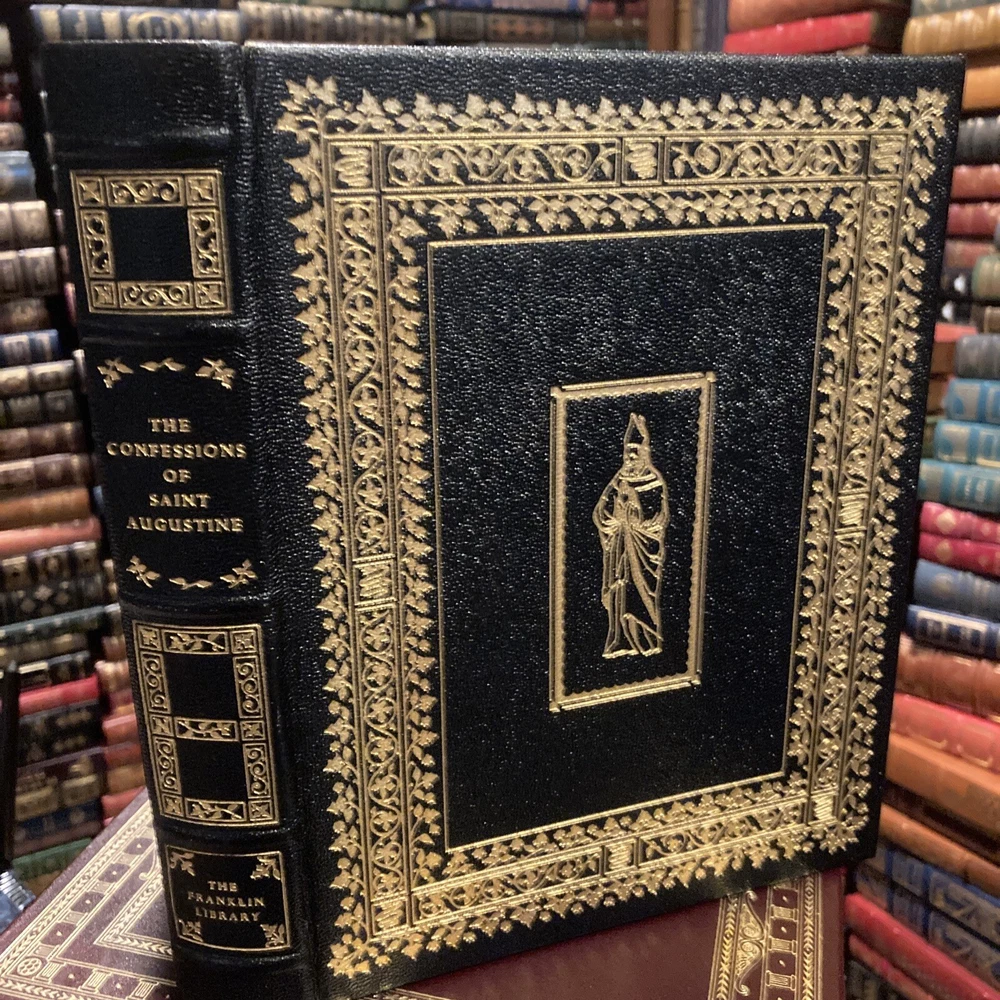 This stunning Franklin Library edition of *Confessions of Saint Augustine* is a true collector's gem. The rich hunter green leather, gold gilding, and medieval illustrations create an exquisite presentation. The Smyth-sewn binding and silk end leaves ensure durability, while the near-fine condition makes it a prized addition to any library. A timeless masterpiece in a luxurious format!