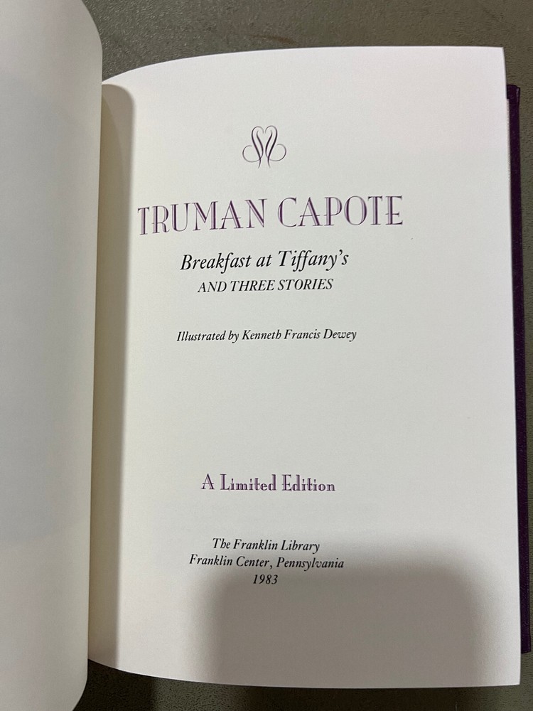Capote, Truman - Breakfast at Tiffany's and Other 3 Stories Franklin Library Collected Stories of the World's Greatest Writers Series Excellent Condition ! New Books get listed daily !!! 100s of Easton Press and Franklin Library books available!! All books get cleaned with a leather cleaner to remove any dust, odor and restore the beauty of leather!! Combined Shipping Discount: USA buyers - every book $1 off International combined shipping: 1 or 2 books - $45 3 or 4 books - $75 5 + books $17 per book 10+ books $13 per book WE SHIP DAILY!! RETURNS: Hassle-Free 30-days return policy and we pay for a return !! Check our Inventory (Link to eBay Store): http://stores.ebay.com/EastonFranklinBooks