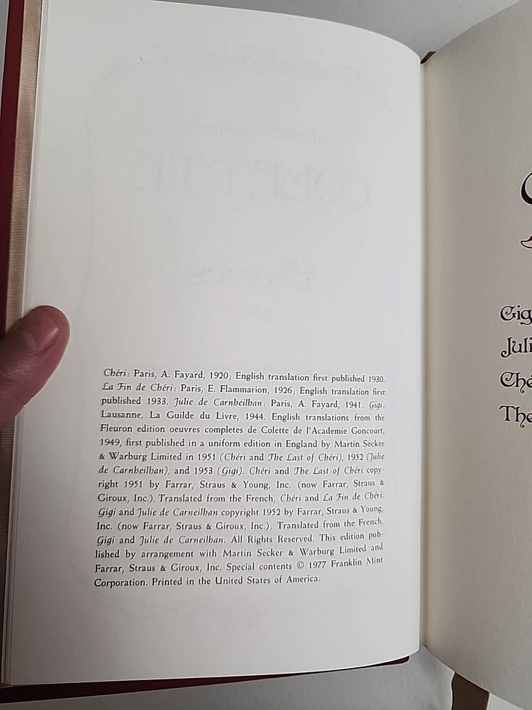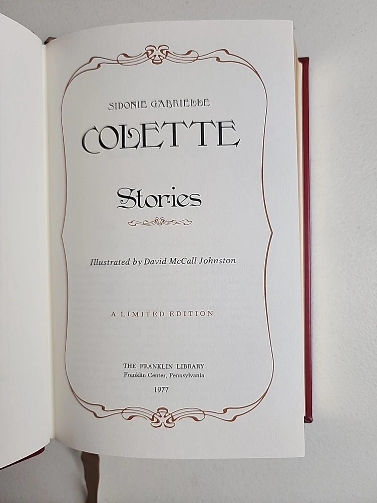 This limited edition book from Franklin Library features the collected stories of Colette, including the popular works Gigi and Cheri. The book is beautifully bound in leather and illustrated by David McCall Johnston. The book measures 5.875 x 8.875 inches with a width of 1.625 inches and weighs 34 ounces. It was printed in English in 1977 and is an original edition. This book is a must-have for any collector of literature and fiction, especially those interested in classics. Book will be shipped media mail in a box