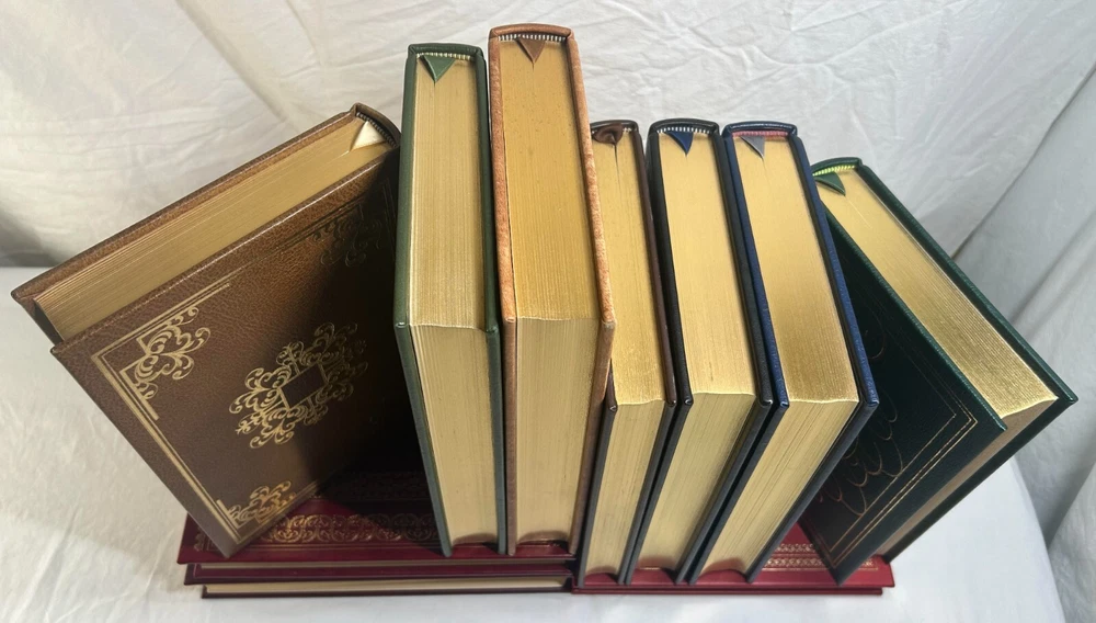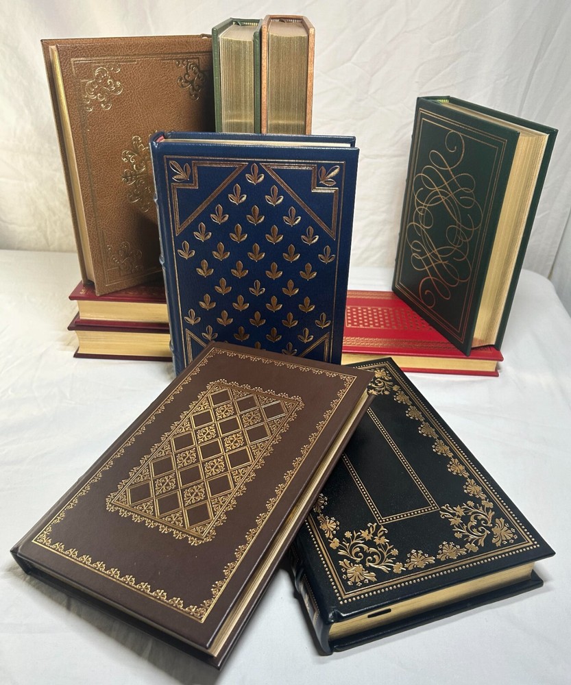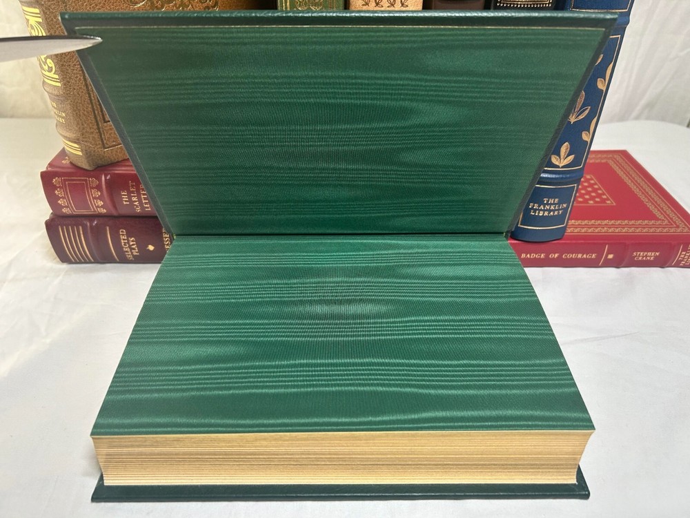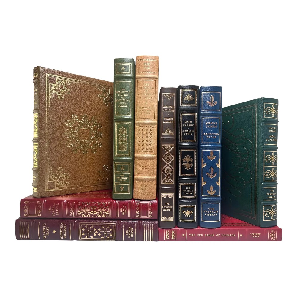 1970s Vintage Franklin Library Collection Limited Edition Leather Books - Set of 10 Books. Offered is a fine collection of (10) Franklin Library books; includes limited edition classic books from 'The 100 Greatest Masterpieces of American Literature’ collection. Each book is fully leather bound with beautiful covers and contain gorgeous and rich silk moire endpapers. Accented in 22k gold. Measures: 1-1.75 (14.5 overall) W x 5.75-6.75 D x 8.25-9.75 H inches. Approx. total weight: 20 pound, 5 ounces. The 100 Greatest Masterpieces of American Literature. The Thurber Carnival – James Thurber – 1978 The Scarlet Letter – Nathaniel Hawthorne – 1976 Maine Street – Sinclair Lewis – 1978 The Collected Stories – Katherine Anne Porter – 1981 The Frontier in American History – Frederick Jackson Turner – 1977 Absalom, Absalom! – William Faulkner – 1978 Selected Plays – Tennessee Williams — 1977 The Red Badge of Courage — Stephen Crane – 1976 Selected Tales – Henry James – 1979 Moll Flanders – Daniel Defoe - 1978