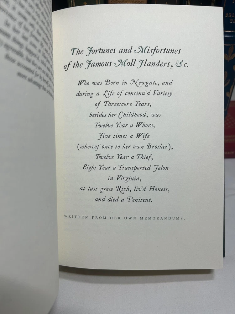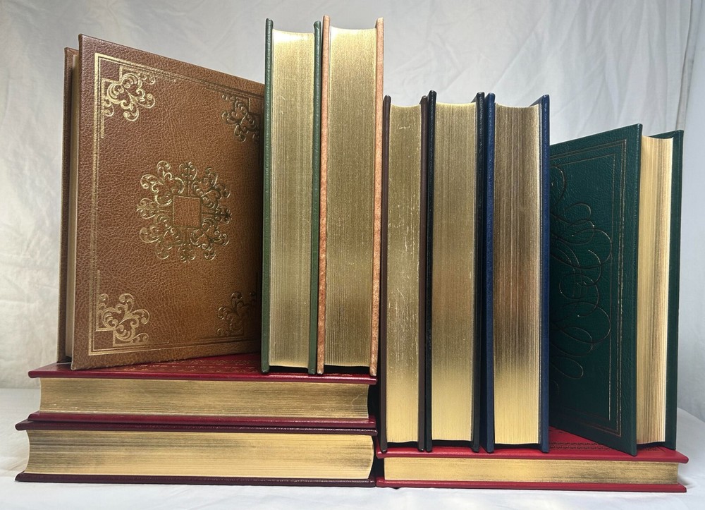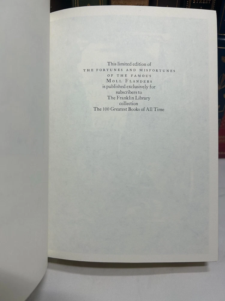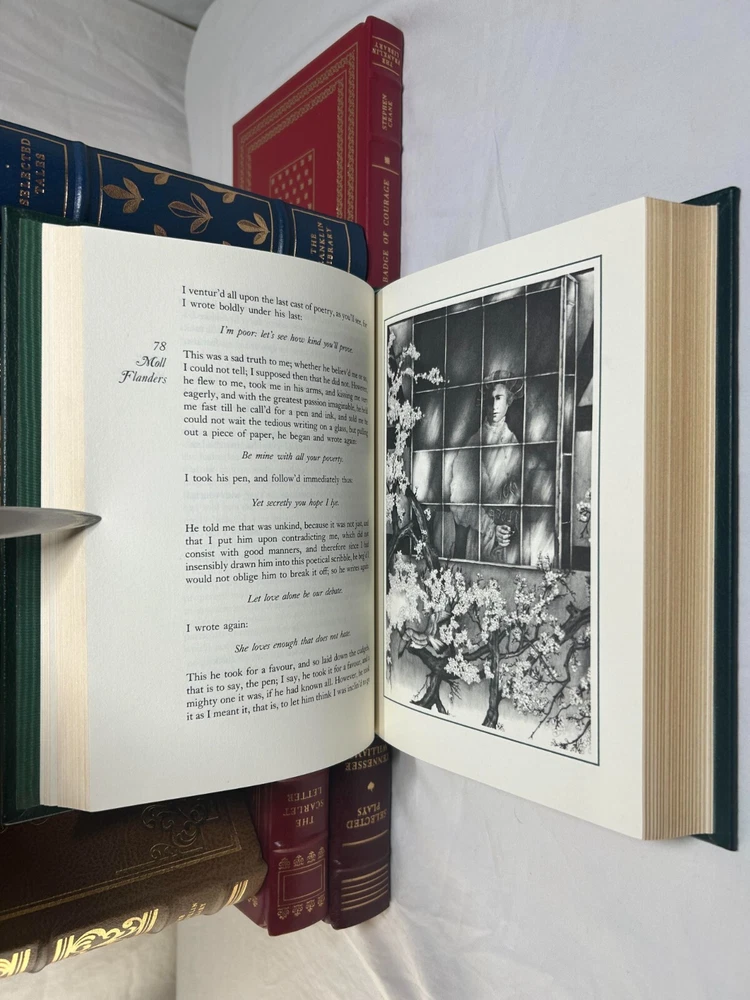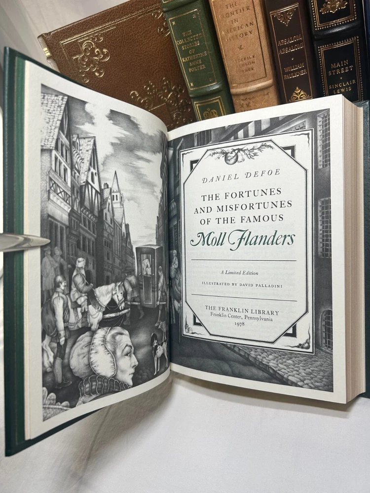 1970s Vintage Franklin Library Collection Limited Edition Leather Books - Set of 10 Books. Offered is a fine collection of (10) Franklin Library books; includes limited edition classic books from 'The 100 Greatest Masterpieces of American Literature’ collection. Each book is fully leather bound with beautiful covers and contain gorgeous and rich silk moire endpapers. Accented in 22k gold. Measures: 1-1.75 (14.5 overall) W x 5.75-6.75 D x 8.25-9.75 H inches. Approx. total weight: 20 pound, 5 ounces. The 100 Greatest Masterpieces of American Literature. The Thurber Carnival – James Thurber – 1978 The Scarlet Letter – Nathaniel Hawthorne – 1976 Maine Street – Sinclair Lewis – 1978 The Collected Stories – Katherine Anne Porter – 1981 The Frontier in American History – Frederick Jackson Turner – 1977 Absalom, Absalom! – William Faulkner – 1978 Selected Plays – Tennessee Williams — 1977 The Red Badge of Courage — Stephen Crane – 1976 Selected Tales – Henry James – 1979 Moll Flanders – Daniel Defoe - 1978