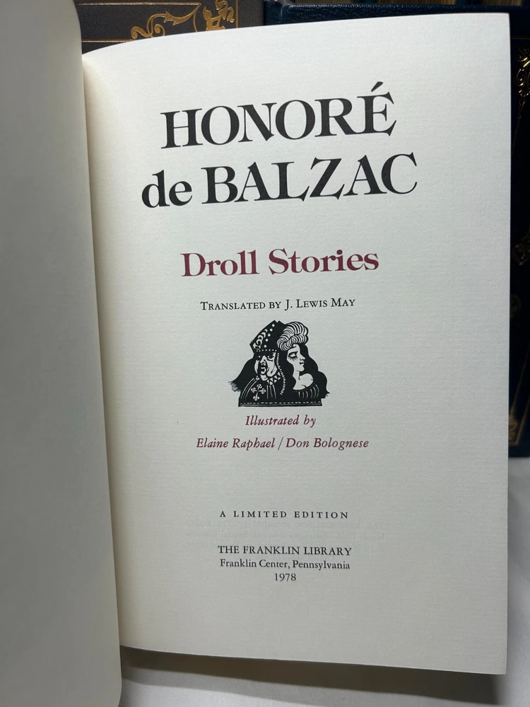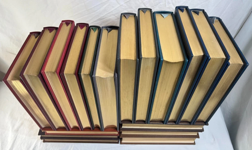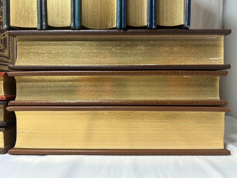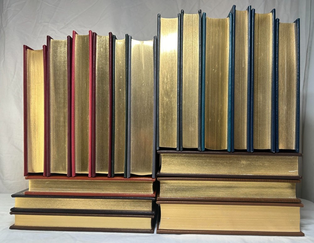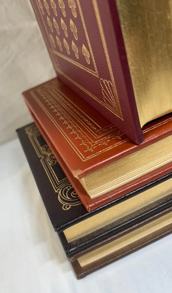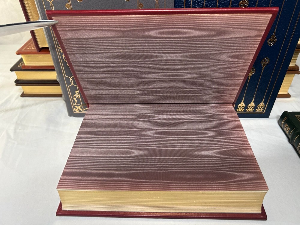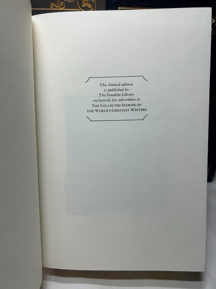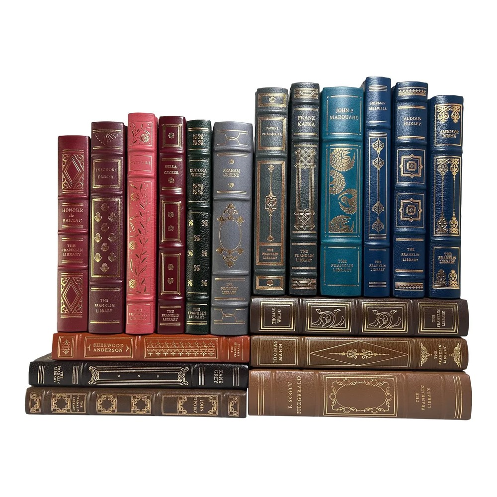 1970s Vintage Franklin Library Collection Limited Edition Leather Books - Set of 18 Books. Offered is a fine collection of (18) Franklin Library books; includes limited edition classic books from 'Collected Stories of the World's Greatest Writers’ collection. Each book is fully leather bound with beautiful covers and contain gorgeous and rich silk moire endpapers. Accented in 22k gold. Measures: 1.25-2 (27.5 overall) W x 6.5-6.75 D x 8.5-9.75 H inches. Approx. total weight: 35 pound, 10 ounces. Collected Stories of the World's Greatest Writers Stories -- Franz Kafka – 1980 Moon Lake, Other Stories – Eudora Welty – 1980 The Best Short Stories – Theodore Dreiser –1980 The Troll Garden, Obscure Destinies --Willa Cather – 1981 Billy Budd, Sailor – The Piazza Tales – Herman Melville –1978 Pigeon Feathers, Other Stories – John Updike – 1981 The Ranger, Other Stories – Zane Grey – 1979 From Death to Morning – Thomas Wolfe –1979 Candide and Zadig – F.A. Arouet – 1977 Collected Short Stories -- Aldous Huxley -- 1981 Winesburg, Ohio -- Sherwood Anderson – 1980 Droll Stories – Honore de Balzac – 1978 Kiss Me Again, Stranger – Daphne du Maurier – 1981 Stories – Thomas Mann – 1978 In the Midst of Life, Tales of Soldiers and Civilians – Ambrose Bierce – 1979 This Gun for Hire, The Confident Agent, The Ministry of Fear – Graham Green – 1978 Mr. Moto’s, Three Aces – John P. Marquand – 1980 Stories – F. Scott Fitzgerald – 1977