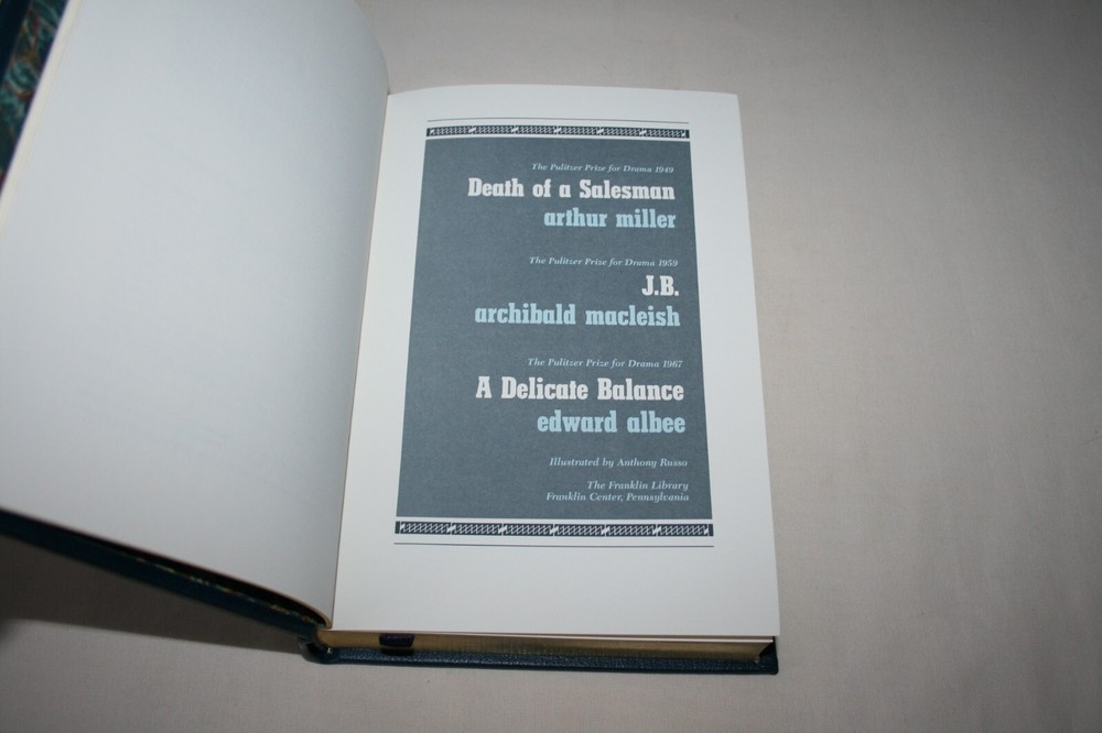 From the Franklin Library Pulitzer Collection... Death of a Salesman by Arthur Miller J.B. by Archibald MacLeish and A Delicate Balance by Edward Albee Illustrated by Anthony Russo Copyright 1986 by The Franklin Library Premium Full Leather Binding This volume contains all of these classic Franklin Library trimmings: Premium Leather Binding Decorated Endleaves Distinctive Cover Design Hubbed Spine, Accented in Gold Satin Ribbon Page Marker Gilded Page Edges Long-lasting, High Quality Acid-neutral Paper Beautiful Illustrations A very scarce title in any condition, this 1986 Edition is in Absolute Mint and Unread condition. The front and back covers are in Perfect condition and the gilded page edges show no wear at all! There are no markings, bookplates, or other signs of prior ownership in this book. This Pulitzer Edition was published by The Franklin Library and would be a beautiful addition to your Franklin Library book collection. Overall, this copy is a grade collector's book. This book is very elusive in this superior condition, as only a limited number of them were ever published, so now is the time to act. Hopefully you can add this book to your collection and enjoy it in the years to come... Please Email Me With Any Questions You Might Have! Shipping Info: Buyer to Pay Shipping and Handling International Bidders Pay Extra Shipping Seller Not Responsible For Uninsured Items Lost or Damaged in Mail Forms of Payment Accepted: Paypal Good luck and happy bidding! Powered by eBay Turbo Lister The free listing tool. List your items fast and easy and manage your active items.