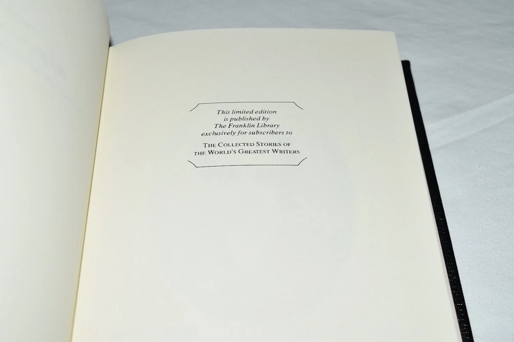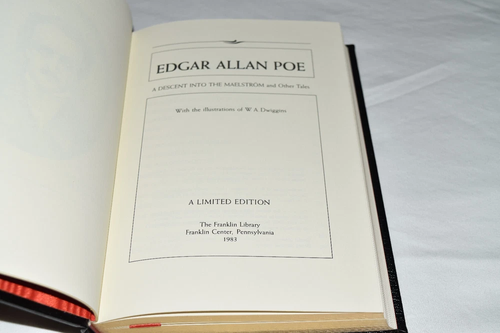 From the Franklin Library World's Greatest Writers Collection... A Descent Into the Maelstrom and Other Tales by Edgar Allen Poe Illustrated by W. A. Dwiggins Copyright 1983 by The Franklin Library Premium Full Leather Binding This volume contains all of these classic Franklin Library trimmings: Premium Leather Binding Silk Moire Endleaves Distinctive Cover Design Hubbed Spine, Accented in Gold Satin Ribbon Page Marker Gilded Page Edges Long-lasting, High Quality Acid-neutral Paper Beautiful Illustrations A very scarce title in any condition, this 1983 edition is in Fine condition. The front and back covers are in terrific condition and the gilded page edges show hardly any wear (see pictures of all sides). There are no markings, bookplates, or other signs of prior ownership in this book. This World's Greatest Writers Edition was published by The Franklin Library and would be a beautiful addition to your Franklin Library book collection. Overall, this copy is a grade collector's book. This book is very elusive in this superior condition, as only a limited number of them were ever published, so now is the time to act. Hopefully you can add this book to your collection and enjoy it in the years to come... Please Email Me With Any Questions You Might Have! Shipping Info: Buyer to Pay Shipping and Handling International Bidders Pay Extra Shipping Seller Not Responsible For Uninsured Items Lost or Damaged in Mail Forms of Payment Accepted: Paypal Good luck and happy bidding! Powered by eBay Turbo Lister The free listing tool. List your items fast and easy and manage your active items.