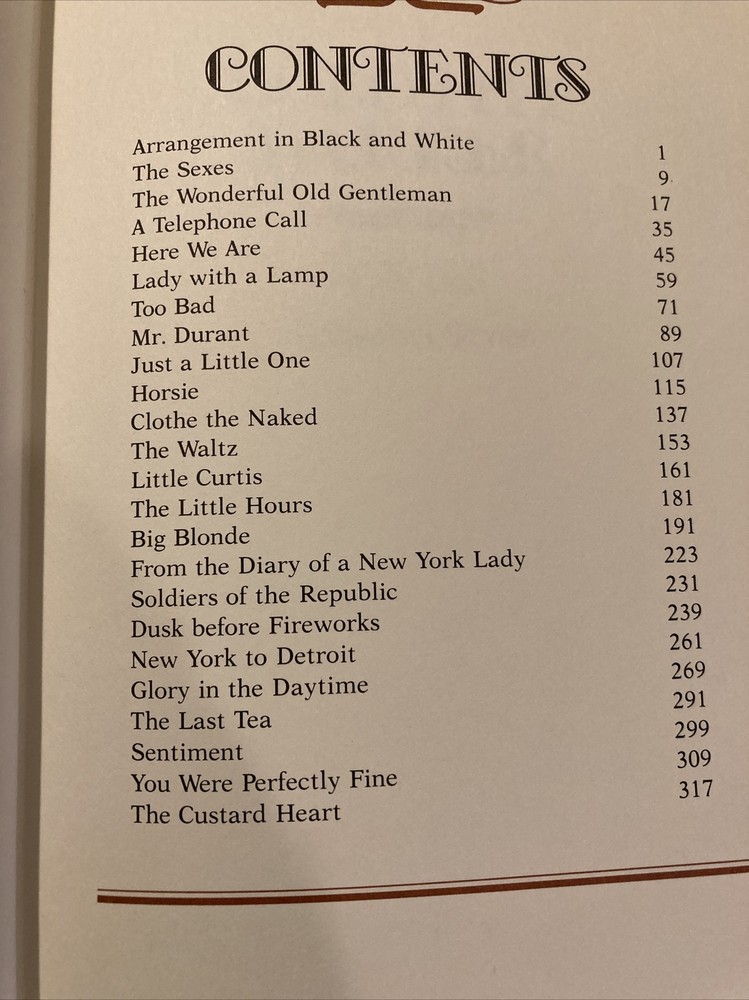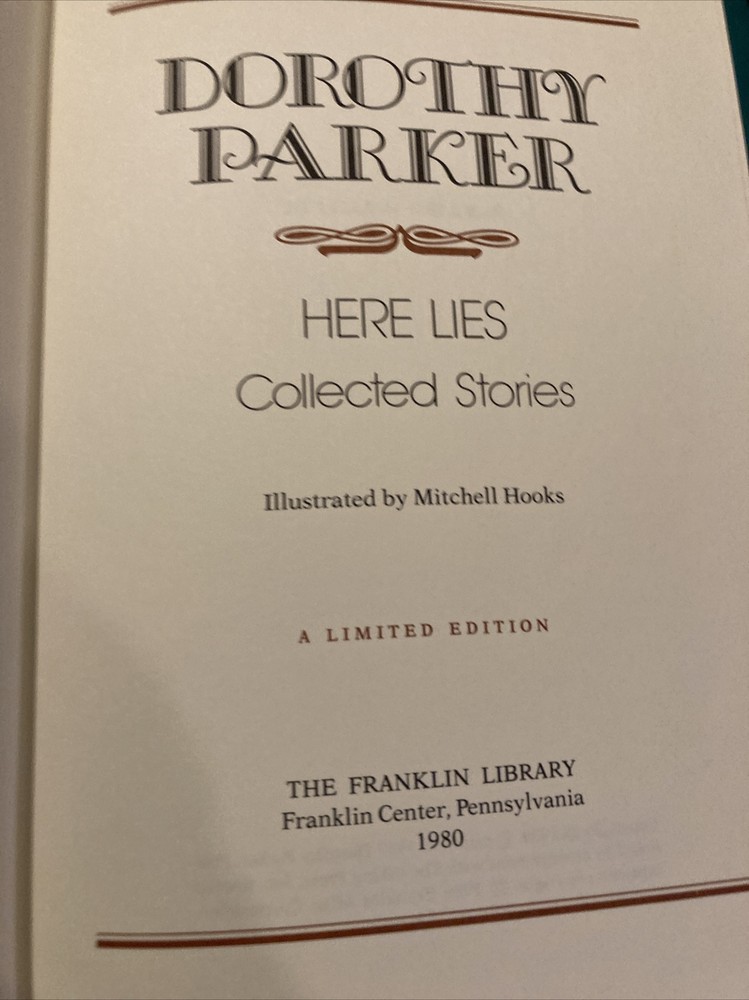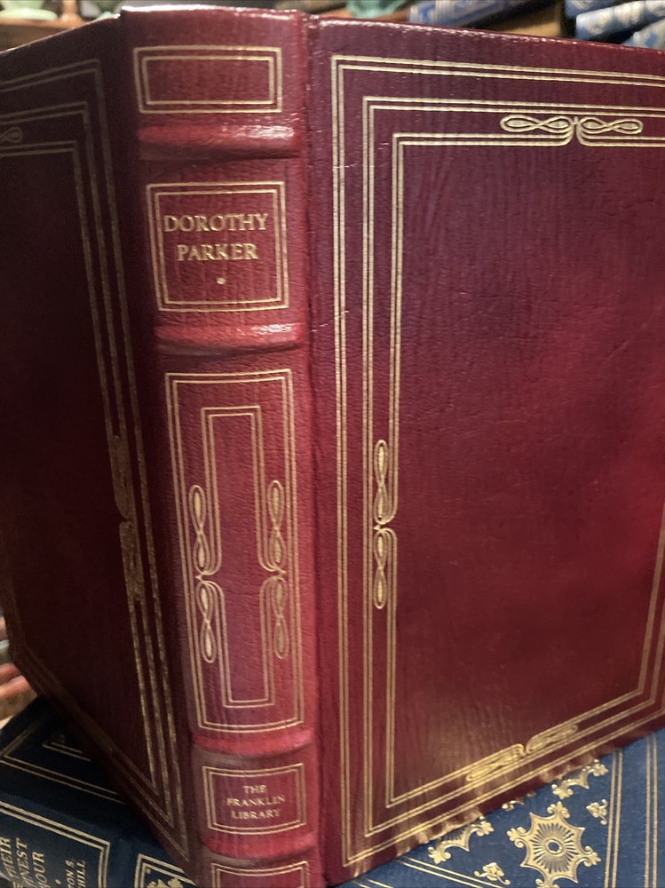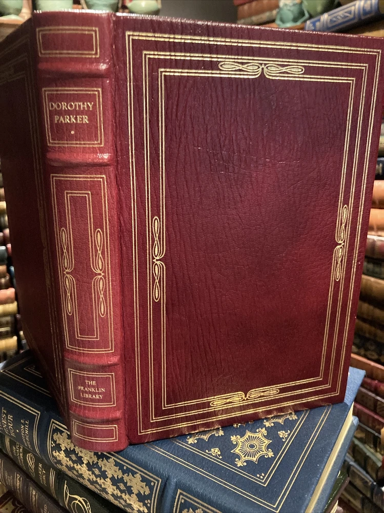 Franklin Library leather edition of Dorothy Parker's "Here Lies Collected Stories," a Limited edition, Illustrated by Mitchell Hooks, one of the COLLECTED STORIES OF THE WORLD'S GREATEST WRITERS series, published in 1980. Bound in a burgundy leather, the book has burgundy French moire silk end leaves, acid-free paper, Symth-sewn binding, hubbed spine, satin book marker, gold gilding on three edges---in near FINE condition---except for 'very minor' fading on the spine. Dorothy Parker, who lived from 1893--1967, was an American poet, writer, critic, and satirist based in New York. She was known for her wisecracks, and eye for 20th Century urban foibles. From a conflicted and unhappy childhood, Parker rose to acclaim both for her literary works published in magazines, such as the New Yorker and as a founding member of the Algonquin Round Table. Later she moved to Hollywood and wrote screenplays. She was placed on the Hollywood 'blacklist' for her involvement in "left wing" politics. Stories include: ARRANGEMENTS IN BLACK AND WHITE, THE SEXES, THE WONDERFUL OLD GENTLEMAN, A TELEPHONE CALL, LADY WITH A LAMP, TOO BAD, JUST A LITTLE ONE, MR. DURANT, HORSIE, CLOTHE THE NAKED, THE WALTZ, LITTLE CURTIS, THE LITTLE HOURS, BIG BLONDE, FROM THE DIARY OF A NEW YORK LADY, SOLDIERS OF THE REPUBLIC, DUSK BEFORE FIREWORKS, NEW YORK TO DETROIT, GLORY IN THE DAYTIME, THE LAST TEA, SENTIMENT, YOU WERE PERFECTLY FINE, AND THE CUSTARD HEART. 329 Pages. I offer combined shipping.
