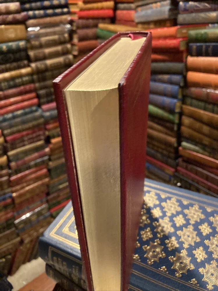 This stunning Franklin Library edition of Dorothy Parker’s *Here Lies* is a collector’s dream! The rich burgundy leather, gold gilding, and silk end leaves make it feel luxurious, while Mitchell Hooks’ illustrations add charm. The Smyth-sewn binding ensures durability, and the near-fine condition—just slight spine fading—makes it a fantastic find. Parker’s sharp wit shines in these stories, making this a must-have for literature lovers. A true gem!
