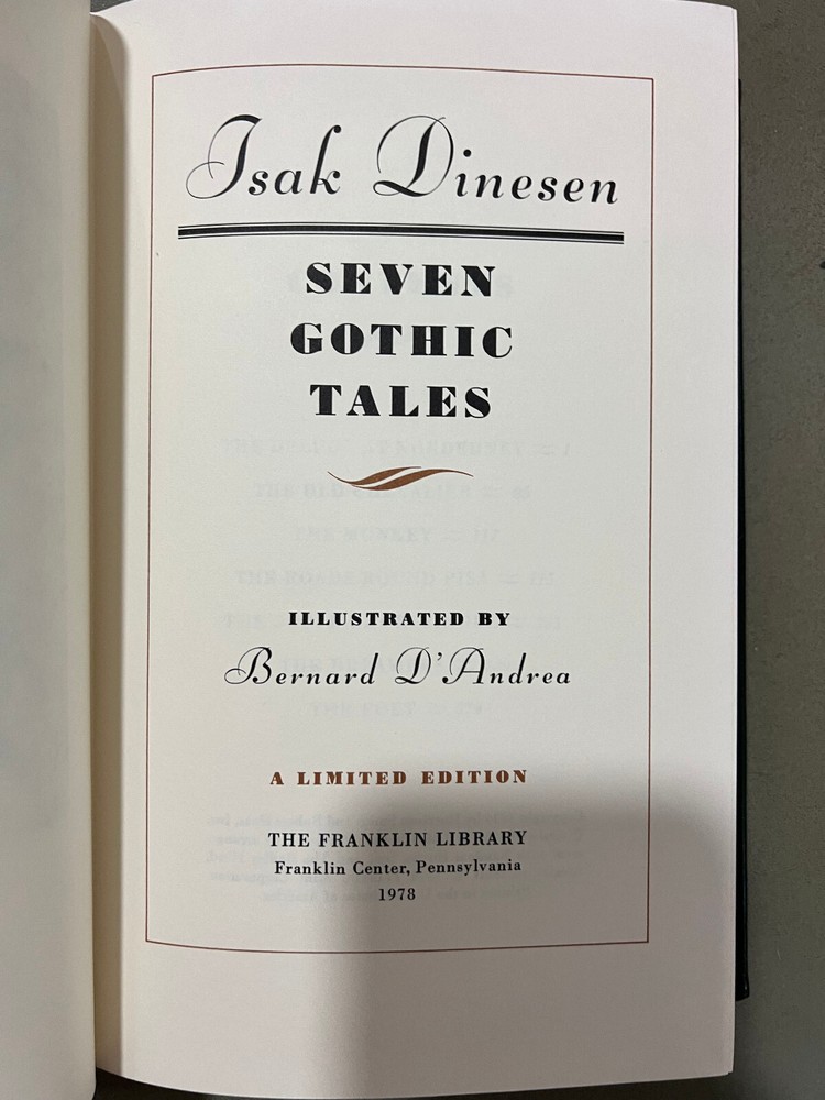 Dinesen, Isak - Seven Gothic Tales Franklin Library Collected Stories of the World's Greatest Writers Series Excellent Condition ! New Books get listed daily !!! 100s of Easton Press and Franklin Library books available!! All books get cleaned with a leather cleaner to remove any dust, odor and restore the beauty of leather!! Combined Shipping Discount: USA buyers - every book $1 off International combined shipping: 1 or 2 books - $45 3 or 4 books - $75 5 + books $17 per book 10+ books $13 per book WE SHIP DAILY!! RETURNS: Hassle-Free 30-days return policy and we pay for a return !! Check our Inventory (Link to eBay Store): http://stores.ebay.com/EastonFranklinBooks