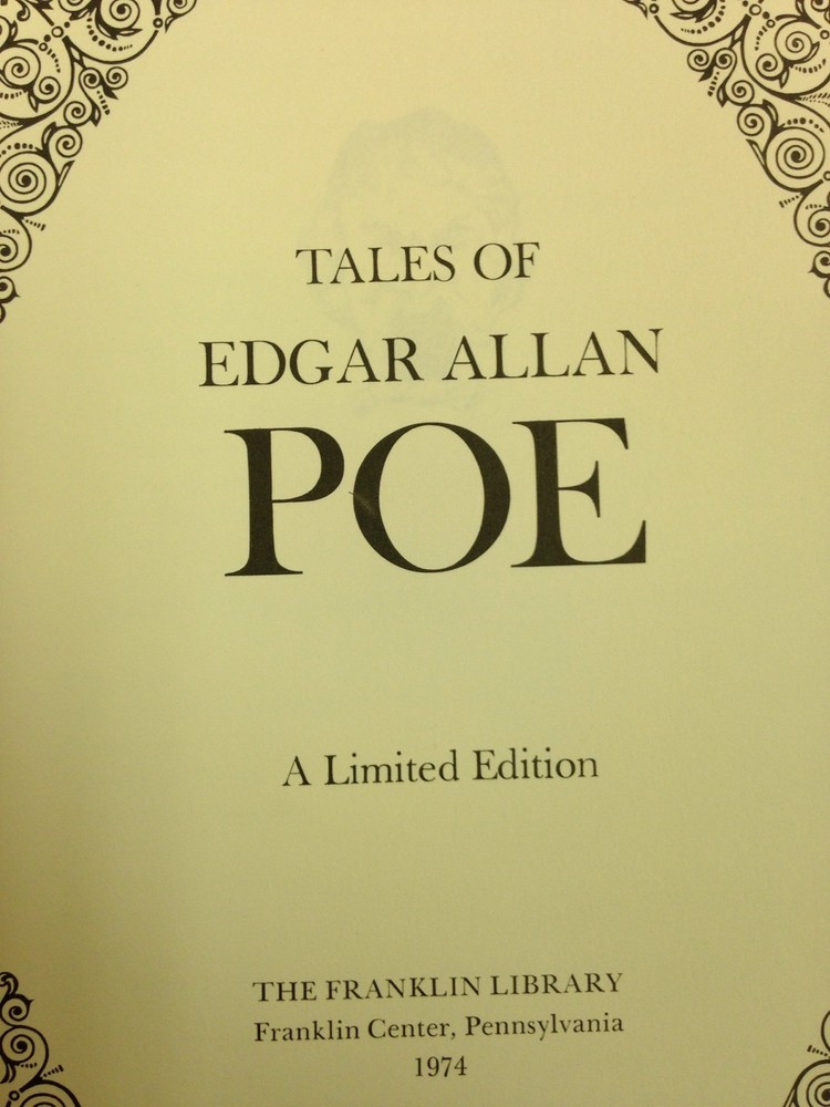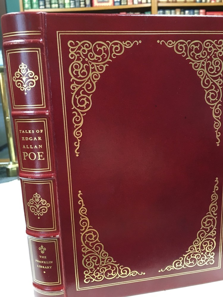 Franklin Library leather edition of "Tales of Edgar Allan Poe," a Limited edition, one of the 100 GREATEST BOOKS OF ALL TIME series, published in 1974. Bound in smooth red leather, the book has ivory moire silk end leaves, acid-free paper, Symth-sewn binding, a satin book marker, hubbed spine, gold gilding on three edges---in near FINE condition—-a Gorgeous leather! Edgar Allan Poe, who lived from 1809 – 1849, was an American author and poet who was best known for his tales of mystery and the macabre. "Tales" include: "The Pit and the Pendulum," "The Tell-Tale Heart," "A Descent into the Maelstrom," "The Black Cat," "The Fall of the House of Usher," "The Cask of Amontillado," "The Gold Bug," "The Purloined Letter," "The Murders in the Rue Morgue," "Ligeia," "King Pest," "Ms. Found in a Bottle," "William Wilson," "Berenice," "The Assignation, " "The Facts in the Case of M. Valdemar," "Hop Frog," "Science---A Fable," "Science---A Parable." I offer Combined shipping.