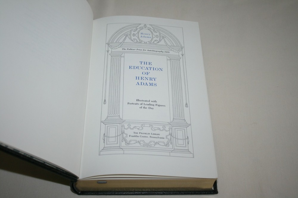 From the Franklin Library World's Pulitzer Collection... The Education of Henry Adams by Henry Adams Illustrated with Portraits of Leading Figures from the Day Copyright 1983 by The Franklin Library Premium Full Leather Binding This volume contains all of these classic Franklin Library trimmings: Premium Full-Leather Binding Silk Moire Endleaves Distinctive Cover Design Hubbed Spine, Accented in Gold Satin Ribbon Page Marker Gilded Page Edges Long-lasting, High Quality Acid-neutral Paper Beautiful Illustrations A very scarce title in any condition, this copy is in Absolute Fine and Unread condition. The front and back covers are both in Perfect condition and the gilded page edges show no wear at all! Aside from a blindstamp on the front end leaf, there are no markings, bookplates, or other signs of prior ownership in this book. This book is part of The Pulitzer Collection published by The Franklin Library. It would be a beautiful addition to your Franklin Library book collection. Hopefully you can add this book to your collection and enjoy it in the years to come... Please Email Me With Any Questions You Might Have! Shipping Info: Buyer to Pay Shipping and Handling International Bidders Pay Extra Shipping Seller Not Responsible For Uninsured Items Lost or Damaged in Mail Forms of Payment Accepted: Paypal Good luck and happy bidding! Powered by eBay Turbo Lister The free listing tool. List your items fast and easy and manage your active items.