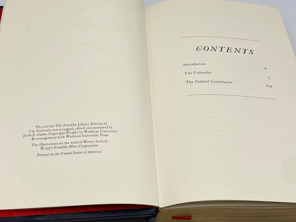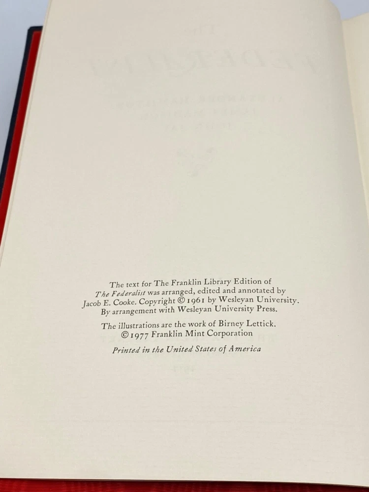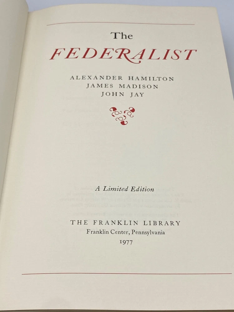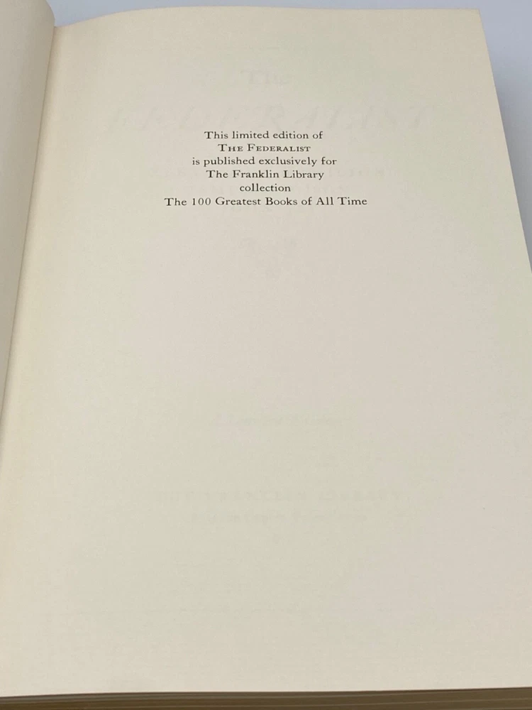 MAKES THE PERFECT GIFT FOR ANY FAN OF AMERICAN HISTORY / AMERICANA / HISTORY OF THE U.S. CONSTITUTION ** PLEASE READ : Mahalo for taking the time to look at our listing. We truly appreciate it. We always do our BEST to give you the most accurate description of these beautiful books. If, however, you have any SPECIFIC questions about the SIZE of the book, NUMBER of pages, TYPE of leather, SMELL or FEEL of the book, PLEASE email us through EBay’s mail system BEFORE you bid, and we will be HAPPY to give you more information. We want you to be completely happy with your purchase and keep you as our customers for years to come!** DESCRIPTION: Franklin Library’s VINTAGE LONG OUT OF PRINT full-leather binding, part of the 100 GREATEST BOOKS EVER WRITTEN. THIS IS A VINTAGE HEIRLOOM FRANKLIN WITH LAVISH DEEP GILT IMPRESSIONS TO THE BOARDS AND SPINE with GORGEOUS VINTAGE ILLUSTRATIONS . IT IS ONE OF THE MOST HIGHLY-PRIZED & MOST BEAUTIFUL EDITIONS OF THIS MASTERPIECE YOU CAN FIND. ORIGINAL NOTES FROM THE EDITORS BOOKLET IS INCLUDED . 🍍 NOT INCLUDED... 😃 ABOUT THE BOOK: The Federalist Papers is a treatise on free government in peace and security. It is the outstanding American contribution to the literature on constitutional democracy and federalism, and a classic of Western political thought. The Federalist Papers were written in support of the ratification of the Constitution. While modern-day readers might see it as inevitable, the Constitution was a revolutionary step. In Philadelphia, the delegates rebelled against the existing Articles of Confederation and looked to the states, not the existing government, for ratification and approval of the new government. Because of the revolutionary nature of the new Constitution, arguments were necessary to rationalize it as a response to new emergencies. After the convention, Tench Coxe became the coordinator in Philadelphia for those who supported the Constitution, while George Mason became the coordinator for New York for those who opposed it. Hundreds and hundreds of letters were written regarding the Constitution; "Cato" and "The Federal Farmer" attacked while "Caeser" replied. Both George Washington and Ben Franklin, probably the two most influential men in the country at the time, supported the Constitution. CONDITION: Book is in LIKE NEW condition for its age (43 YEARS OLD) with only a couple of faint, negligible rubs to the gilt page ends, BARELY worth noting, and one negligible bump to the bottom edge of the front board (SEE PICS FOR BETTER DETAILS). NO ATTACHED BOOKPLATES, WRITING FROM PREVIOUS OWNER, ETC. It is a BEAUTIFUL edition! SHIPPING: FREE to US ADDRESSES ONLY. INTERNATIONAL $ based on location. WE PRIORITY MAIL & PACK VERY WELL. Please check out our other listings of Easton Press, Franklin Library, Limited Editions Club, First Edition Library, Folio Society, Heritage Press, and International Collectors Library editions. WE DO COMBINE SHIPPING IF YOU PURCHASE MORE THAN ONE COPY. Mahalo for looking at our listings! By bidding/purchasing this item, you are helping a very grateful family who sends you our WARMEST ALOHA & MAHALO!