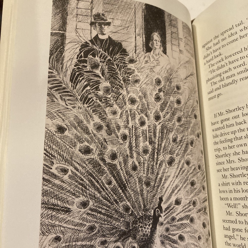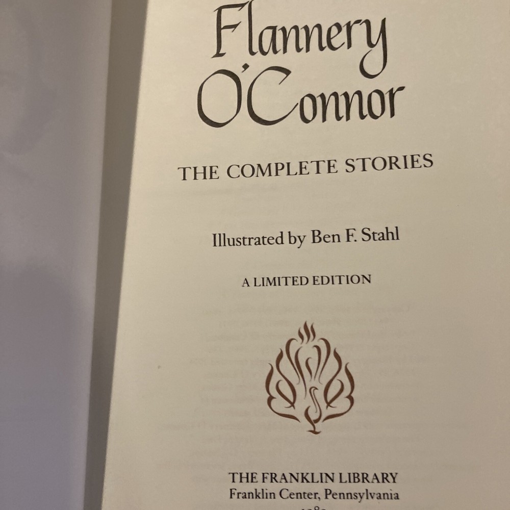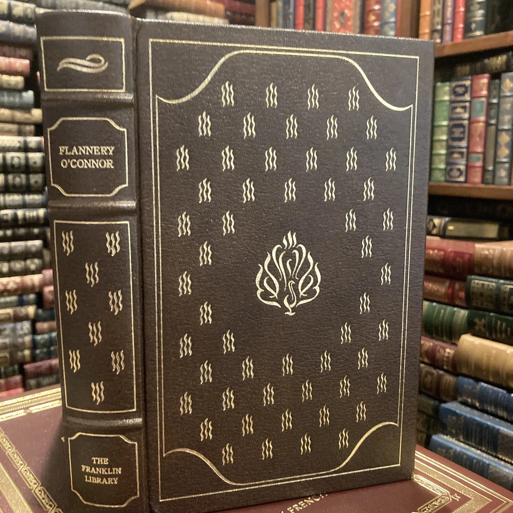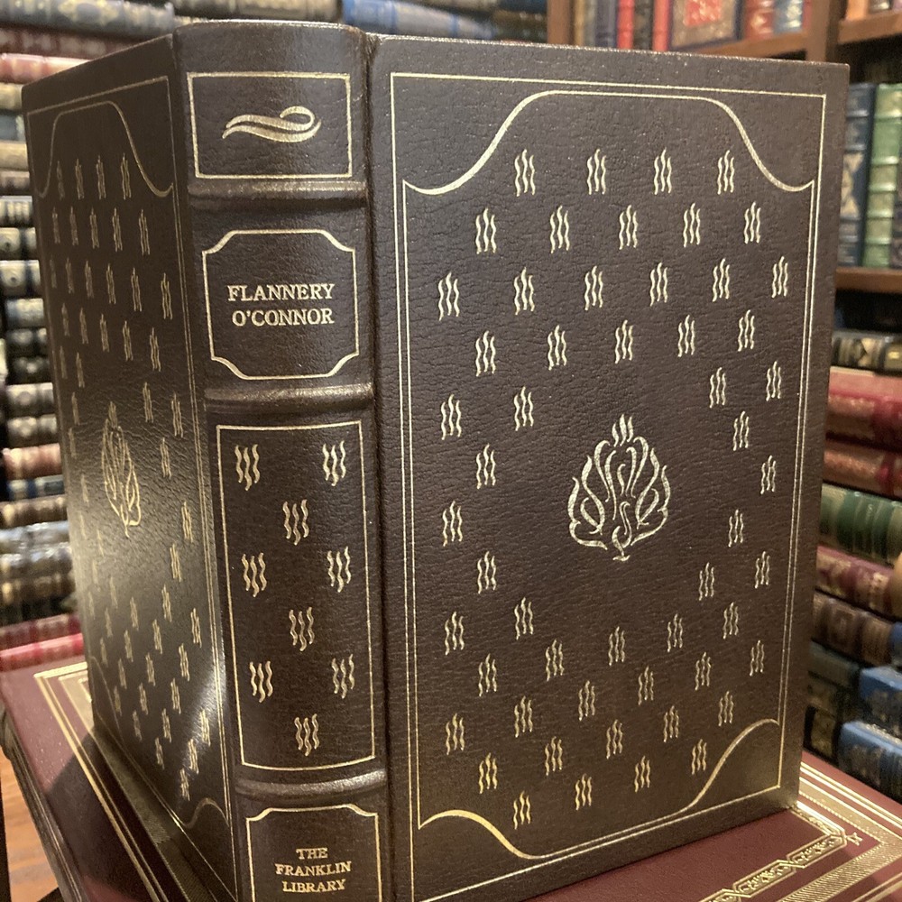 Franklin Library leather edition of Flannery O'Connor's "The Complete Stories," a Limited edition, Illustrated by Ben F. Stahl, Frontispiece portrait of O'Connor by Jill Bossert, one of the COLLECTED STORIES OF THE WORLD'S GREATEST WRITERS series, published in 1980. Bound in brown leather, the book has moire silk end leaves, acid-free paper, Symth-sewn binding, a satin book marker, gold gilding on three edges---in near FINE condition. Mary Flannery O'Connor, who lived from 1925 – 1964, was an American writer and essayist who wrote two novels and 32 short stories. O'Connor was born in SAVANNAH, Georgia, but her when she was five years old her family moved to Milledgeville where she attended Georgia State College for Women. She later received an MA in Creative Writing at the University of Iowa. She lived at Yaddo, the writer's colony in Saratoga Springs where she worked on "Wise Blood. Later she lived in New York City but when she contracted Lupus, she returned to live with her mother in Milledgeville, where her mother operated a dairy. She wrote in a Southern Gothic style and relied heavily on regional settings and grotesque characters: one-legged Bible salesman in "Good Country People;" surly, mean-spirited educated girls, like Mary Grace in "Revelation" or mean ex-prisoners like 'the Misfit" in "A Good Man Is Hard to Find." Her writing also reflected her own Roman Catholic faith, and frequently examined questions of morality and ethics. She wrote ironic, subtly allegorical fiction about deceptively backward Southern characters, usually fundamentalist Protestants, who undergo transformations of character that to her thinking brought them closer to the Catholic mind. The transformation is often accomplished through pain, violence, and ludicrous behavior in the pursuit of the holy. However grotesque the setting, she tried to portray her characters as they might be touched by divine grace. In Milledgeville at her mother's farm, known as Andalusia, she raised and nurtured some 100 peafowl. Despite her sheltered life, her writing reveals an uncanny grasp of the nuances of human behavior. She was a devout Catholic living in the "Bible Belt," the Protestant South. She never married, relying for companionship on her correspondence and close relationship with her mother. This volume has all of her famous short works: "A Good Man Is Hard to Find," "The Geranium," "Wildcat," "The Crop," "The Turkey," "The Peeler," "The Barber," "Wildcat," "The Crop," "The Lame Shall Enter First," "Parker's Back," "Enoch and the Gorilla," "A Temple of the Holy Spirit," "A Circle of Fire," "The Heart of the Park," "A Streak of Good Fortune," "A Temple of the Holy Spirit," "Judgement Day," "Revelation," "The Life You Save May Be Your Own," "The Heart of the Park," "The Turkey," "The River," "Why Do the Heathen Rage?," "The Artificial Nigger," "You Can't Be Any Poorer Than the Dead," "The River," "The Comforts of Home," "A Circle of Fire," "The Displaced Person," "Everything That Rises Must Converge," "A View of the Woods," "The Partridge Festival," "Greenleaf," "The Train"---all of her short works. O'Connor's Complete Stories won the 1972 U.S. National Book Award for Fiction and was named the "Best of the National Book Awards" by Internet visitors in 2009. 648 pages. I offer Combined shipping.