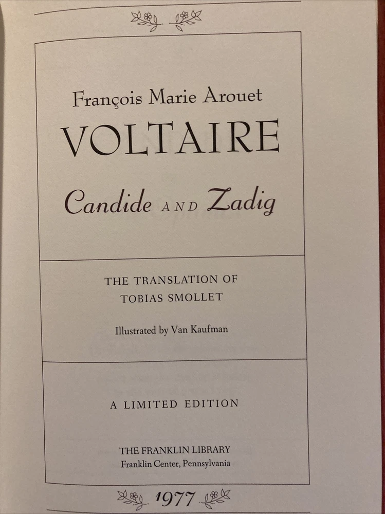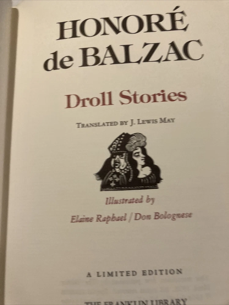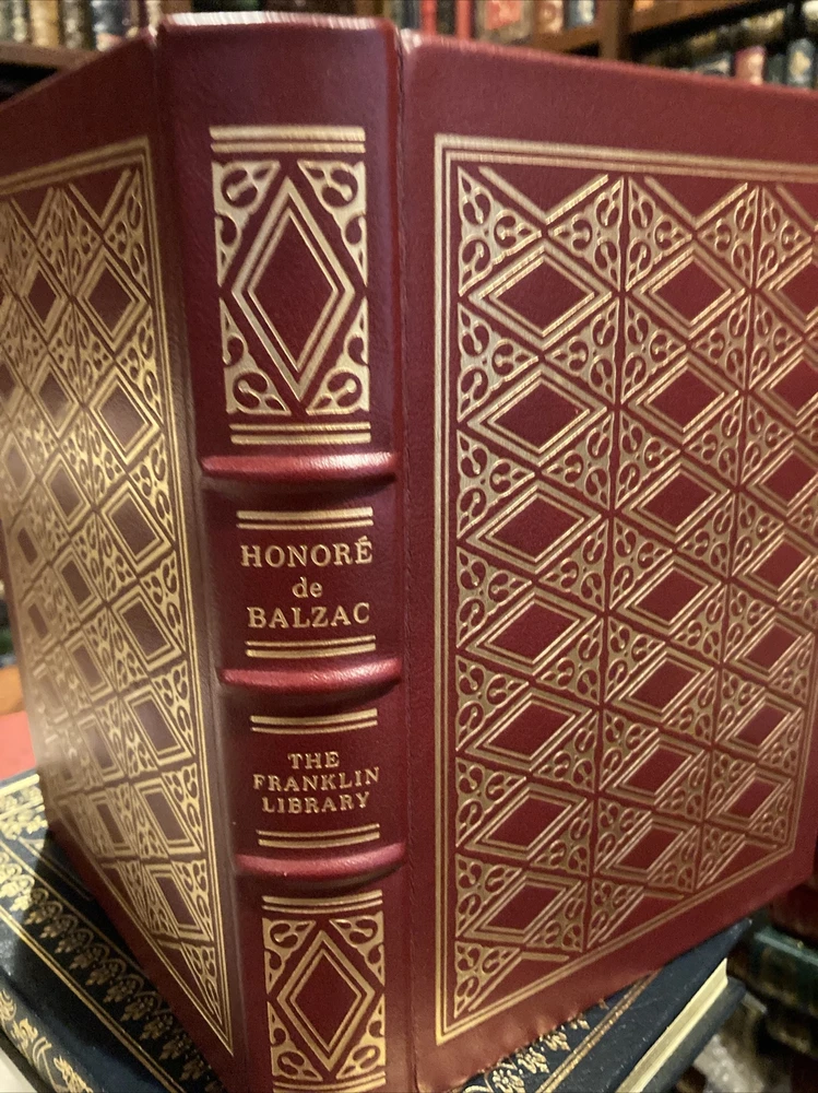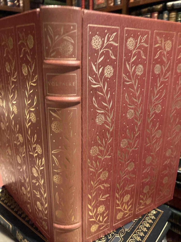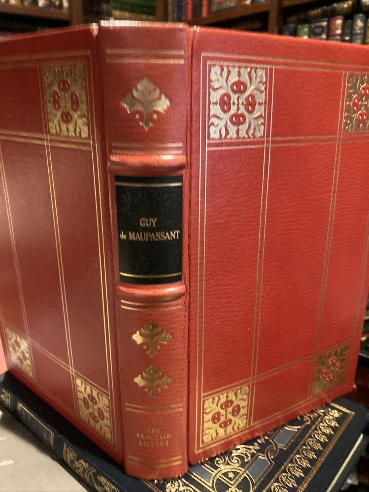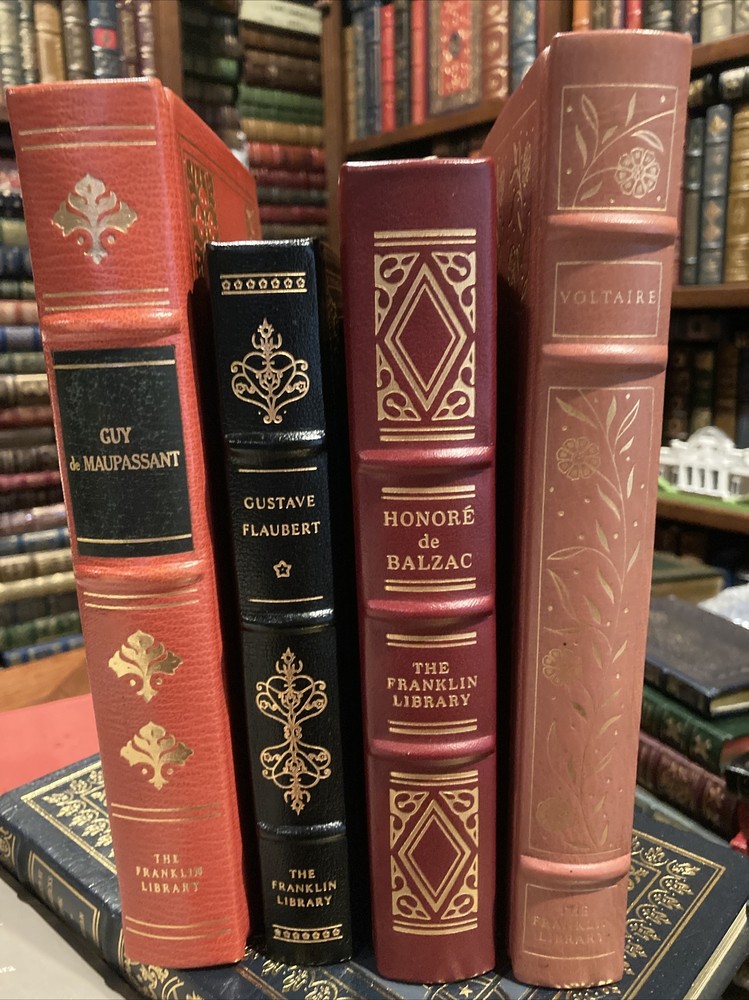Franklin Library leather edition of FOUR FRENCH WRITERS: GUSTAVE Flaubert, HONORE de BALZAC, VOLTAIRE, and GUY de MAUPASSANT----all lived and wrote in the 19th century and all were published as a part of Franklin Library's leather books. Franklin Library leather edition of Gustave Flaubert's "Three Tales," Translated by George Burnham Ives, a Limited edition, one of the COLLECTED STORIES OF THE WORLD'S GREATEST WRITERS series, published in 1981. Bound in navy blue leather, the book has navy blue moire silk end leaves, Satin book marker, hubbed spine, acid-free paper, Symth-sewn binding, gold gilding on three edges---in near FINE condition. The three stories are: "A Simple Heart," "The Legend of St. Julian the Hospitaller," and "Herodias." 199 pages. Franklin Library leather edition of Guy de Maupassant's "Stories," a Limited edition, Illustrated by Lily Harmon, one of the COLLECTED STORIES OF THE WORLD'S GREATEST WRITERS series, published in 1977. Bound in a GORGEOUS scarlet red leather, the book has a hubbed spine, acid-free paper, satin book marker, gold gilding---in FINE condition. 356 pages. Franklin Library leather edition of Honore de Balzac's "Droll Stories," a Limited edition, Translated by J. Lewis May, Illustrated by Elaine Raphael and Don Bolognese, published in 1978. Bound in brown leather, the book has all the "bells and whistles" of the Franklin series---satin book marker, acid-free paper, gold gilt---etc. 424 pages. Franklin Library leather edition of Voltaire's "Candide, or the Optimist and Zadig, a Limited edition, Translated by Tobias Smollet, Illustrated by Van Kaufman, one of the COLLECTED STORIES OF THE WORLD'S GREATEST WRITERS series, published in 1977. Bound in brick red leather, the book has burgundy moire silk end leaves, gold gilding, satin book marker, etc. 255 pages. I offer Combined shipping.