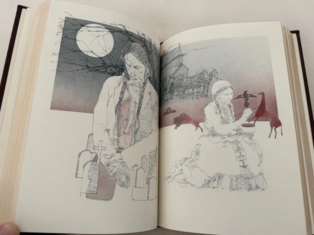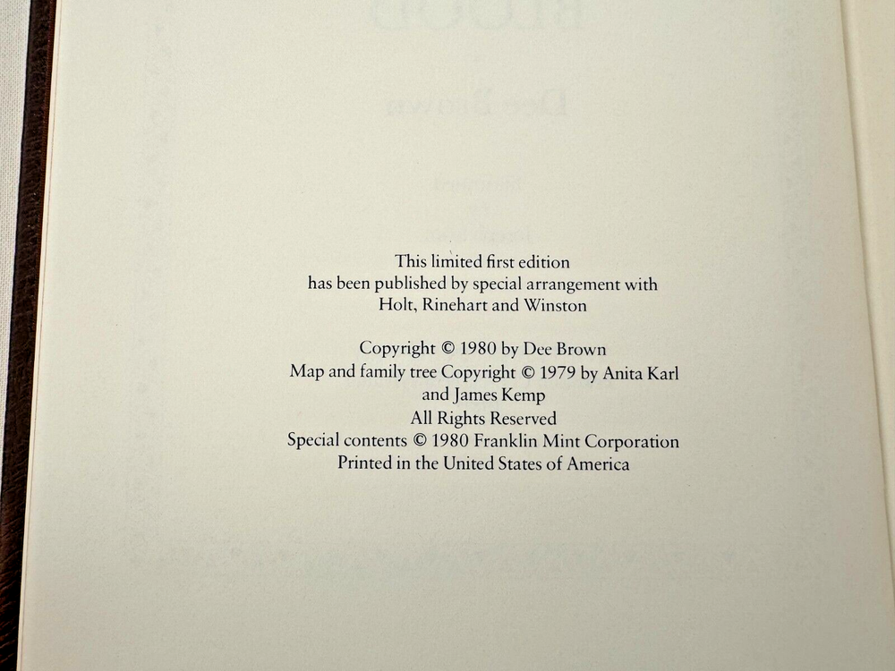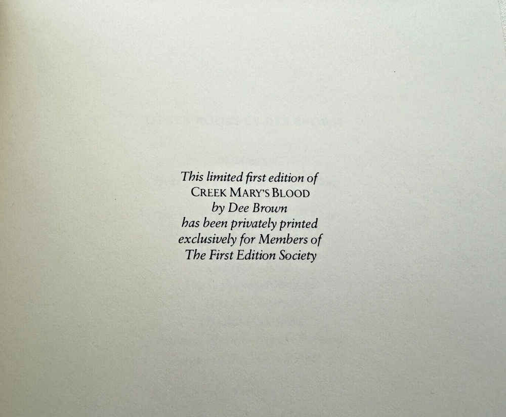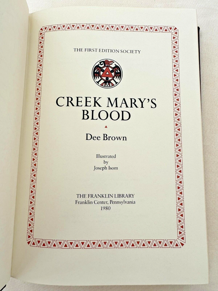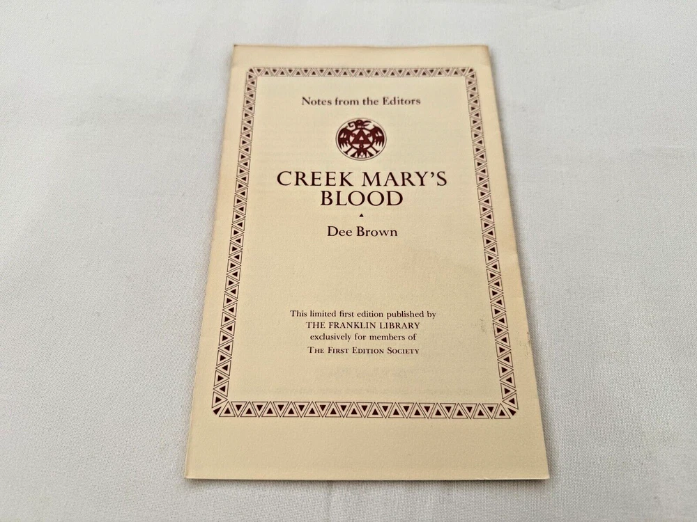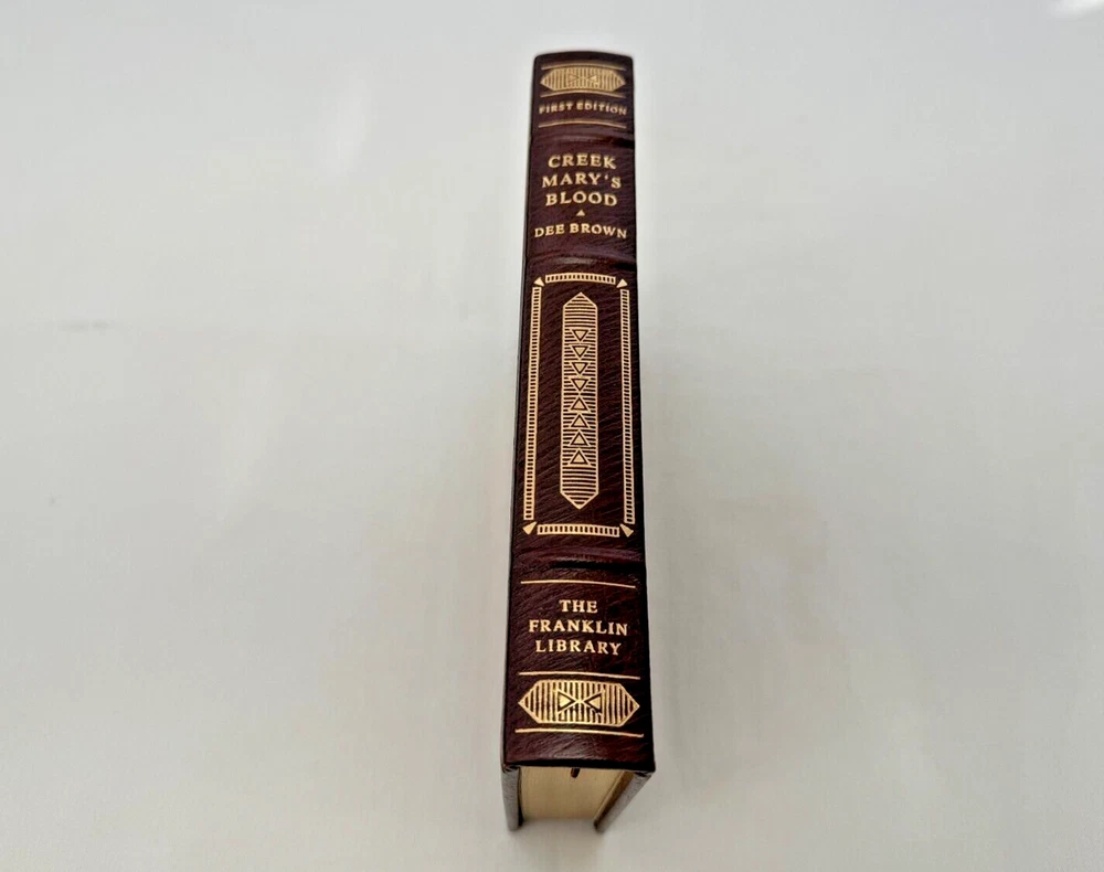 From the Franklin Library First Edition Society Collection... Creek Mary's Blood by Dee Brown Illustrated by Joseph Isom Copyright 1980 by The Franklin Library A Limited Edition Premium Full Leather Binding This volume contains all of these classic Franklin Library trimmings: Premium Leather Binding Silk Moire Endleaves Distinctive Cover Design Hubbed Spine, Accented in Gold Satin Ribbon Page Marker Gilded Page Edges Long-lasting, High Quality Acid-neutral Paper Beautiful Illustrations A very scarce title in any condition, this 1980 Limited First Edition is in Absolute Mint and Unread condition. The front and back covers are in Perfect condition and the gilded page edges show no wear at all! The binding is tight and square without spine lean. There are no markings, bookplates, or other signs of prior ownership in this book. This book is part of the First Edition Society collection published by the Franklin Library and comes complete with the Notes from the Editors. It would be a beautiful addition to your Franklin Library book collection. Overall, this copy is a grade collector's book. This book is very elusive in this superior condition, as only a limited number of them were ever published, so now is the time to act. Hopefully you can add this book to your collection and enjoy it in the years to come... Please Email Me With Any Questions You Might Have! Shipping Info: Buyer to Pay Shipping and Handling International Bidders Pay Extra Shipping Good luck and happy bidding!