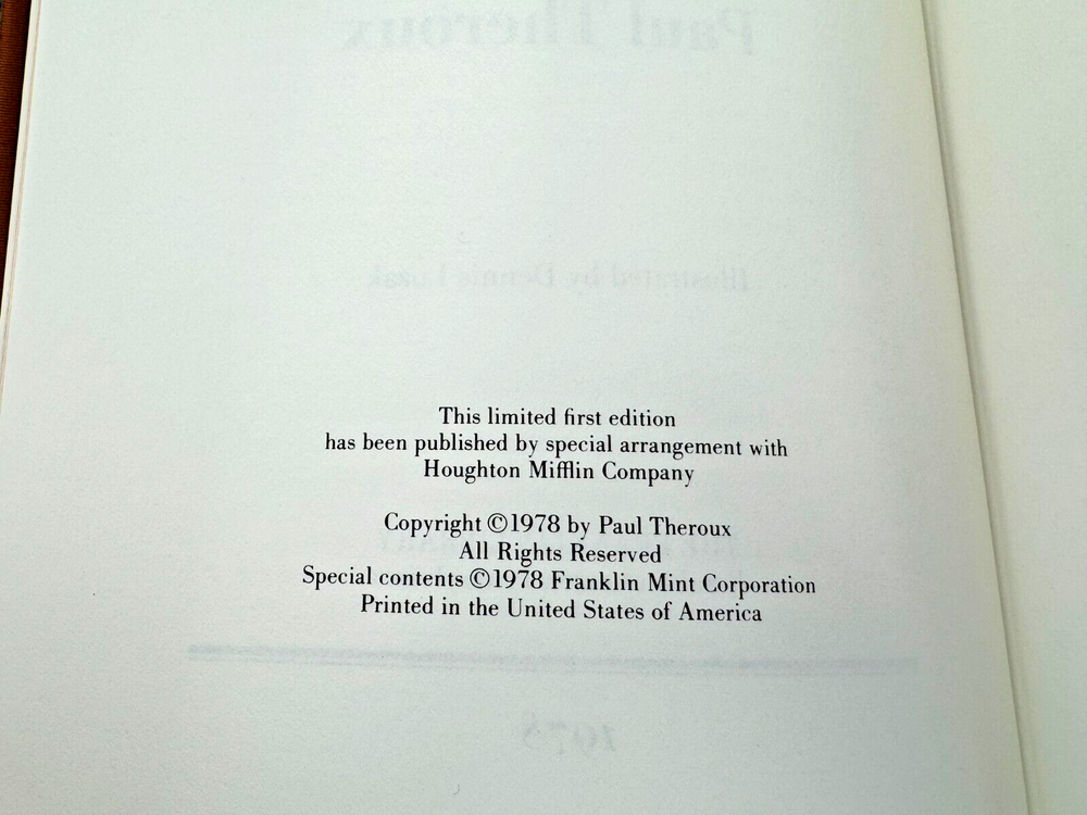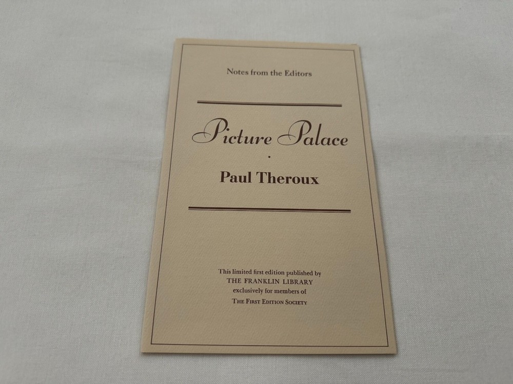 From the Franklin Library First Edition Society Collection... Picture Palace by Paul Theroux Illustrated by Dennis Luzak Copyright 1978 by The Franklin Library A Limited Edition Premium Full Leather Binding This volume contains all of these classic Franklin Library trimmings: Premium Leather Binding Silk Moire Endleaves Distinctive Cover Design Hubbed Spine, Accented in Gold Satin Ribbon Page Marker Gilded Page Edges Long-lasting, High Quality Acid-neutral Paper Beautiful Illustrations A very scarce title in any condition, this 1978 Limited First Edition is in Absolute Mint and Unread condition. The front and back covers are in near Perfect condition and the gilded page edges show no wear at all! The binding is tight and square without spine lean. There are no markings, bookplates, or other signs of prior ownership in this book. This book is part of the First Edition Society collection published by the Franklin Library and comes complete with the Notes from the Editors. It would be a beautiful addition to your Franklin Library book collection. Overall, this copy is a grade collector's book. This book is very elusive in this superior condition, as only a limited number of them were ever published, so now is the time to act. Hopefully you can add this book to your collection and enjoy it in the years to come... Please Email Me With Any Questions You Might Have! Shipping Info: Buyer to Pay Shipping and Handling International Bidders Pay Extra Shipping Good luck and happy bidding!
