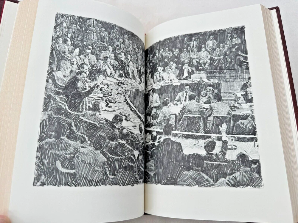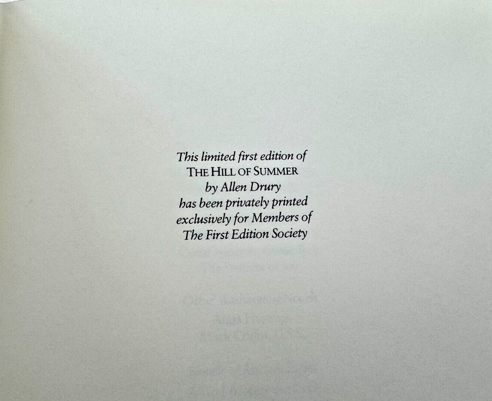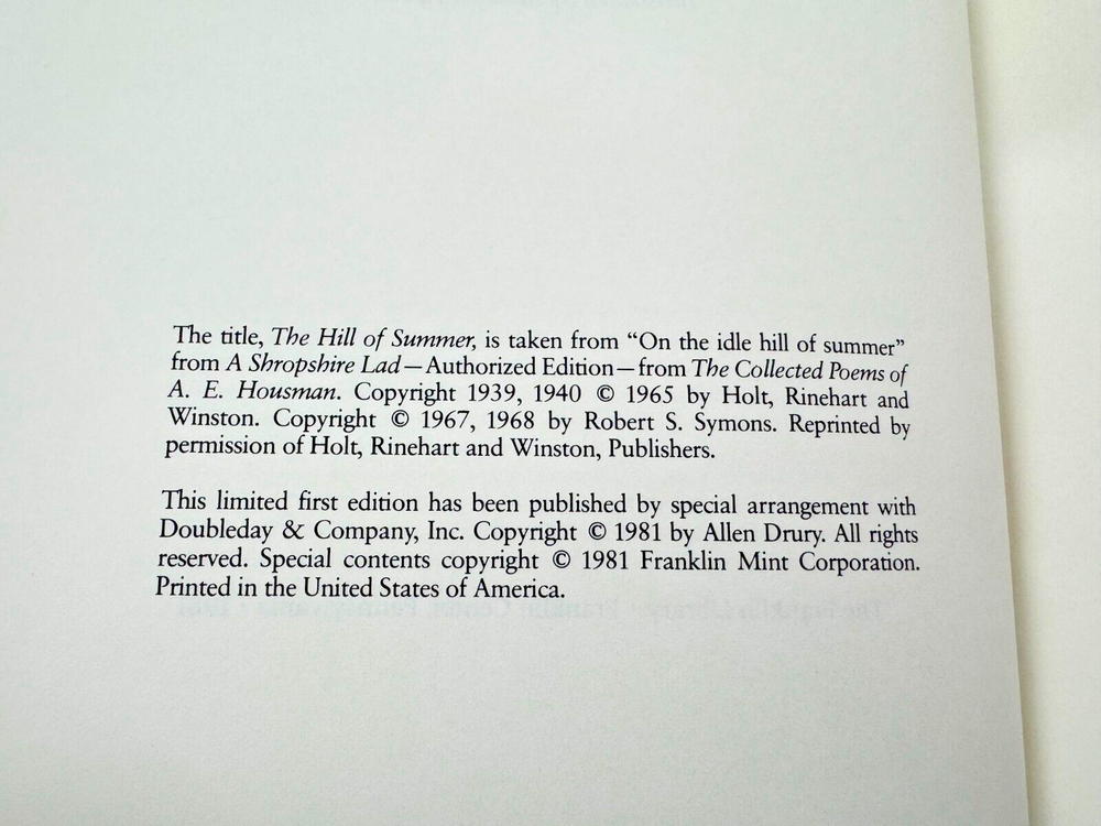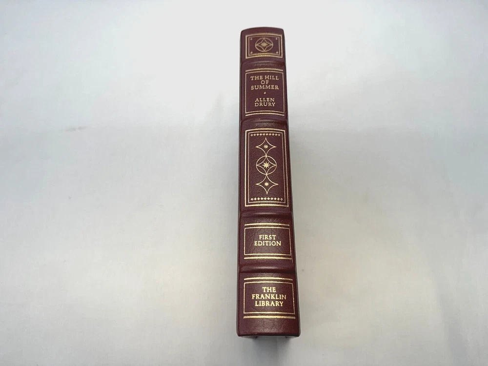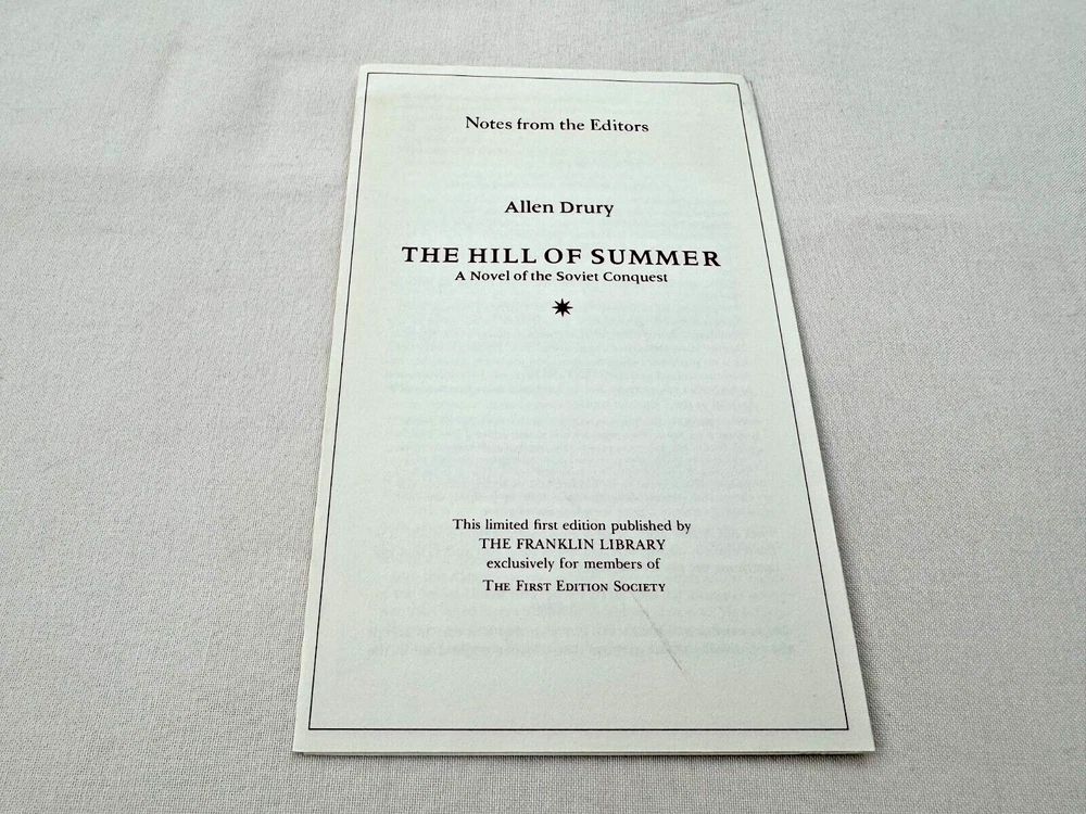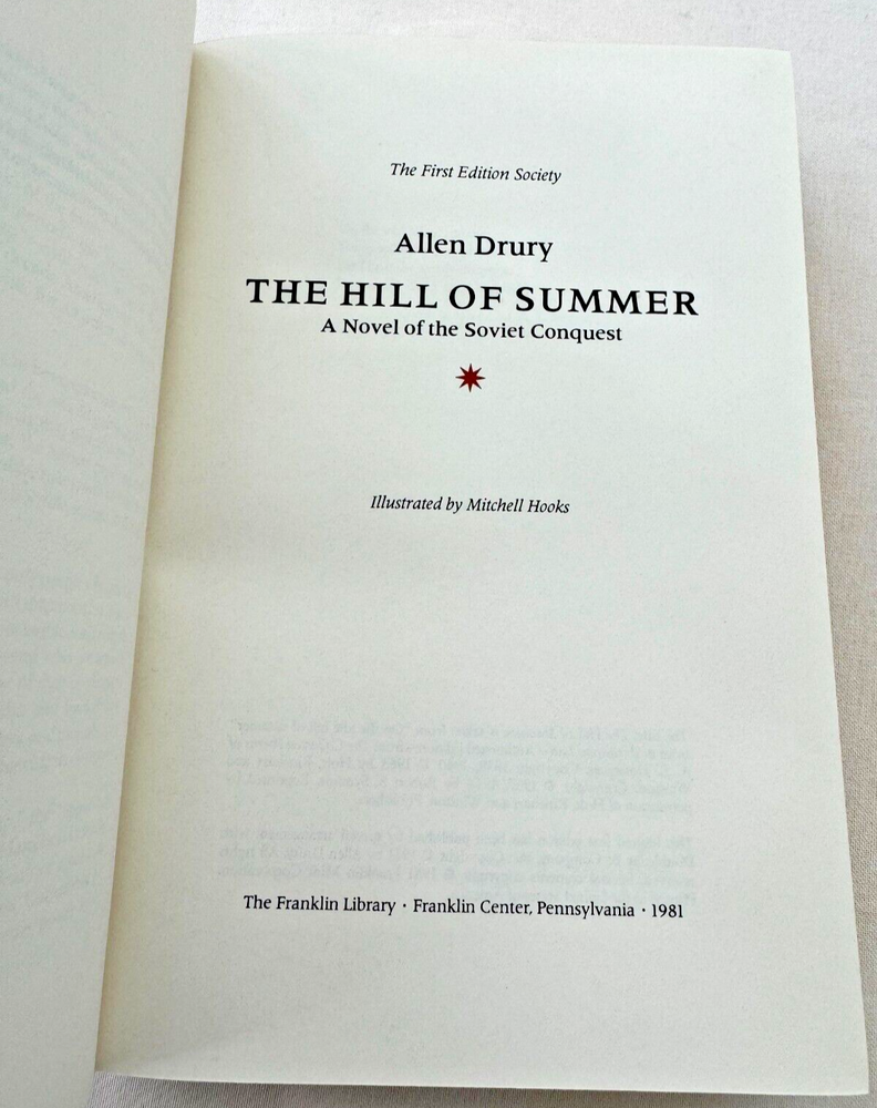From the Franklin Library First Edition Society Collection... The Hill of Summer a Novel of the Soviet Conquest by Allen Drury Illustrated by Mitchell Hooks Copyright 1981 by The Franklin Library A Limited Edition Premium Full Leather Binding This volume contains all of these classic Franklin Library trimmings: Premium Leather Binding Silk Moire Endleaves Distinctive Cover Design Hubbed Spine, Accented in Gold Satin Ribbon Page Marker Gilded Page Edges Long-lasting, High Quality Acid-neutral Paper Beautiful Illustrations A very scarce title in any condition, this 1981 Limited First Edition is in near Mint and Unread condition. The front and back covers are in near Perfect condition with minor rubbing to the bottom and top board edges and the gilded page edges show no wear at all! The binding is tight and square without spine lean. There are no markings, bookplates, or other signs of prior ownership in this book. This book is part of the First Edition Society collection published by the Franklin Library and comes complete with the Notes from the Editors. It would be a beautiful addition to your Franklin Library book collection. Overall, this copy is a grade collector's book. This book is very elusive in this superior condition, as only a limited number of them were ever published, so now is the time to act. Hopefully you can add this book to your collection and enjoy it in the years to come... Please Email Me With Any Questions You Might Have! Shipping Info: Buyer to Pay Shipping and Handling International Bidders Pay Extra Shipping Good luck and happy bidding!