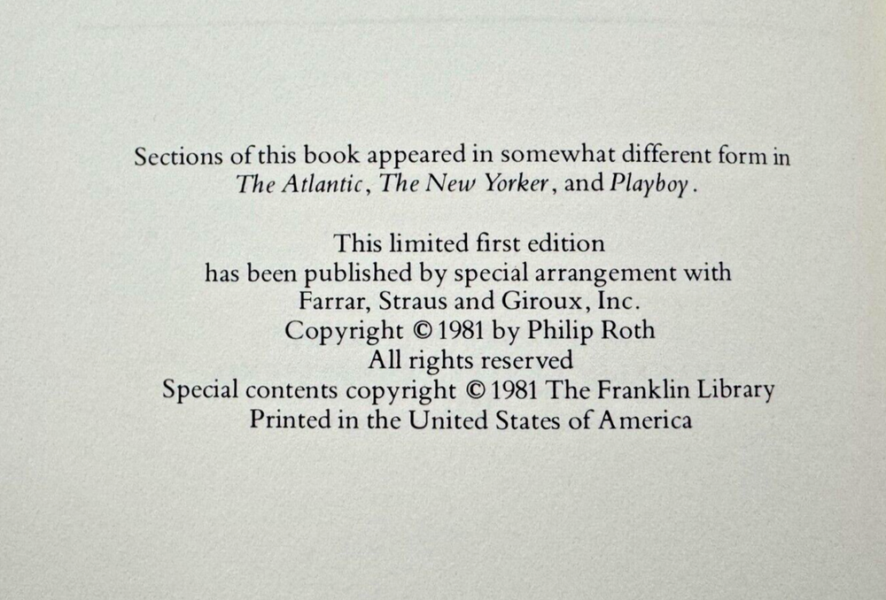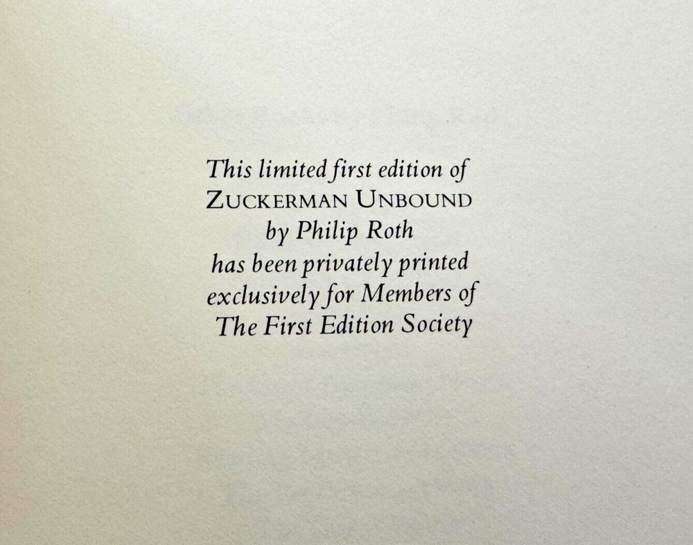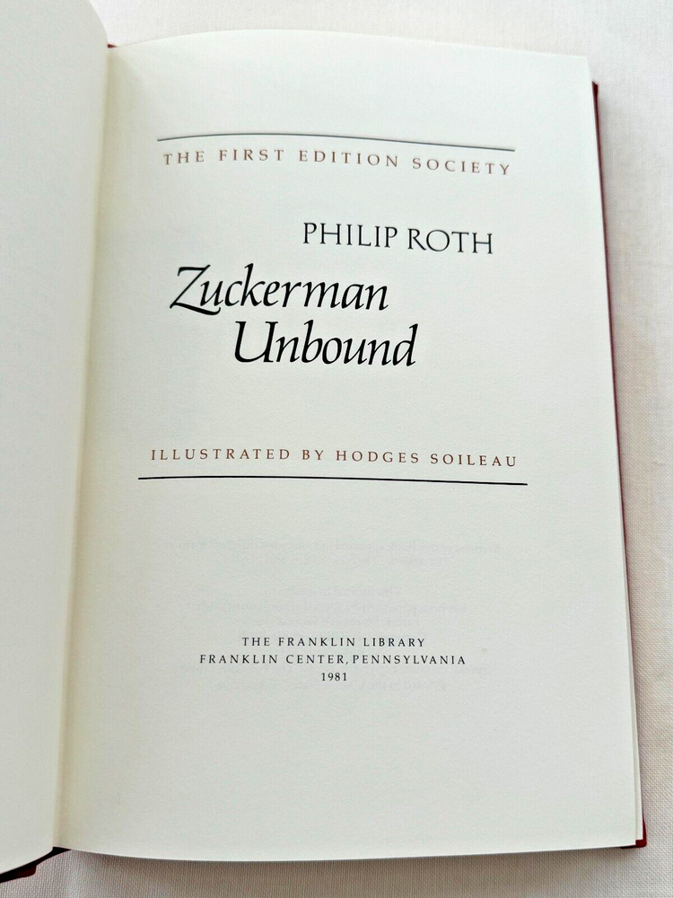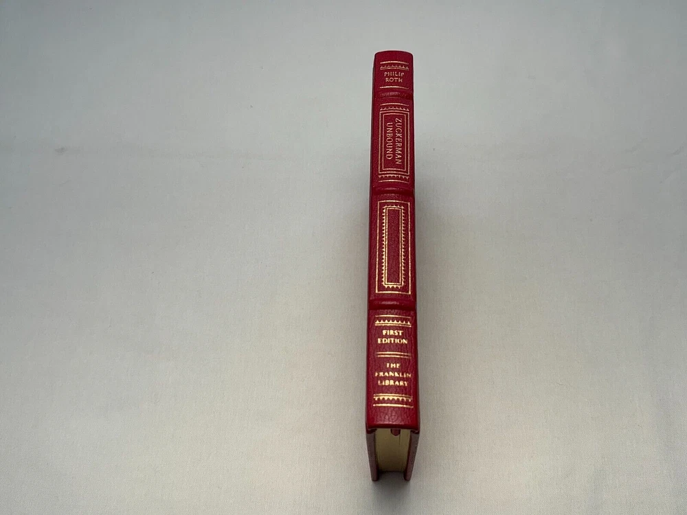 From the Franklin Library First Edition Society Collection... Zuckerman Unbound by Philip Roth Illustrated by Hodges Soileau Copyright 1981 by The Franklin Library A Limited Edition Premium Full Leather Binding This volume contains all of these classic Franklin Library trimmings: Premium Leather Binding Silk Moire Endleaves Distinctive Cover Design Hubbed Spine, Accented in Gold Satin Ribbon Page Marker Gilded Page Edges Long-lasting, High Quality Acid-neutral Paper Beautiful Illustrations A very scarce title in any condition, this 1981 Limited First Edition is in Absolute Mint and Unread condition. The front and back covers are in Perfect condition and the gilded page edges show no wear at all! The binding is tight and square without spine lean. There are no markings, bookplates, or other signs of prior ownership in this book. This book is part of the First Edition Society collection published by the Franklin Library and comes complete with the Notes from the Editors. It would be a beautiful addition to your Franklin Library book collection. Overall, this copy is a grade collector's book. This book is very elusive in this superior condition, as only a limited number of them were ever published, so now is the time to act. Hopefully you can add this book to your collection and enjoy it in the years to come... Please Email Me With Any Questions You Might Have! Shipping Info: Buyer to Pay Shipping and Handling International Bidders Pay Extra Shipping Good luck and happy bidding!