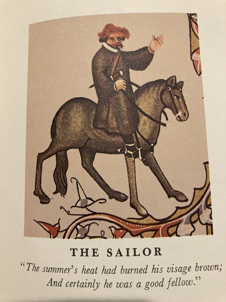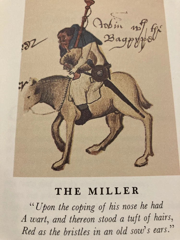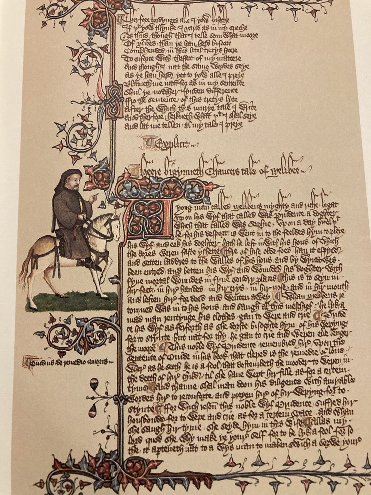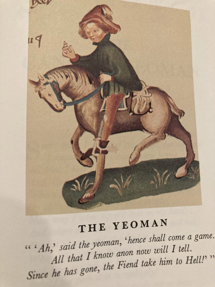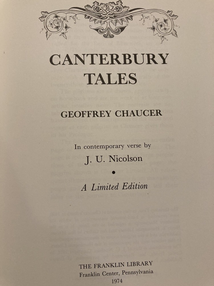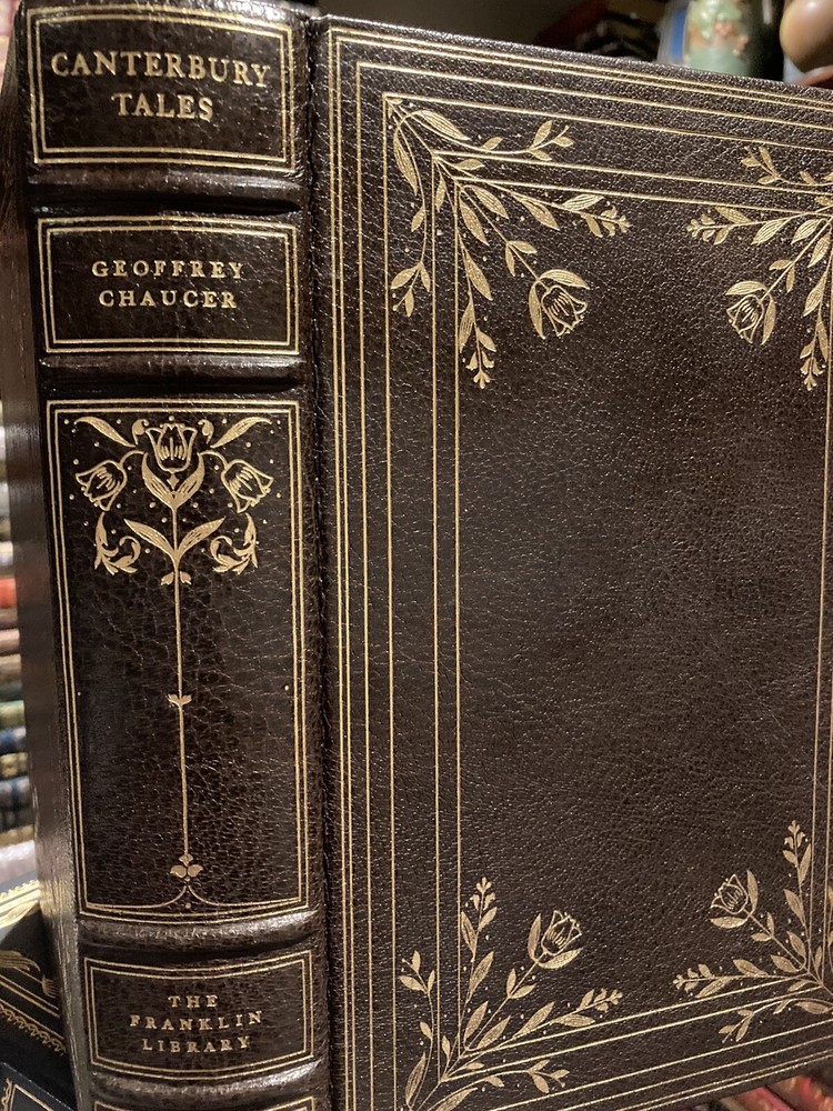 Franklin Library leather edition of Geoffrey Chaucer's "Canterbury Tales," In contemporary verse by J.U. Nicholaon, Illustrated with hand-lettered Ellesmere Manuscript as they existed in 1400, a Limited edition, one of the 100 GREATEST BOOKS OF ALL TIME series, published in 1974. Bound in hunter green leather, the book has orange French moire silk end leaves, acid-free paper, Symth-sewn binding, hubbed spine, a satin book marker, gold gilding on three edges--in near FINE condition---except the satin book marker is shorter than usual. Geoffrey Chaucer, who lived from 1345-1400, the son of John Chaucer, was married Philippa and lived around nobility all his life. When he died, he was buried in Westminister Abbey, the first POET in what is now known as the "Poet's corner." "The Canterbury Tales" is a collection of over 20 stories written in Middle English. The tales are presented as part of a story-telling contest by a group of pilgrims as they travel together on a journey from the Southwark Inn in London to the shrine of Saint Thomas Becket at Canterbury Cathedral. [Beckett was murdered in 1170 inside the Cathedral.] Chaucer uses the tales and the descriptions of its characters to paint an ironic and critical portrait of English society at the time, and particularly of the Church. The reader will meet the memorable characters: The Monk, the Friar, the busy lawyer---or "so he seems," Nuns, the Summoner, the Squire---who has returned from the Holy Land while serving his father---the noble Knight; the Oxford clerk--or student---more interested in books and literature than horses, clothes, or fine food; his motto is: "gladly would he learn and gladly would he teach; the Cook---who is working for the 'Guildsmen,'---the weaver, the dyer, the carpenter, the haberdasher, and the candle maker; the Miller---who grinds corn and cheats with his 'wicked thumb' on the scales; his filthy tale of sexual indulgences and revenge begins a series of "love or sexual tales"; the 'greedy' Pardoner---who misuses his position by selling " sexual indulgences" and fake artifacts such as cloth he claims came from Christ's; the Wife of Bath---who joyfully admits she likes sex, has been married five times and enjoys going on holidays to visit Christian shrines---she has the men laughing and enjoying her prologue about what "women want most"; she blames her sexy nature on her star: Venus and her mean streak on Mars; the Reeve, the Merchant, the wealthy Franklin; the physician---who is more interested in his 'fee' than in healing his patients, the Prioress---prim and proper but somewhat a fake, especially with her fake French accent; the Monk, the lowly Parson---a fine man who visits all his parish---poor as well as rich; and the Knight---a fine man who has returned from fighting the 'infidels' in the Holy Land---all the classes of English society of the fourteenth century---except the nobility. 634 pages. I offer Combined shipping.