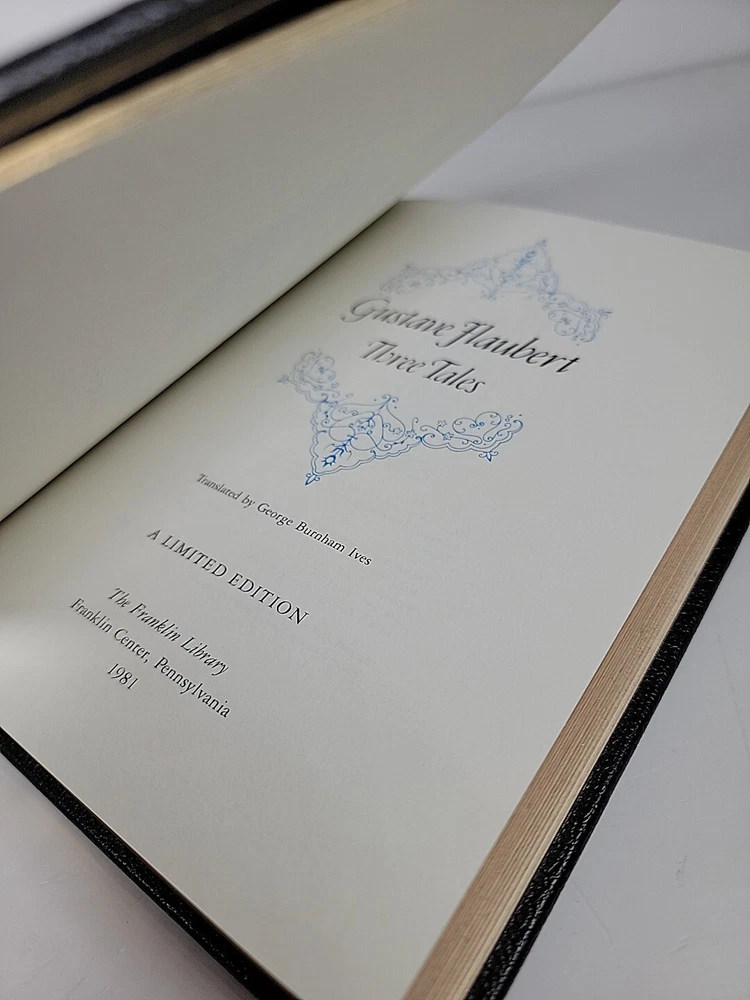 This stunning Franklin Library edition of Gustave Flaubert’s *Three Stories* is a true collector’s gem! The book is in pristine, like-new condition—no markings, no wear, just flawless craftsmanship. The gold-trimmed pages and elegant leather binding make it a beautiful addition to any library. A must-have for Flaubert fans and lovers of fine literature!